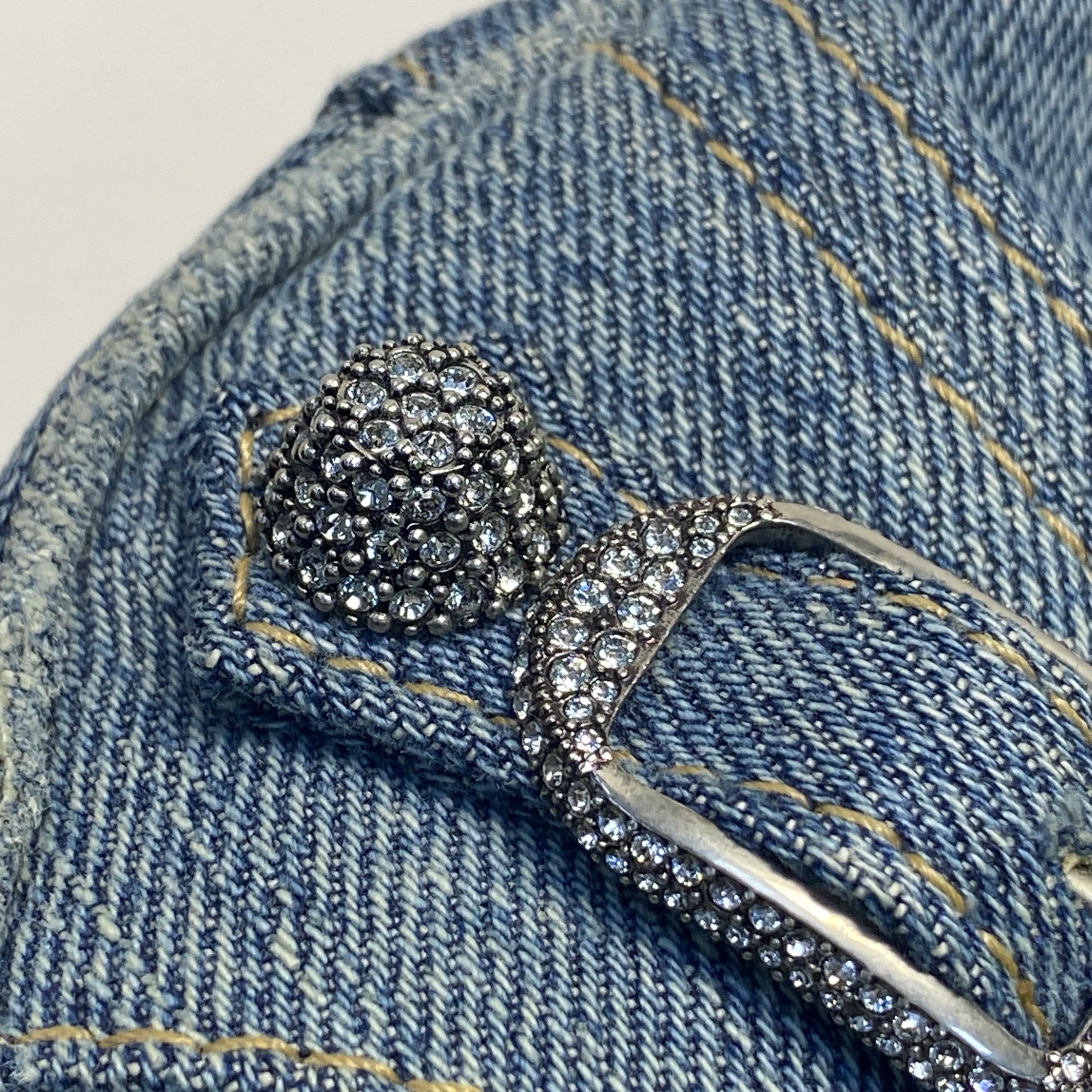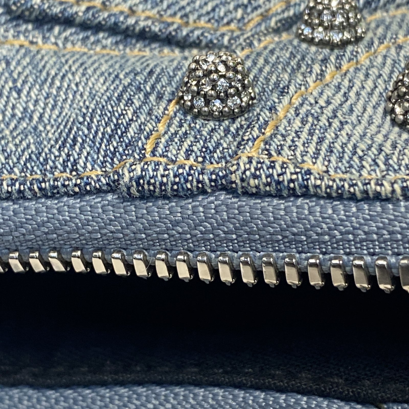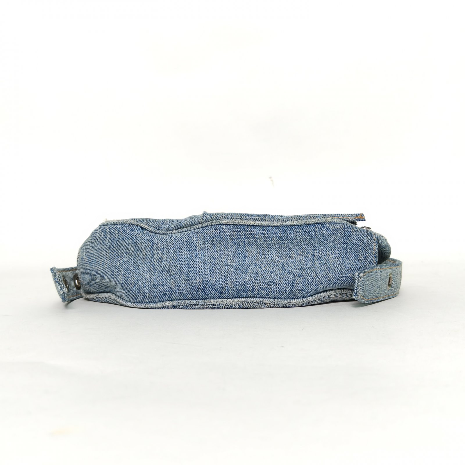 Embodying a edgy and modern luxury shoulder bag, the Balenciaga Le Cagole XS is crafted from denim blue fabric with a slouchy silhouette and polished hardware. The detachable shoulder strap and mirror accessory make it a versatile statement piece.