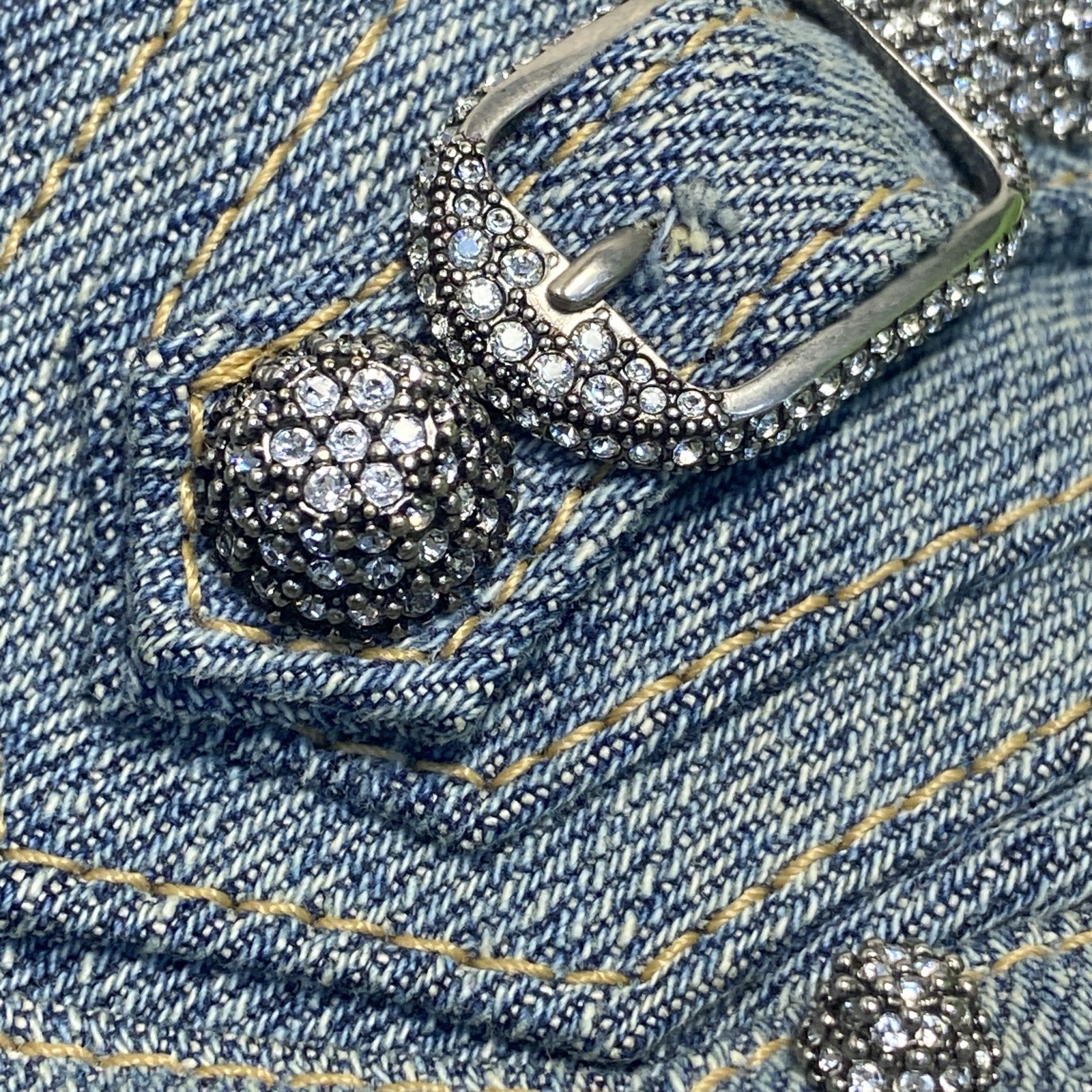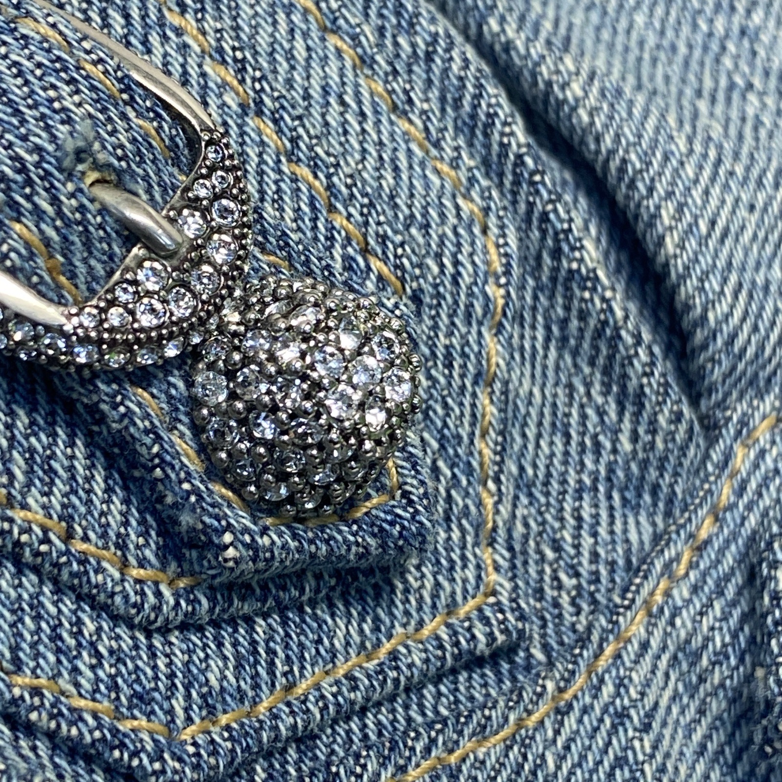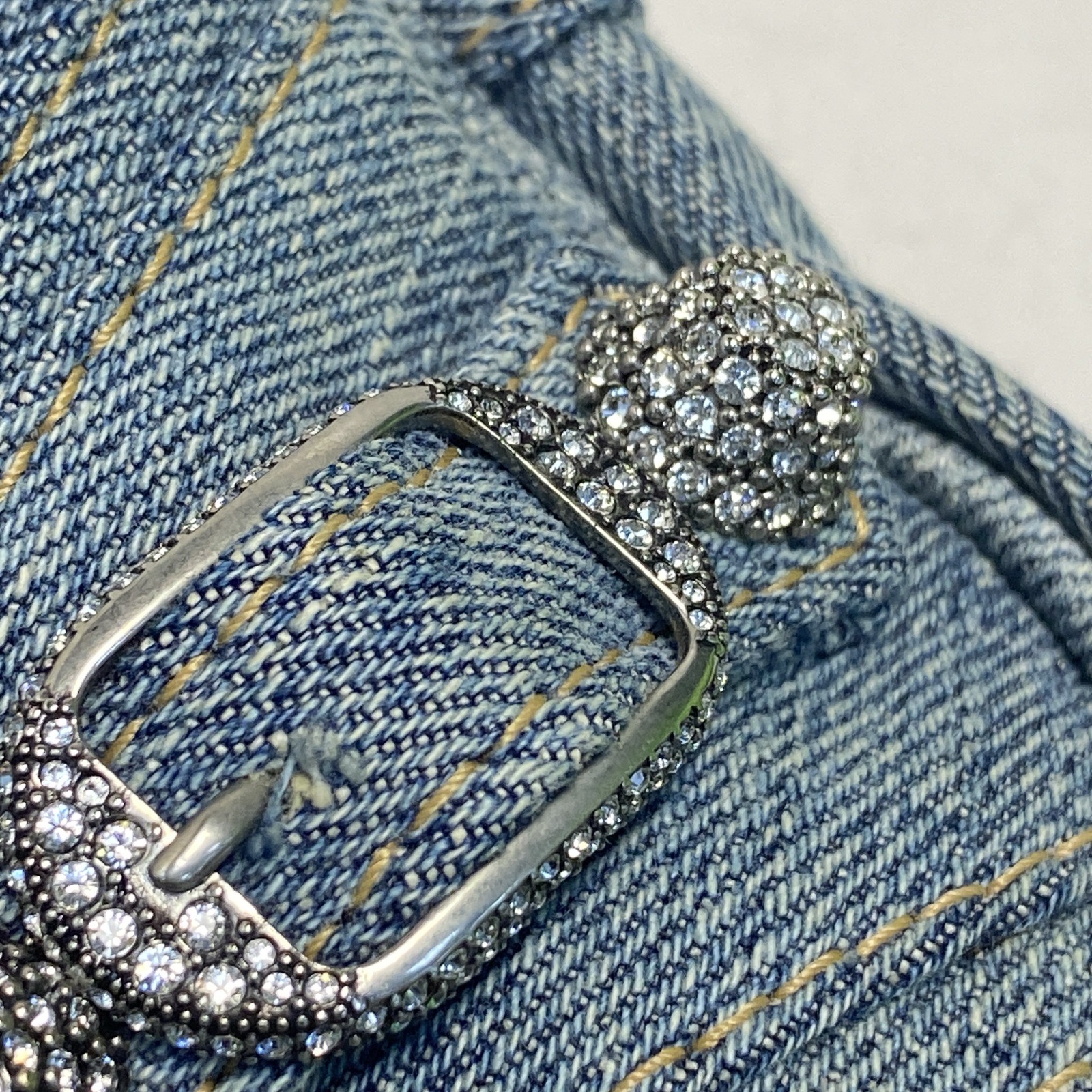 Embodying a edgy and modern luxury shoulder bag, the Balenciaga Le Cagole XS is crafted from denim blue fabric with a slouchy silhouette and polished hardware. The detachable shoulder strap and mirror accessory make it a versatile statement piece.