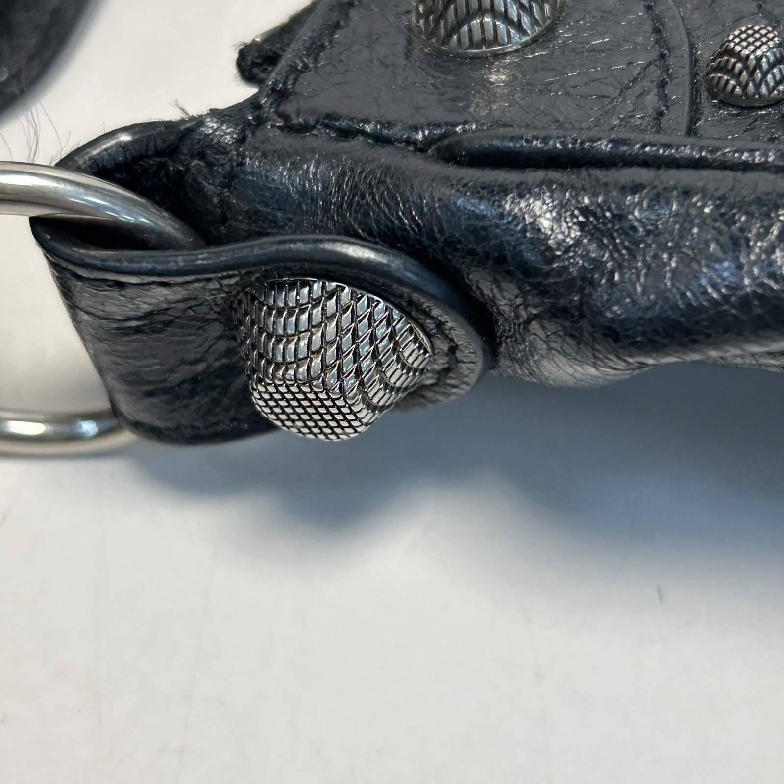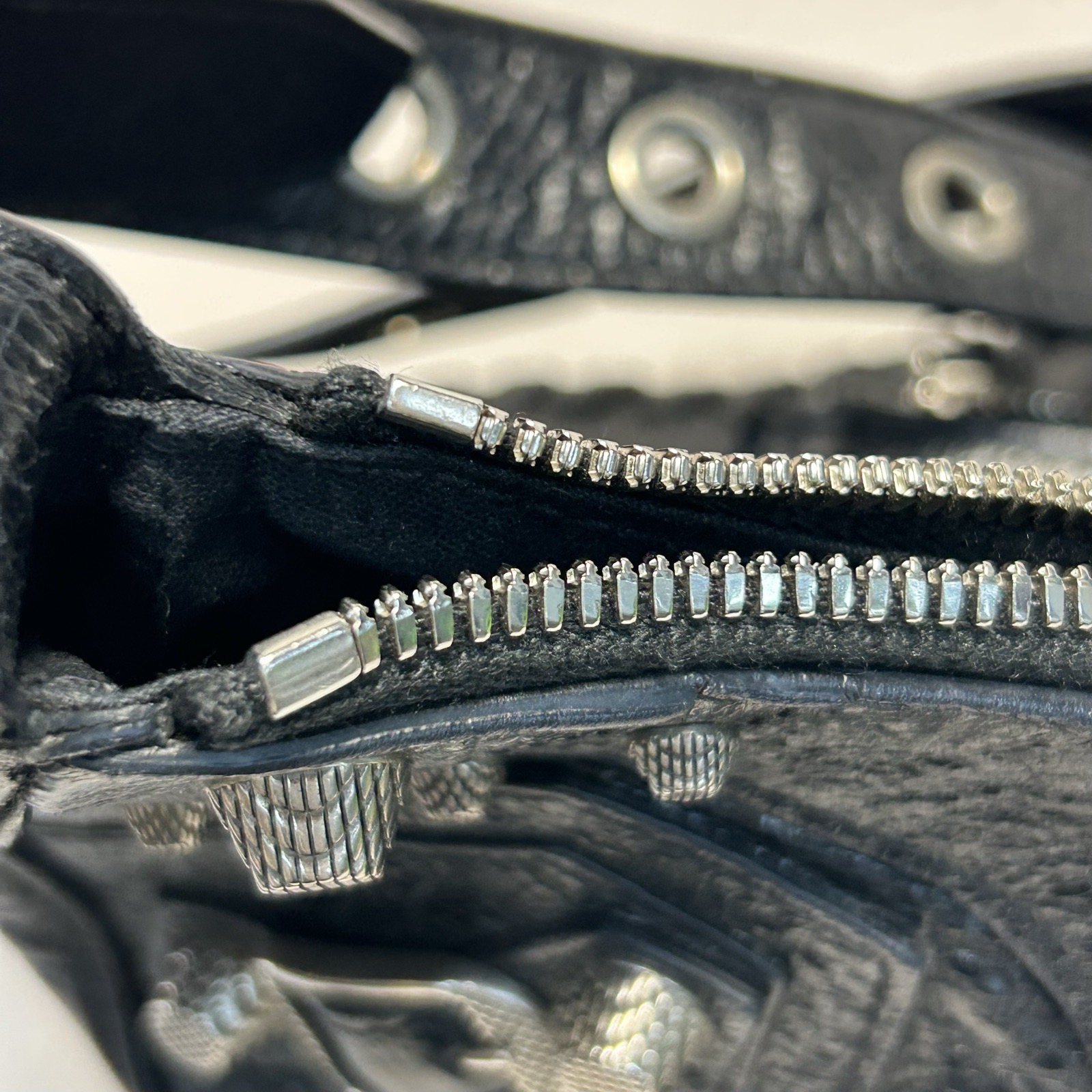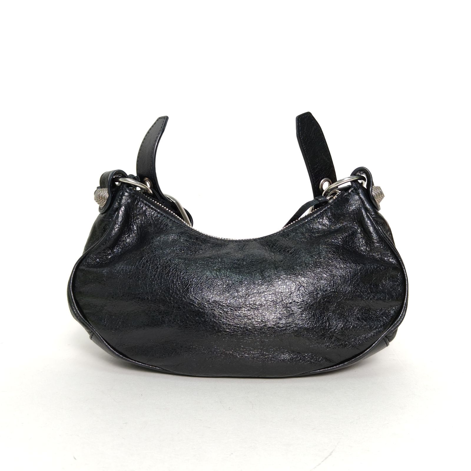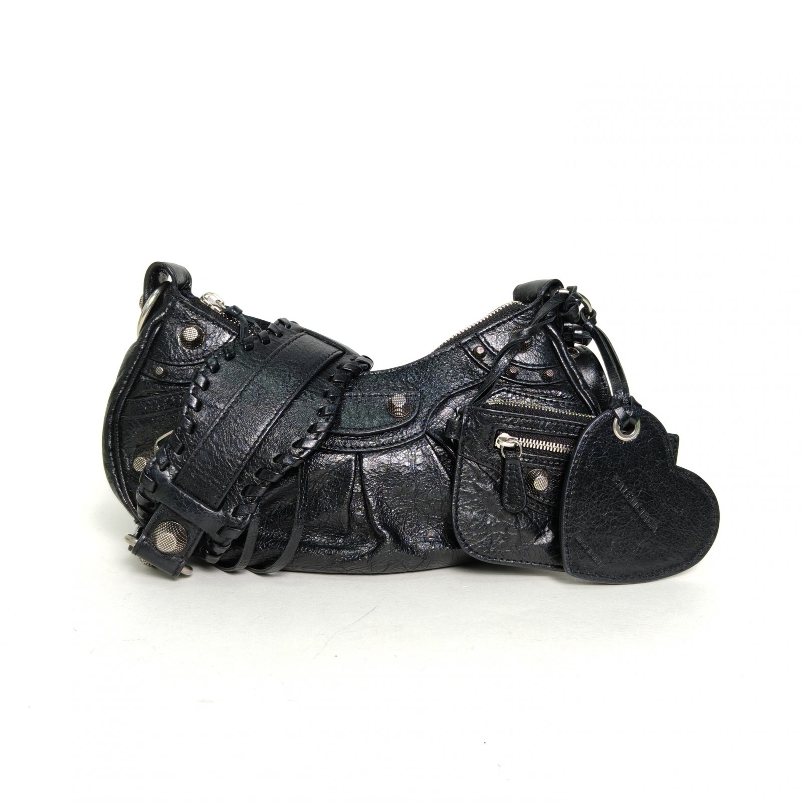 Made from black shiny leather with studded details and chain accents, this Le Cagole XS features a curved silhouette and multiple zippers, embodying Balenciaga’s edgy, deconstructed style.