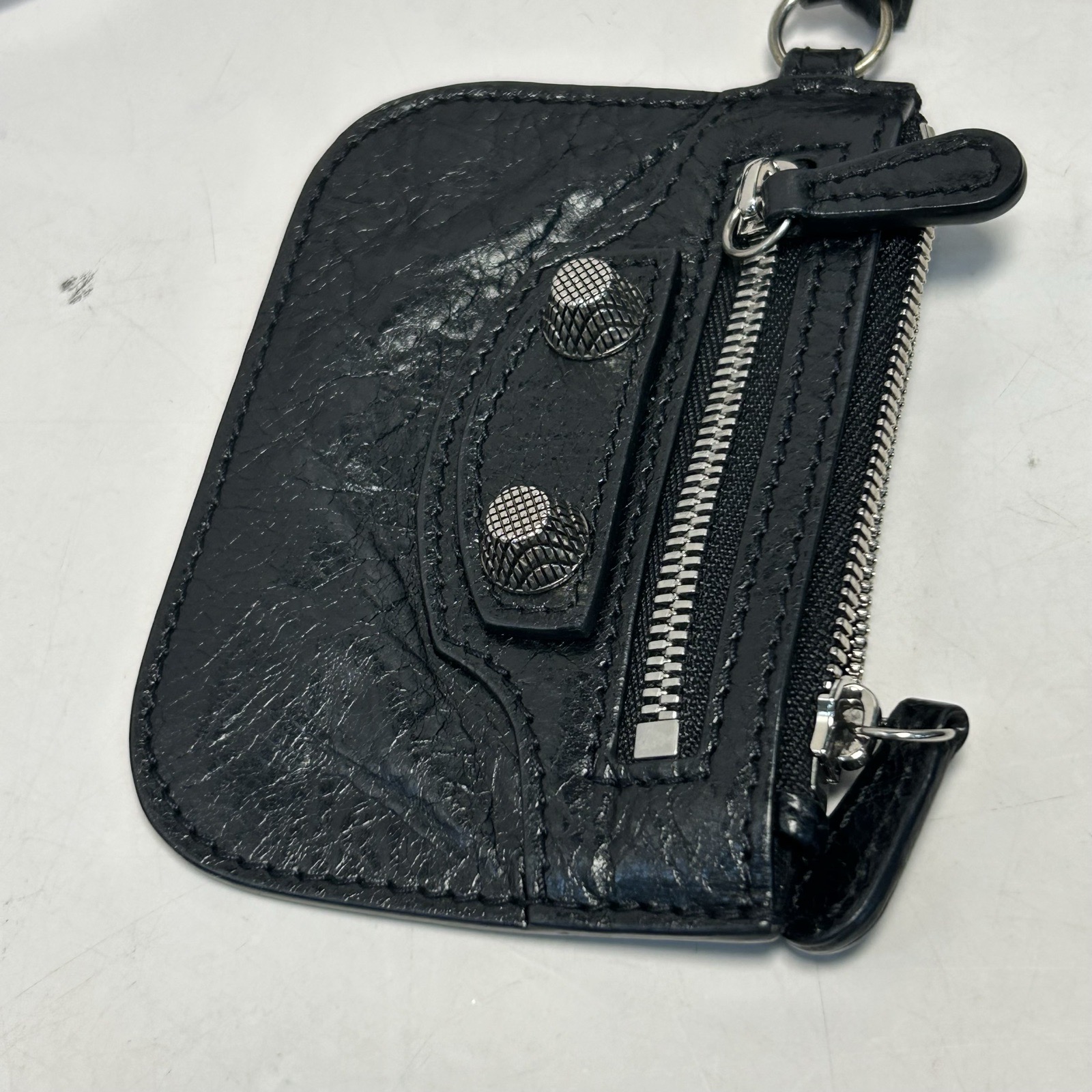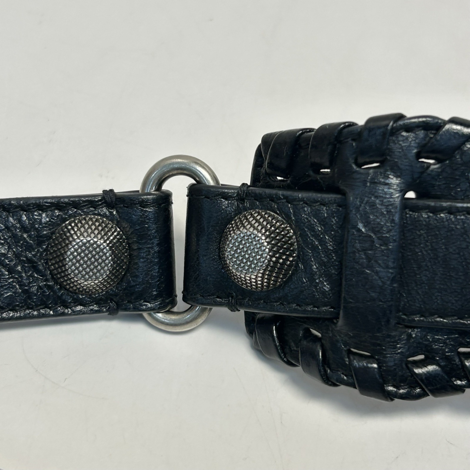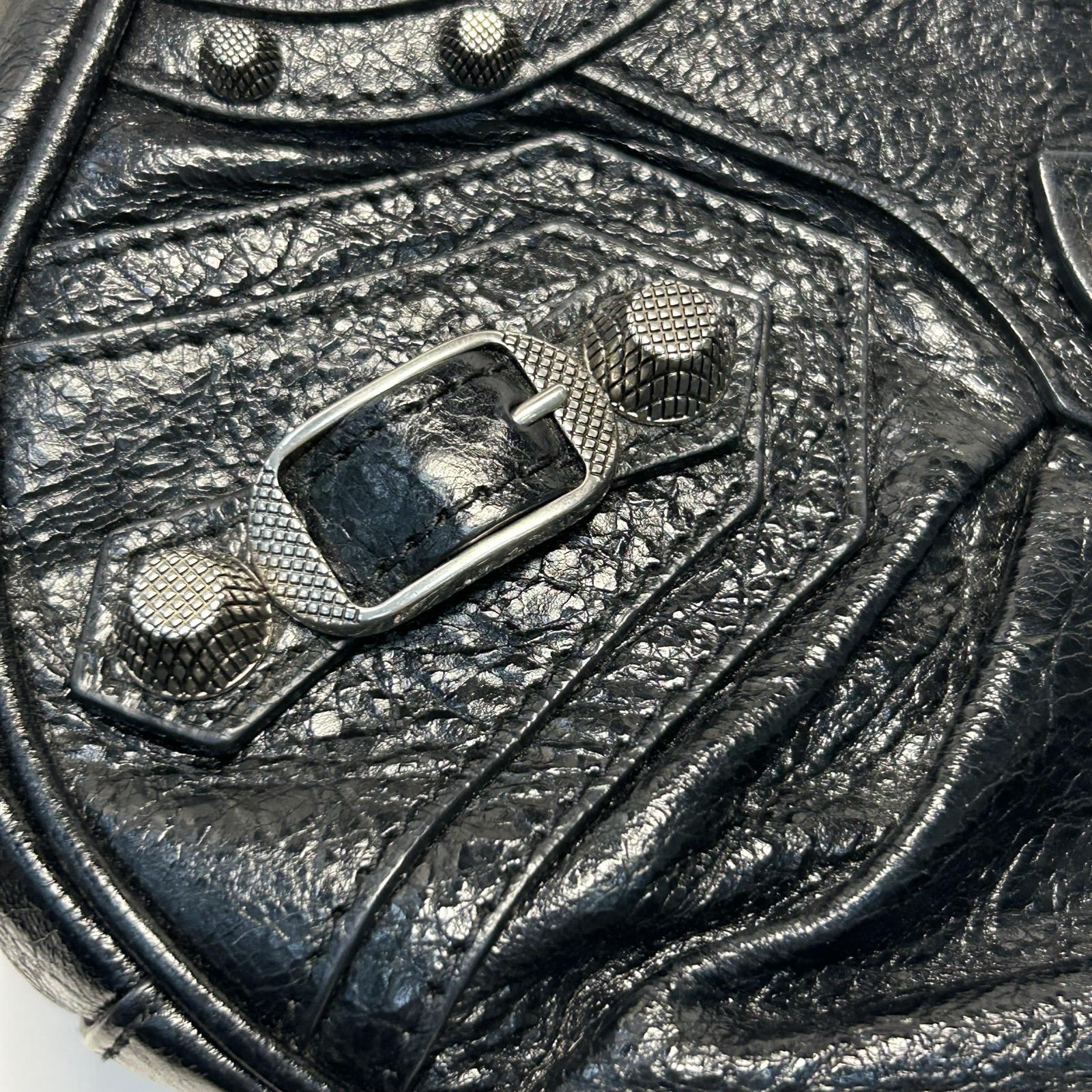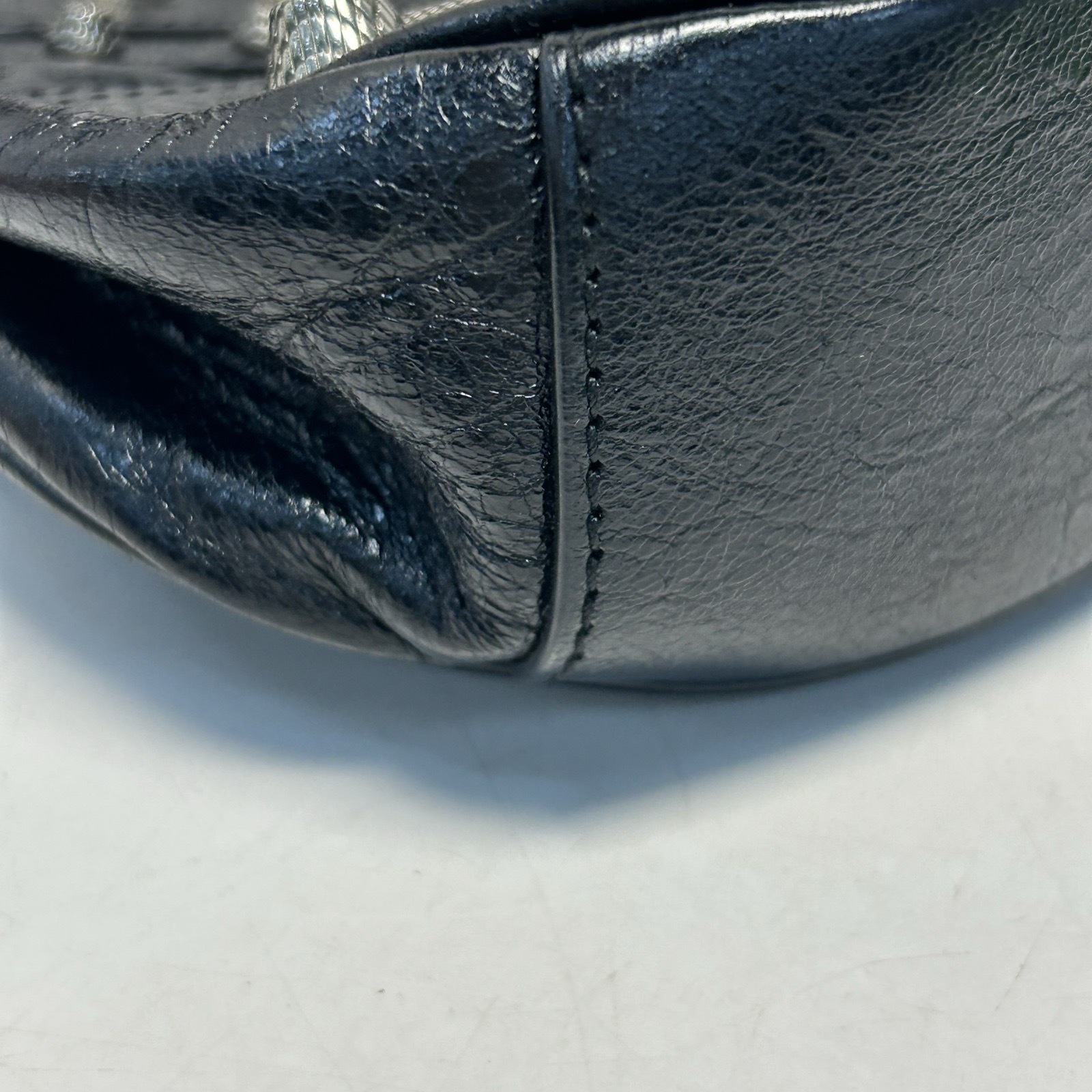Made from black shiny leather with studded details and chain accents, this Le Cagole XS features a curved silhouette and multiple zippers, embodying Balenciaga’s edgy, deconstructed style.