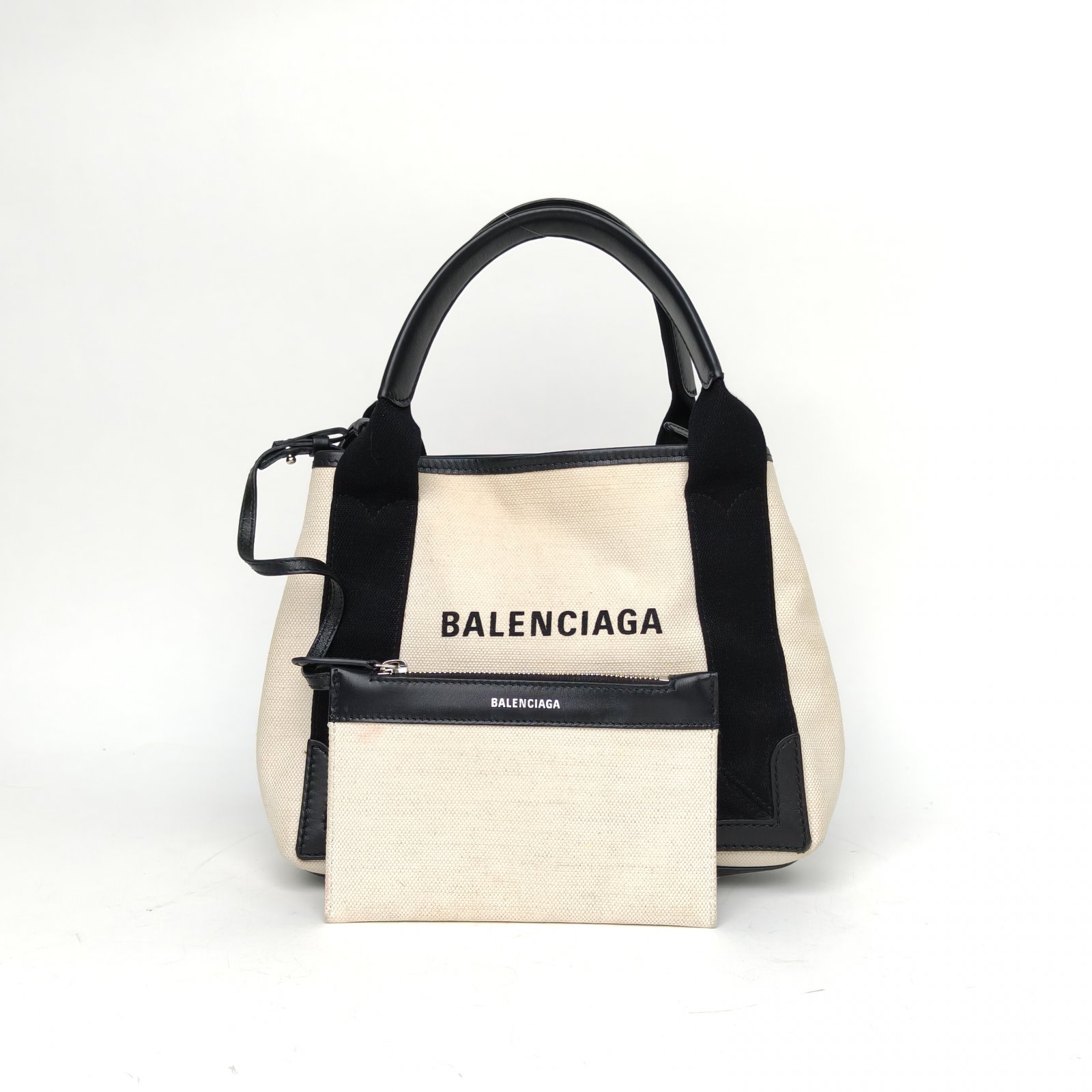 Embodying a minimalist and edgy luxury tote bag, the Balenciaga Navy Cabas XS is crafted from black and white canvas with a structured silhouette. The detachable shoulder strap and pouch make it a versatile accessory.