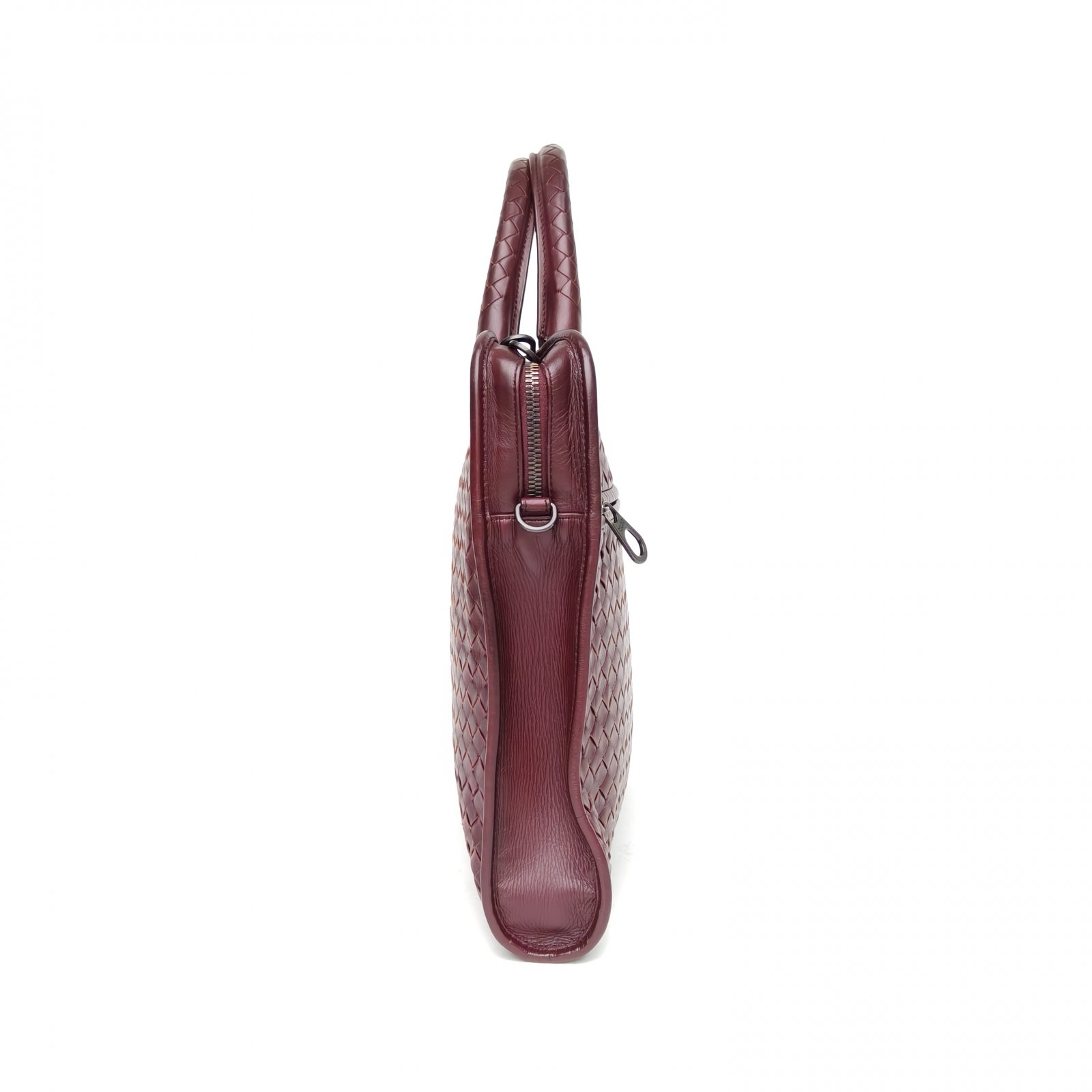 This Bottega Veneta briefcase is crafted from burgundy leather with signature intrecciato weaving, featuring a spacious silhouette and top handles.