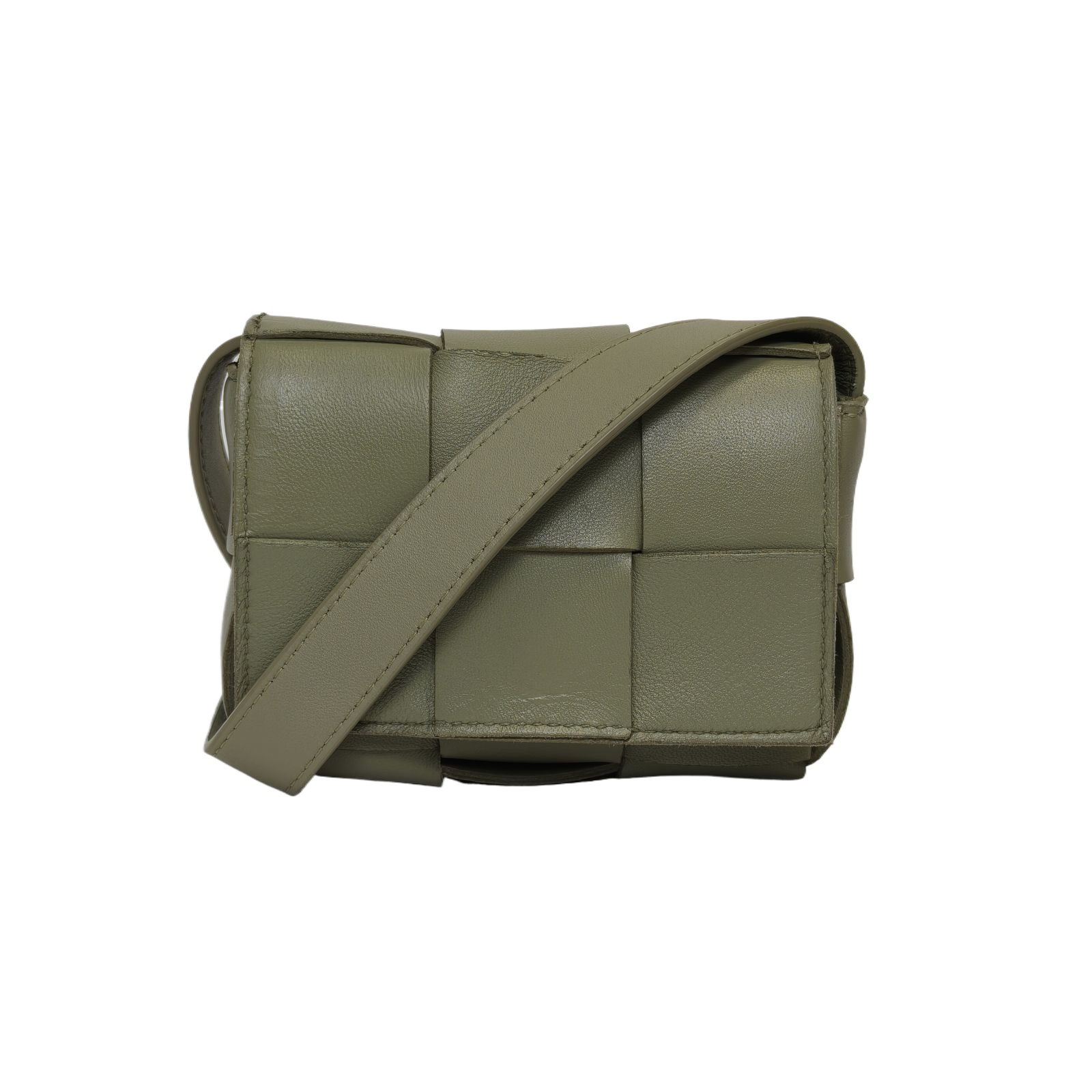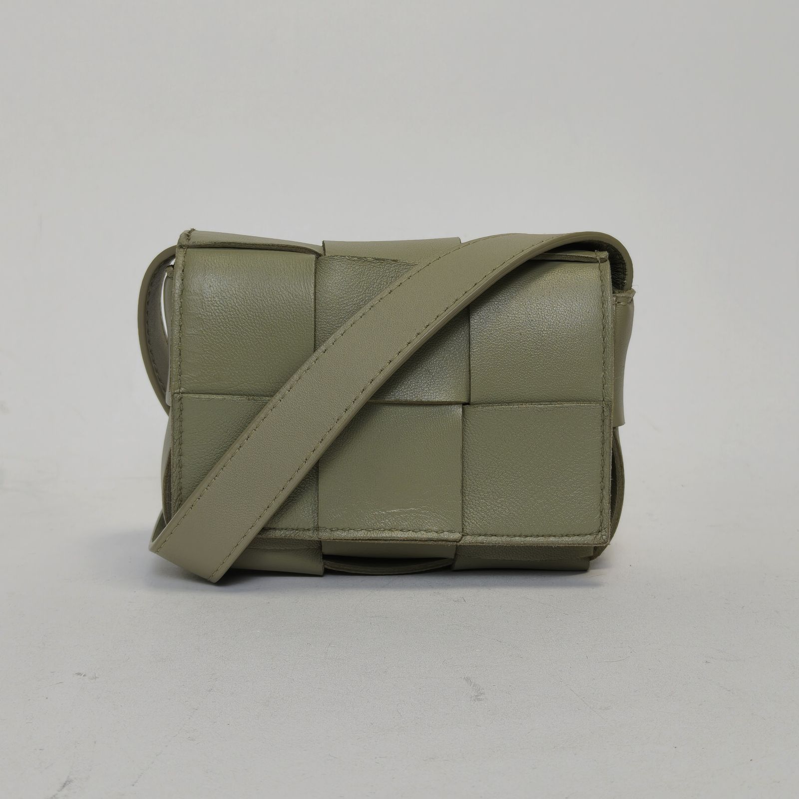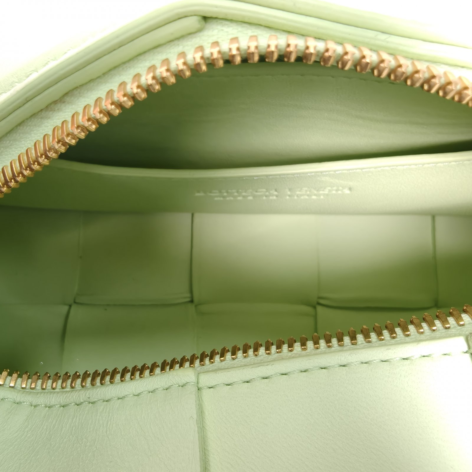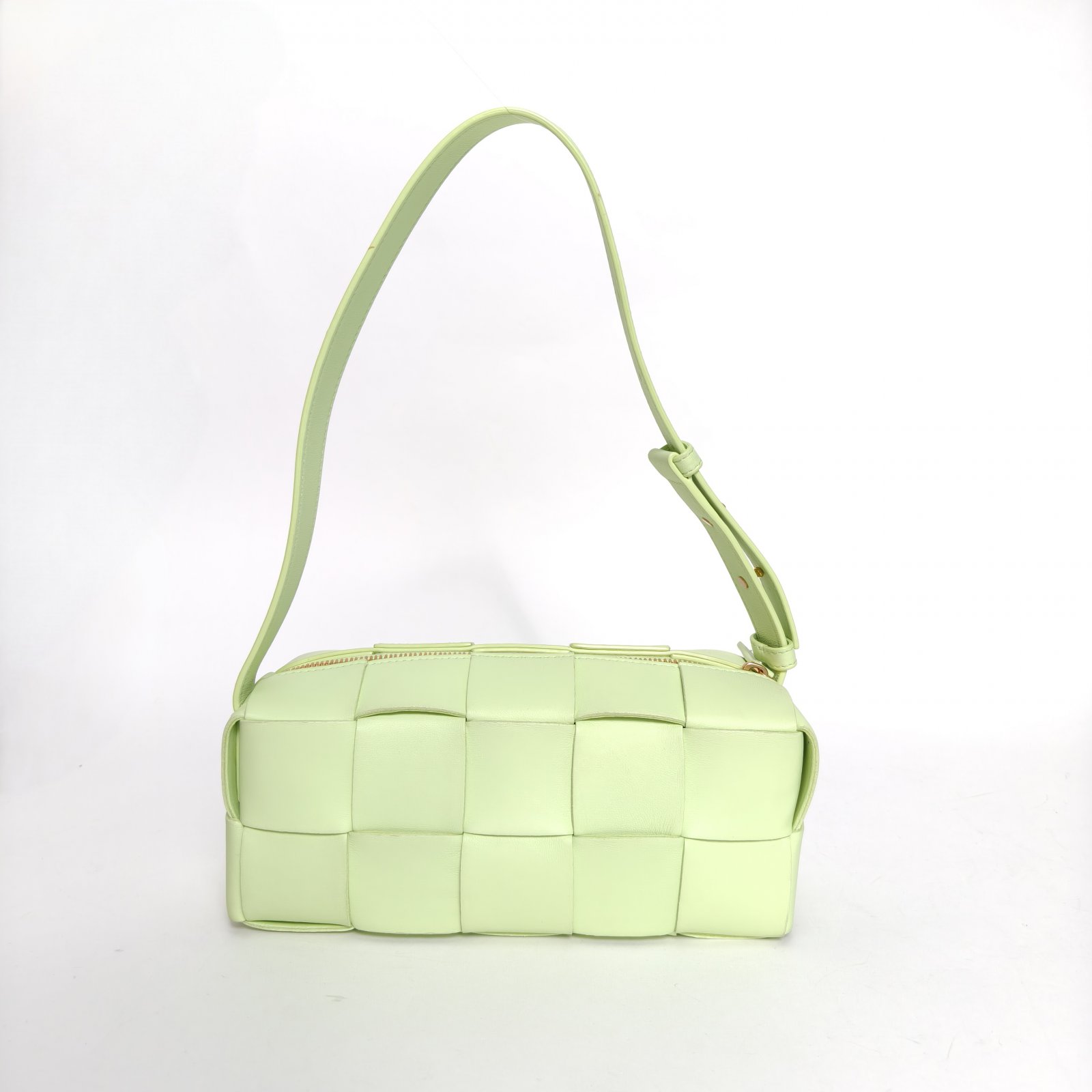 Made from light green leather with iconic Intreccio weave, this Cassette Brick small underarm bag features a detachable strap, a minimalist daily luxury piece.