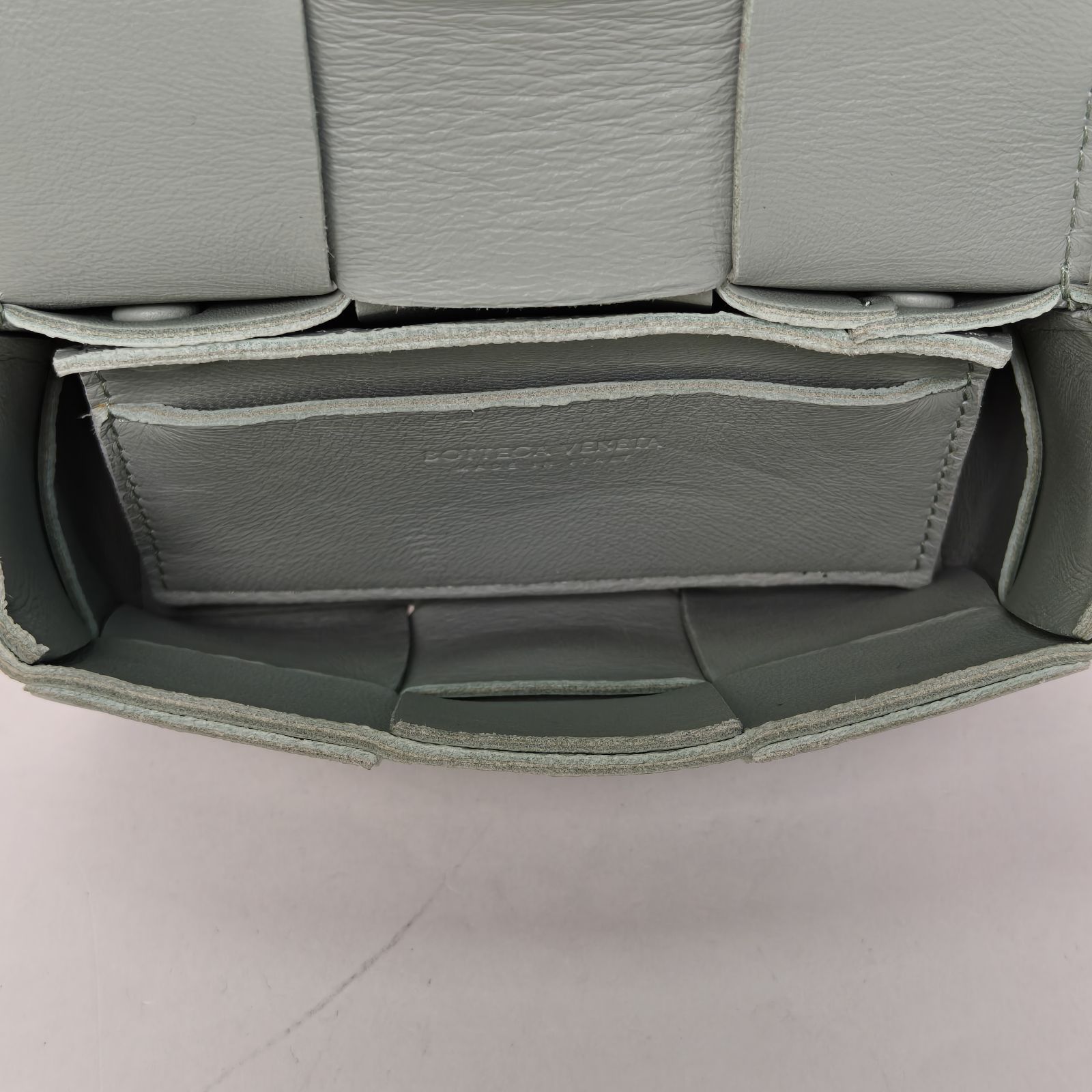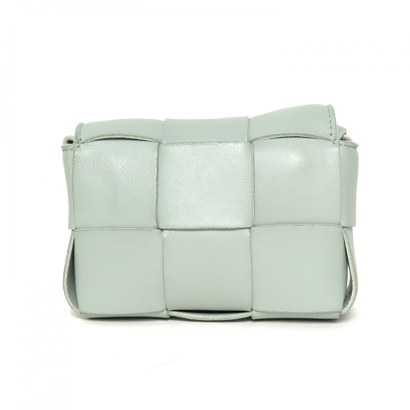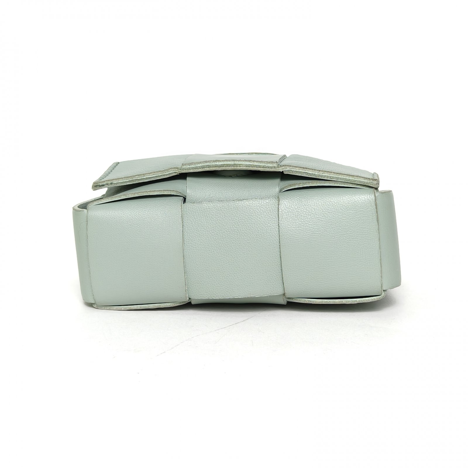 This Bottega Veneta Cassette Mini 12 bag is made of light green leather with signature intrecciato weaving, offering a sleek and compact design.