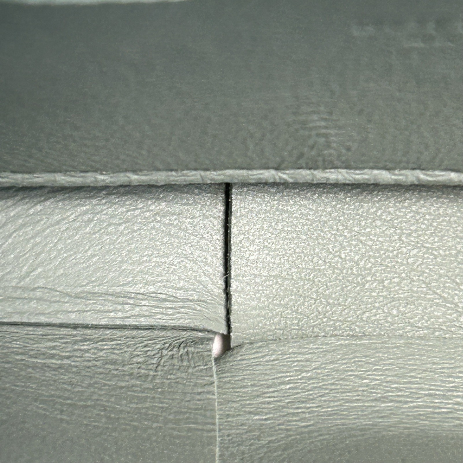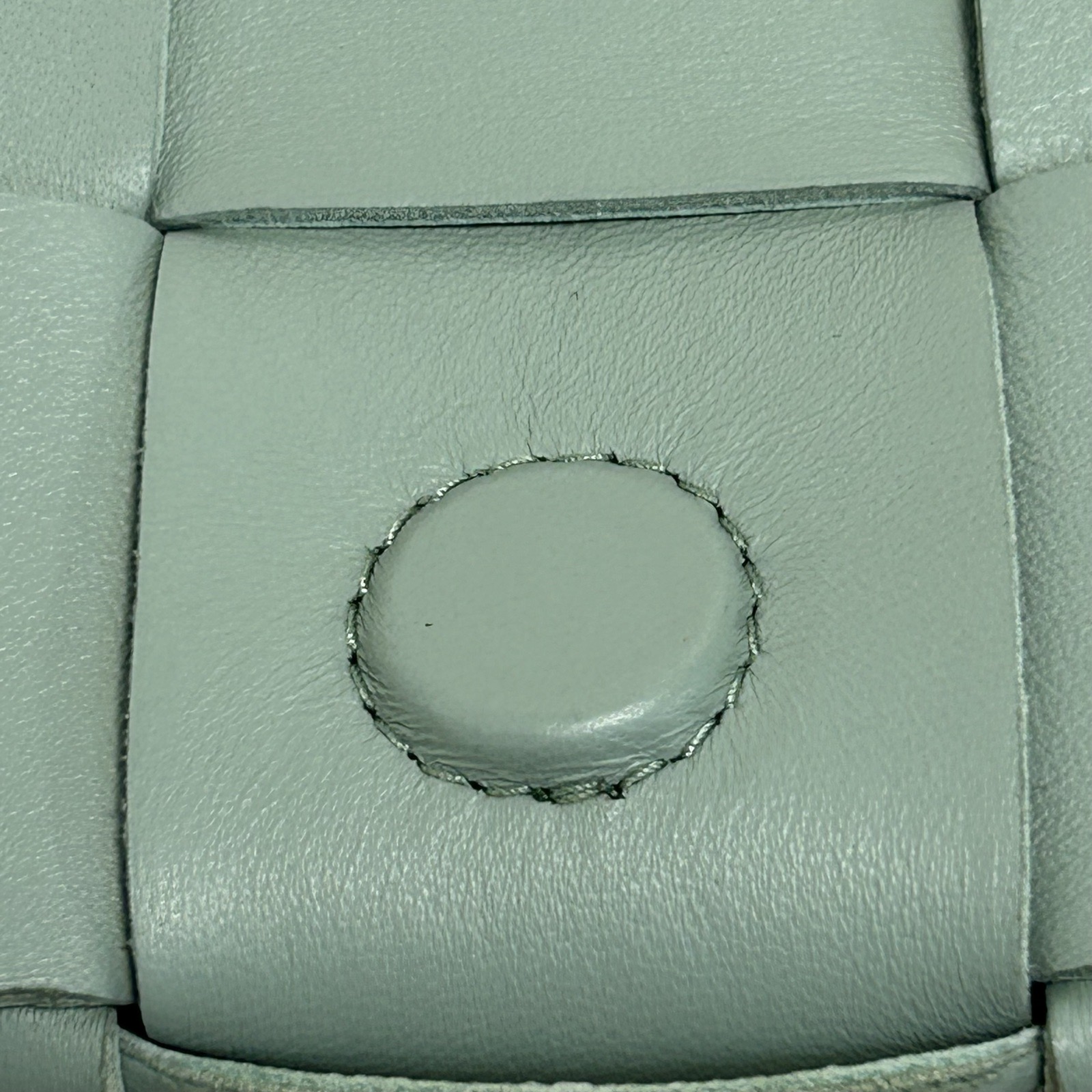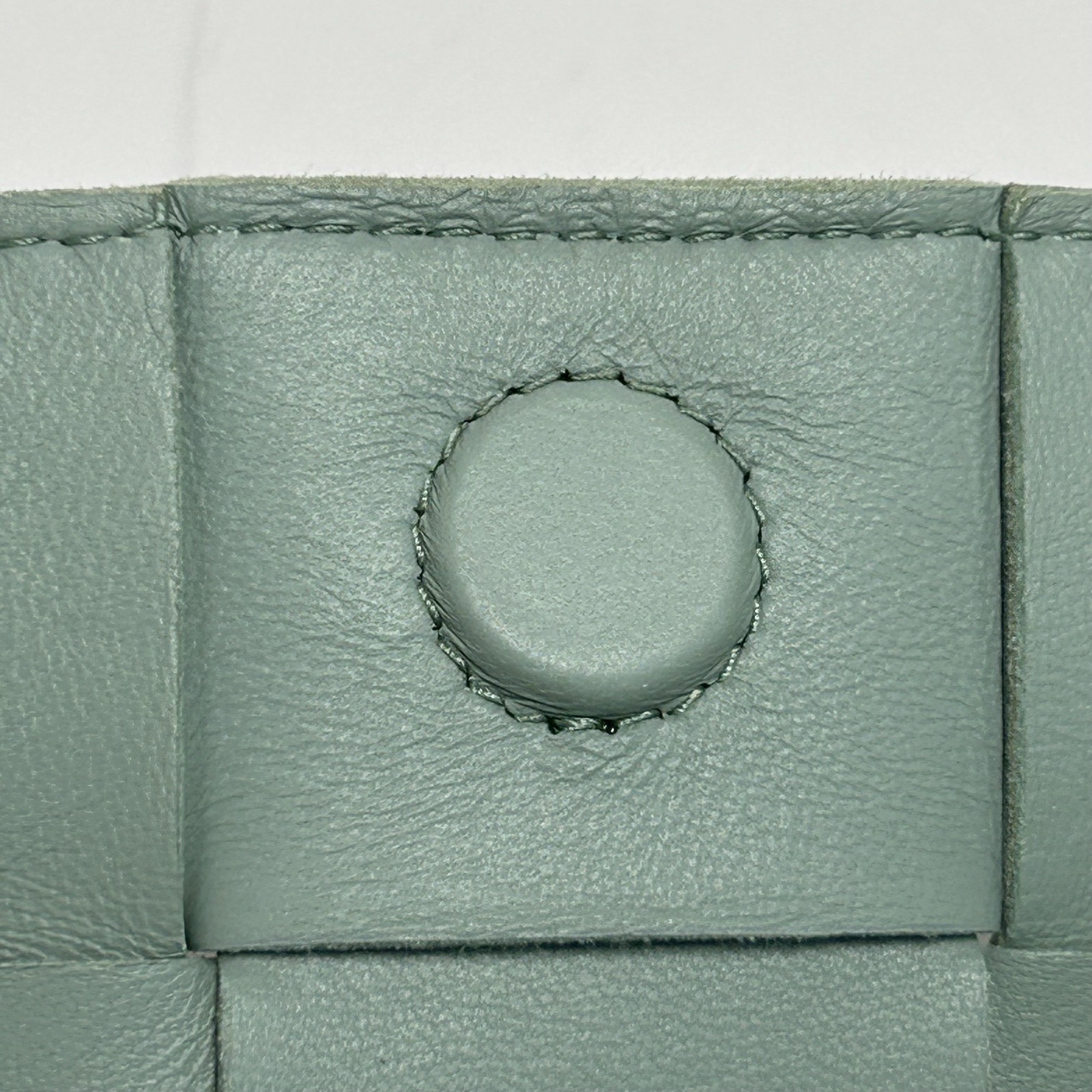 This Bottega Veneta Cassette Mini 12 bag is made of light green leather with signature intrecciato weaving, offering a sleek and compact design.