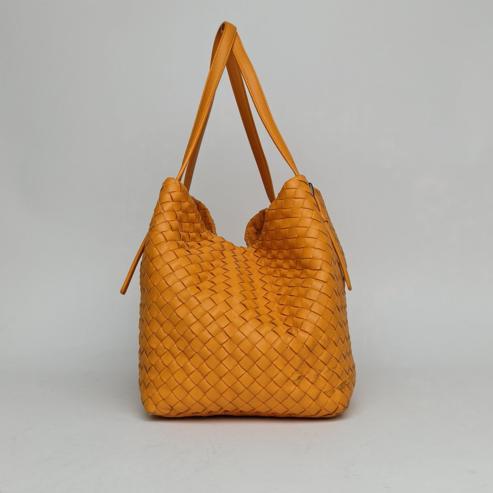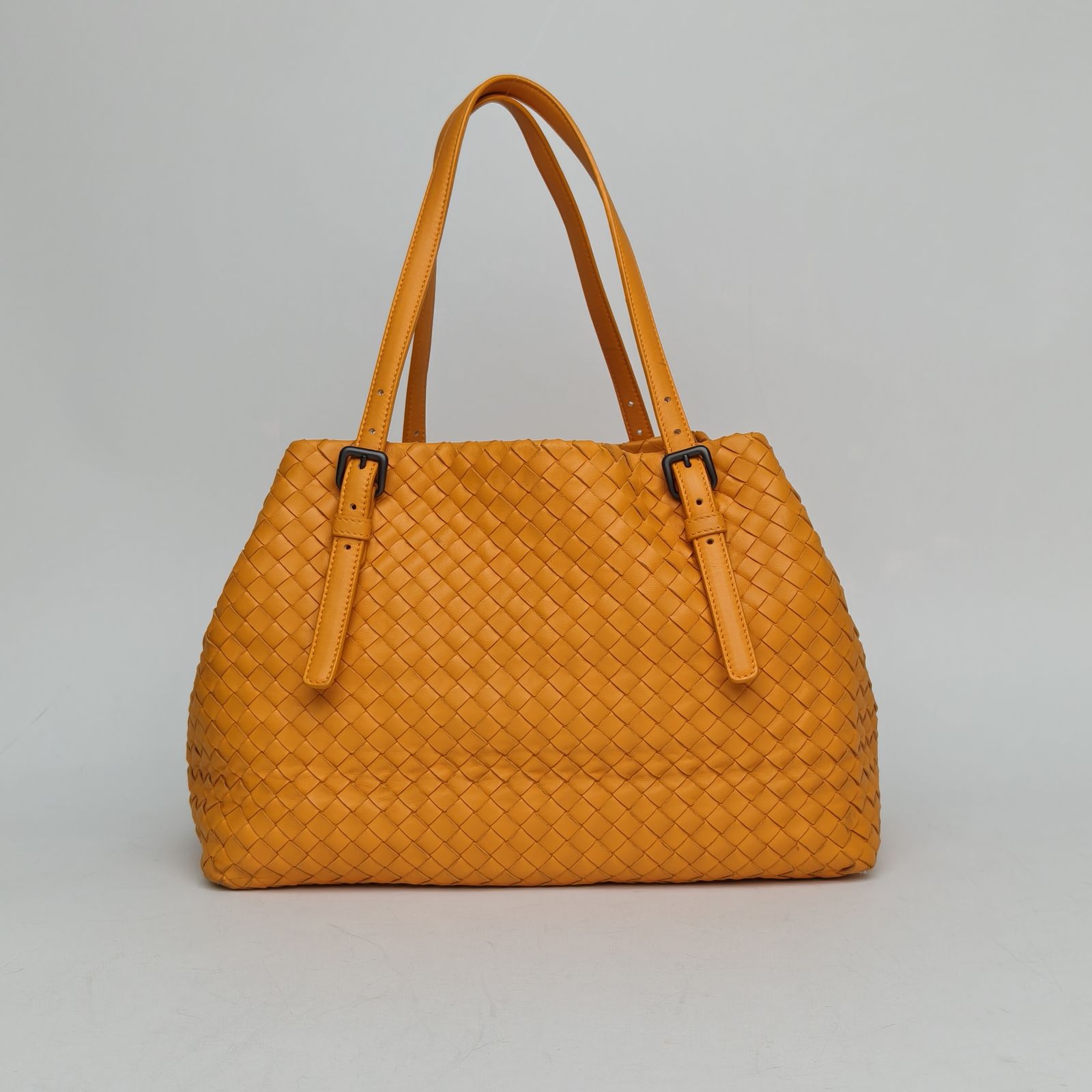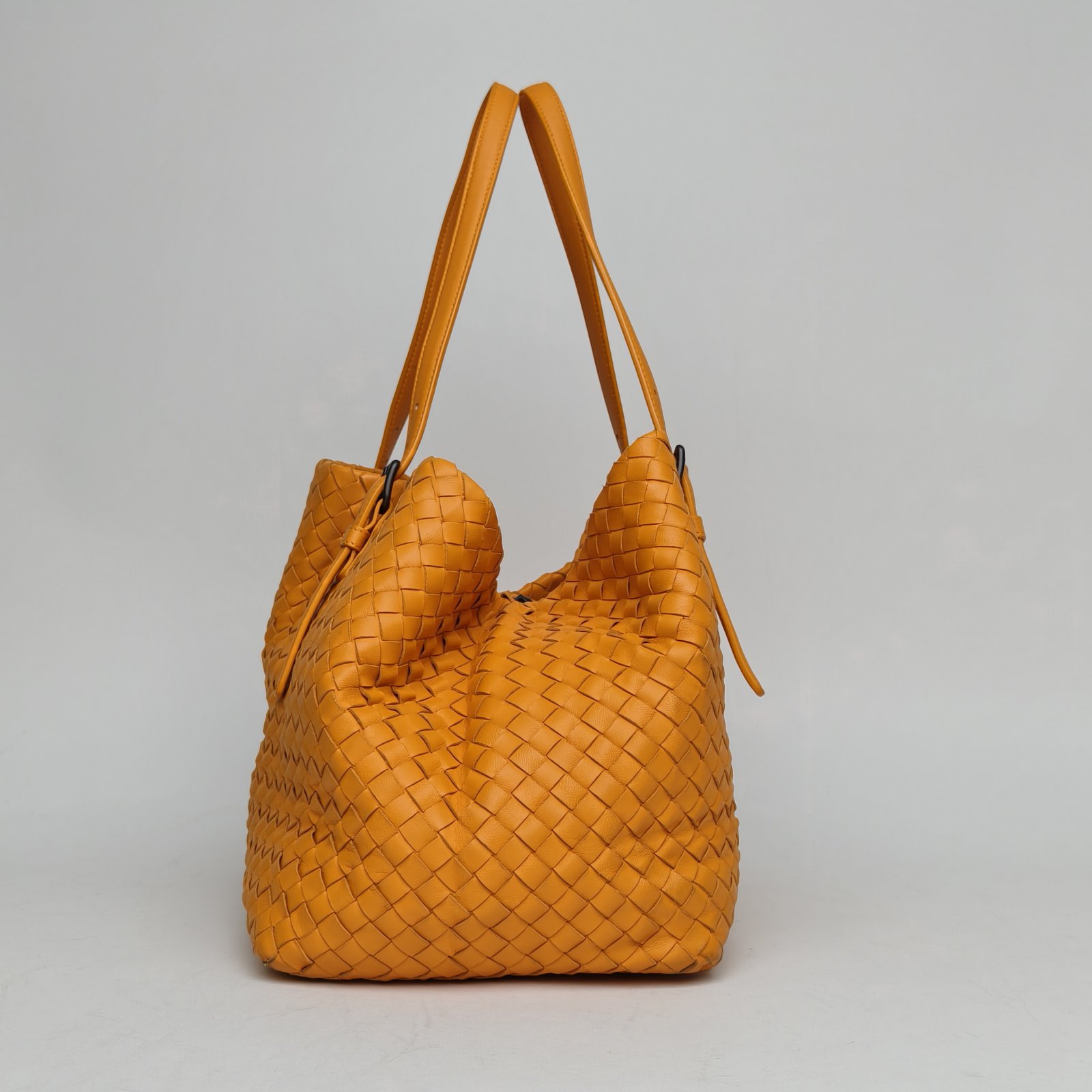 Crafted from orange leather with iconic Intreccio weave, this Neverfull medium tote features top handles, a spacious and stylish piece for daily use.