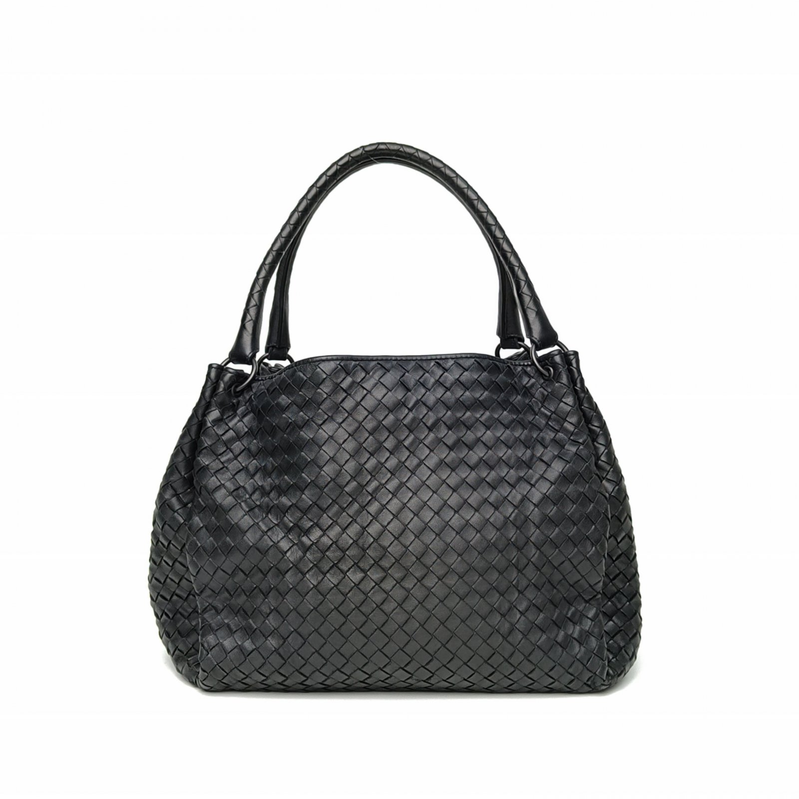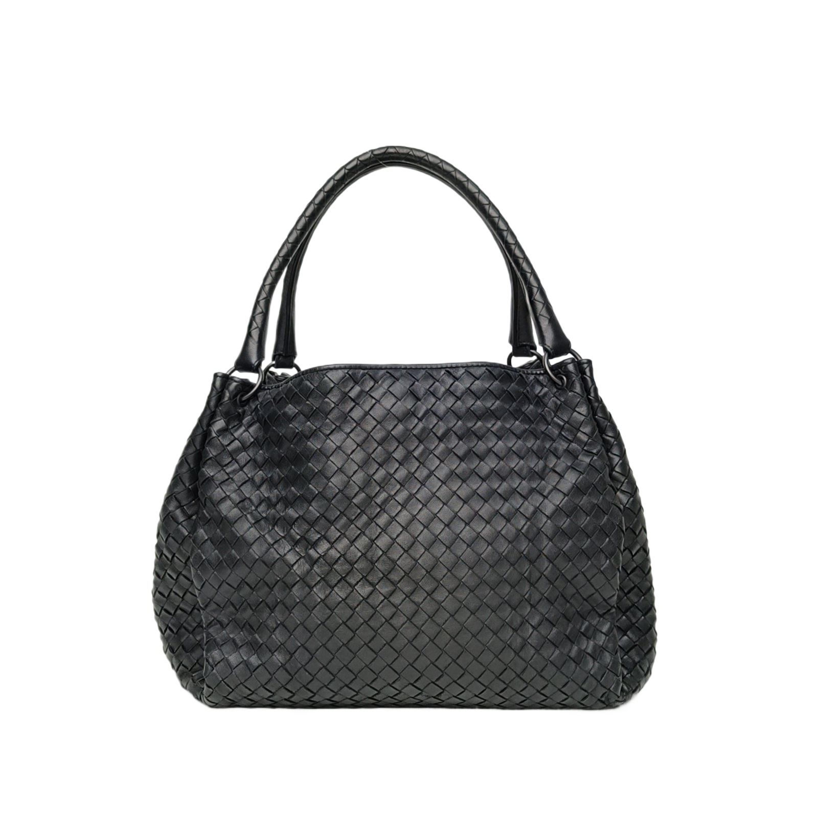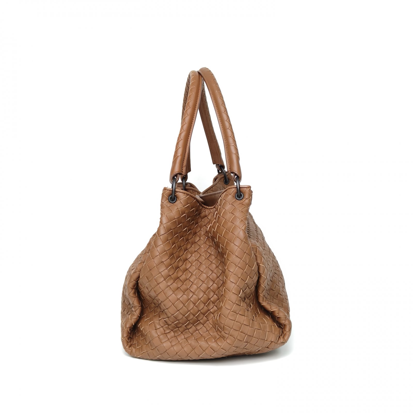 This Bottega Veneta small shoulder bag is crafted from brown intrecciato leather with silver-tone hardware, featuring a structured silhouette and top handles.