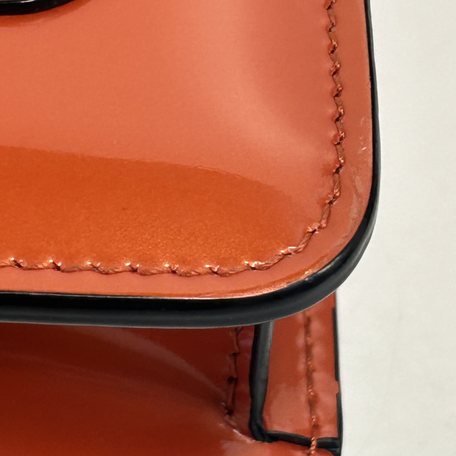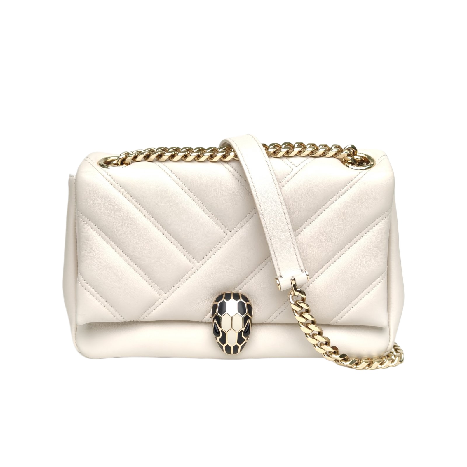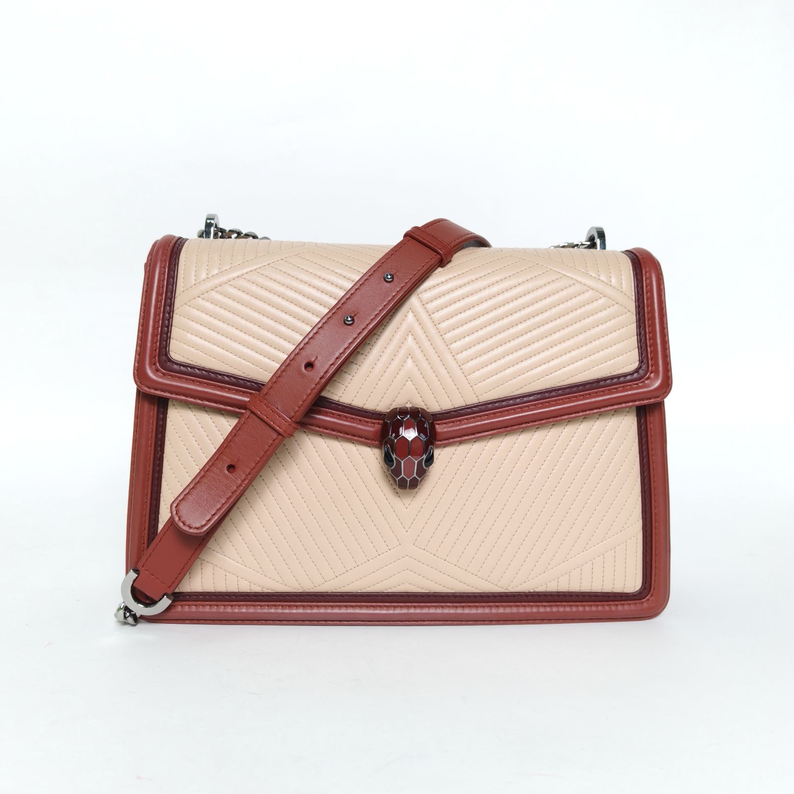 Embodying Bulgari’s iconic serpentine elegance, the Serpenti Forever Horizontal Bag is crafted from smooth orange leather with a signature snake-head clasp. Its structured silhouette blends timeless luxury with modern practicality, making it a perfect accessory for elevating any ensemble.