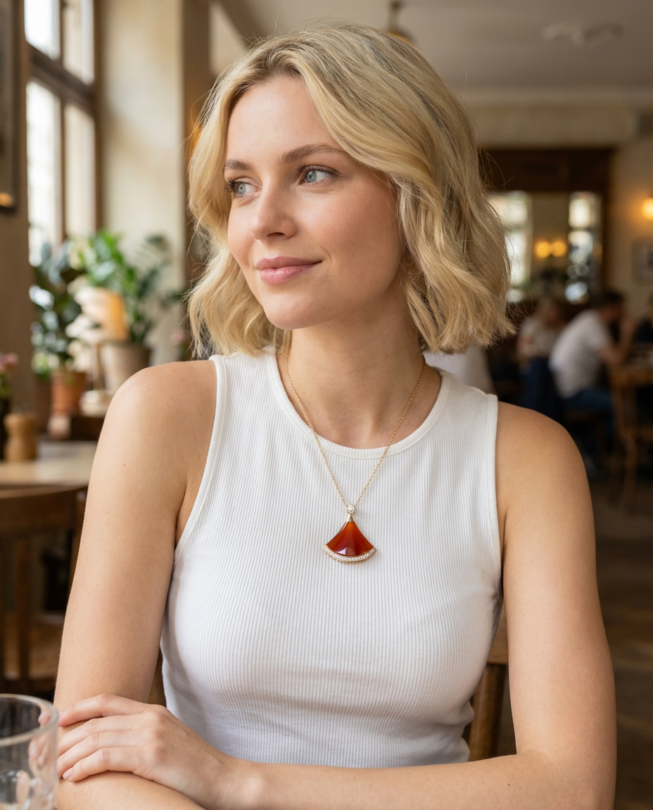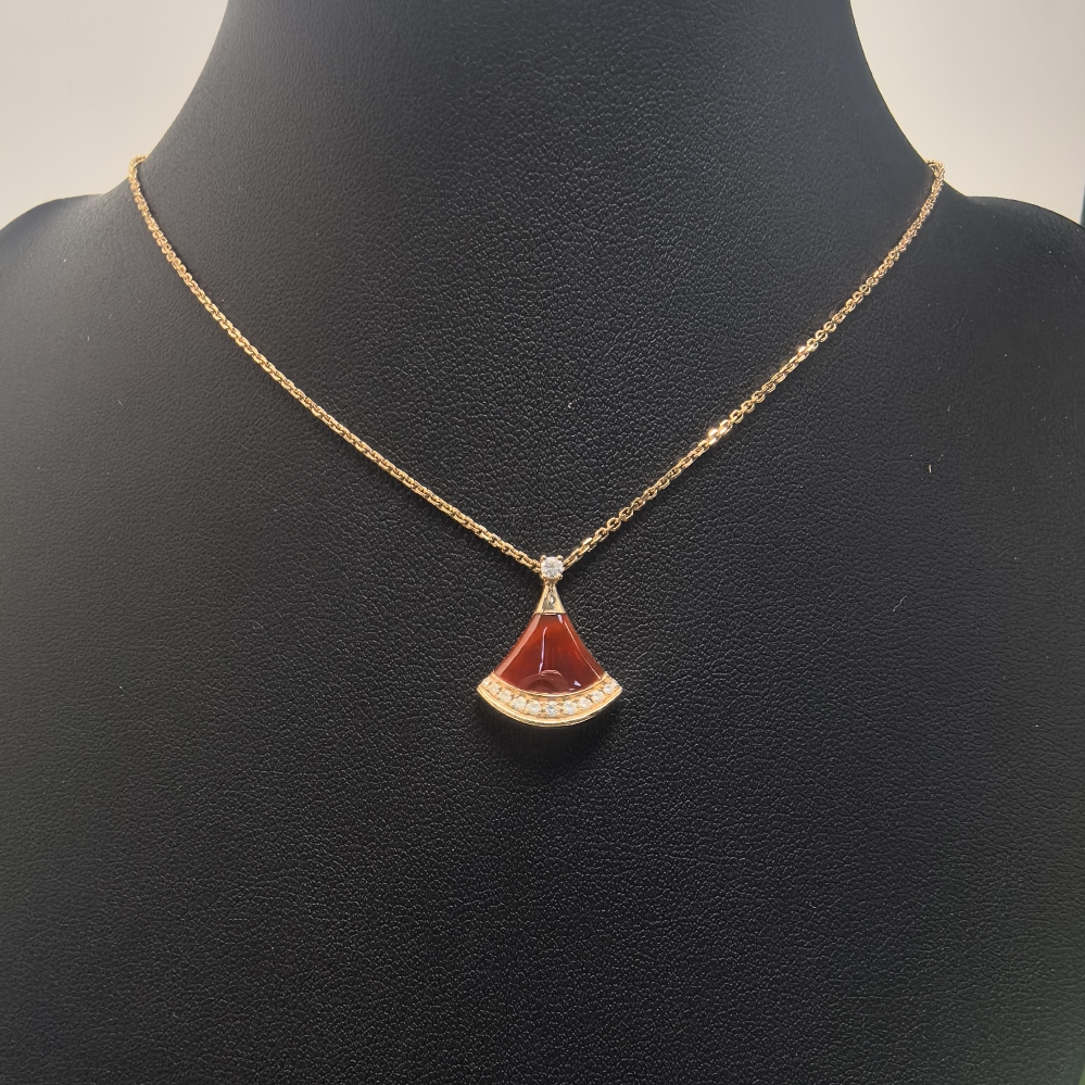 The BVLGARI Divas Dream necklace is a glamorous and opulent chain crafted from luxurious 18K rose gold featuring the iconic fan-shaped pendant set with sparkling diamonds and a rich carnelian centerpiece, complete with refined diamond and gemstone accents, superior Italian precision and radiant Bvlgari luxury in warm rose gold. Feel free to click below for more consultation.