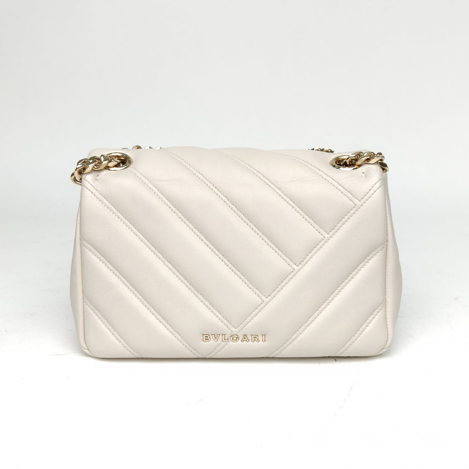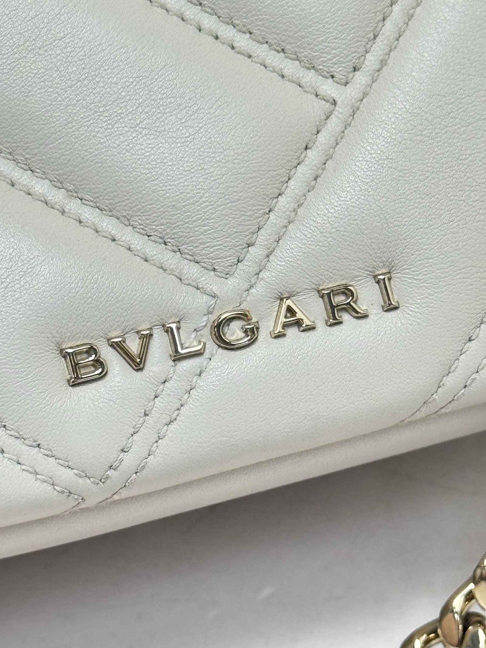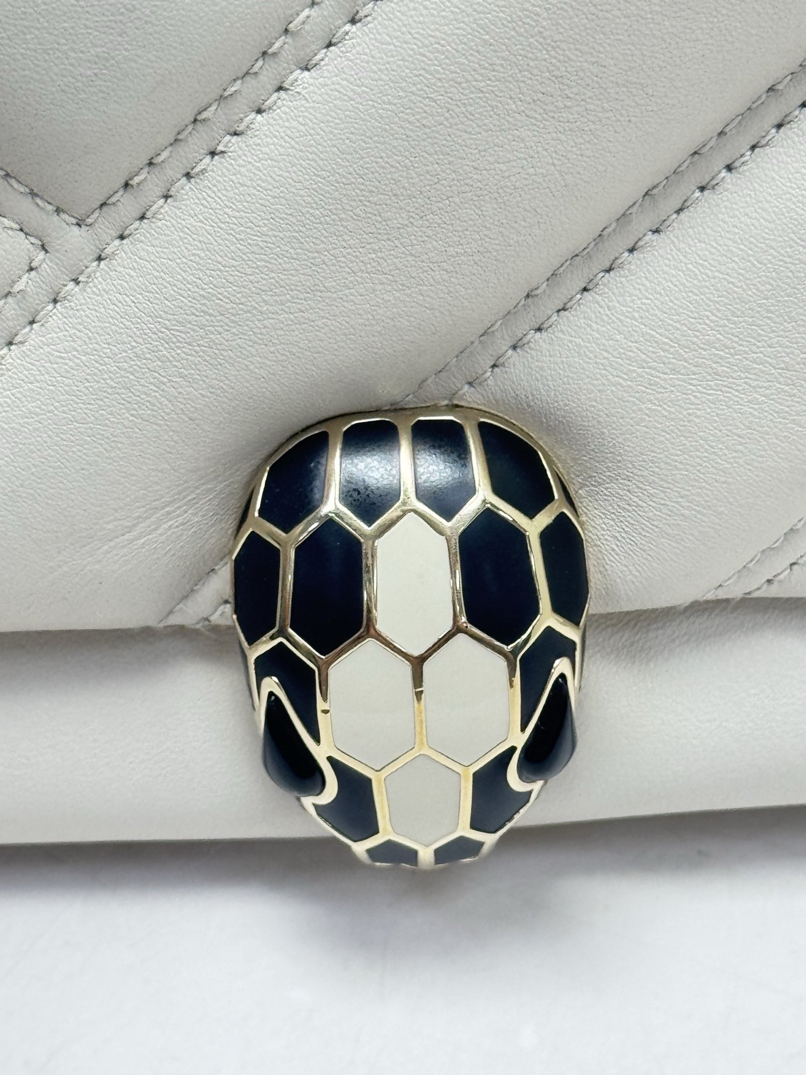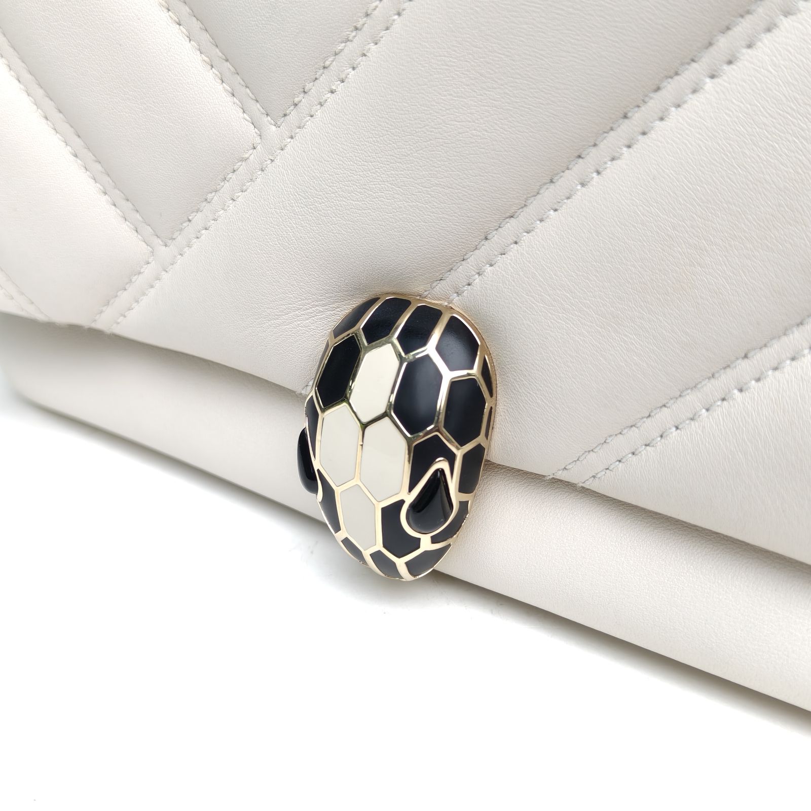 Embodying A sophisticated and elegant luxury bag, the Bvlgari Serpenti Cabochon Mini is crafted from smooth white calfskin leather with signature matelassé quilting and polished gold hardware. The iconic snake head clasp makes it a coveted piece.