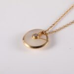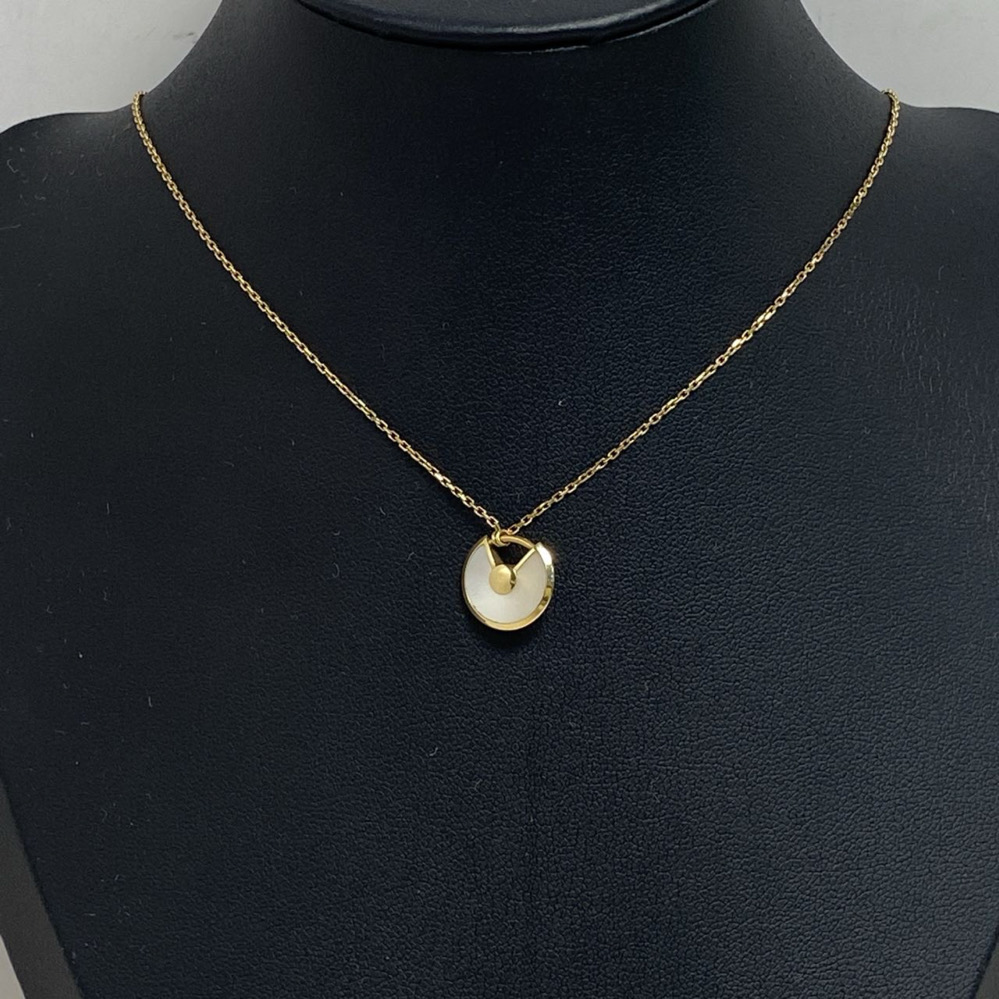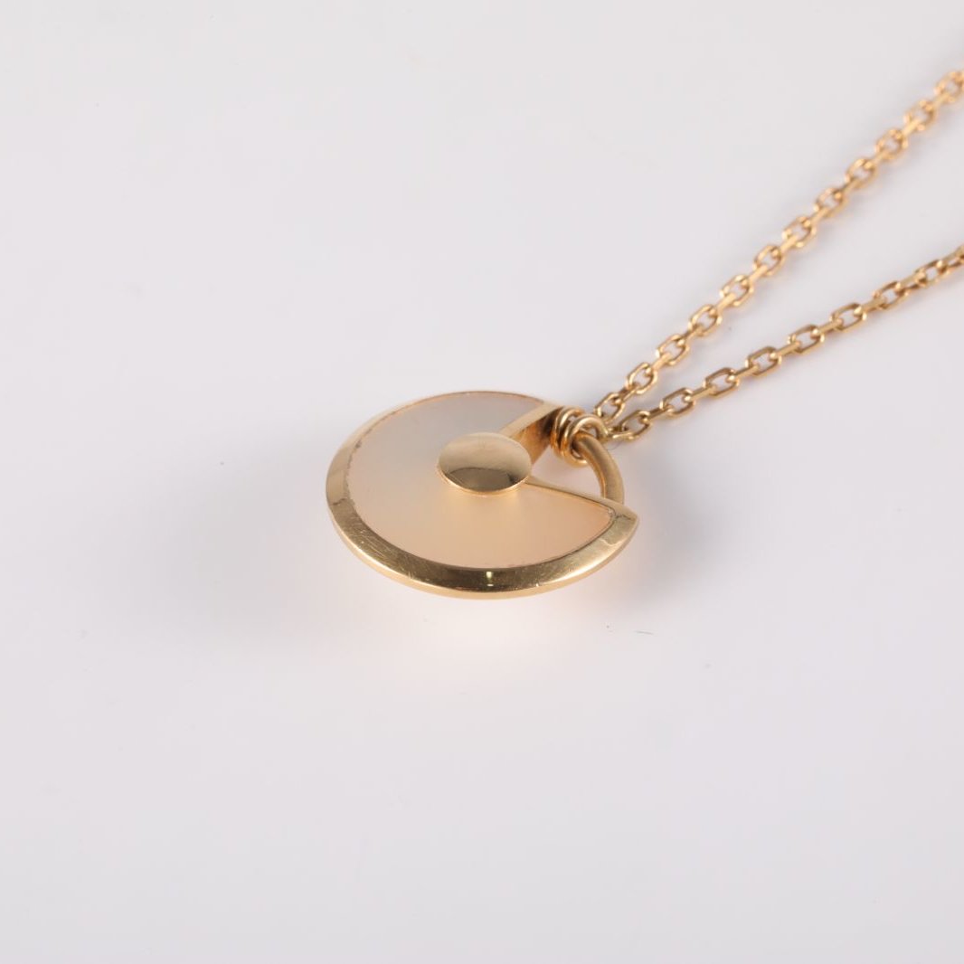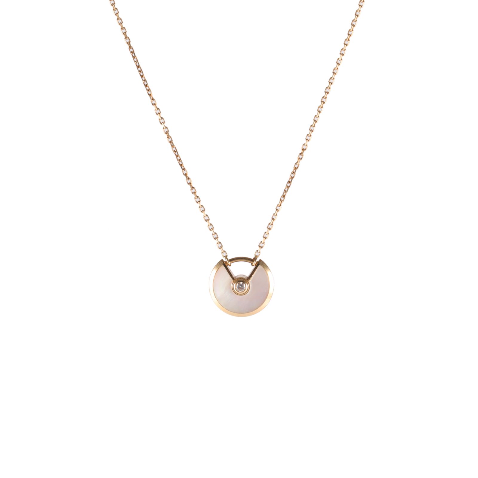 The Amulette de Cartier necklace is a magical talisman, a dreamy collection of precious elements symbolizing liberty and trust. This XS model features a shimmering white mother-of-pearl disc, meticulously set in warm 18K pink gold that glows against the skin. At its heart lies a brilliant-cut diamond of 0.02 carats, acting as a focal point of light and luxury. The unique padlock-inspired design serves as a “lucky charm” that closes to hold wishes and opens to release them. Its delicate adjustable chain makes it an ideal piece for layering or wearing alone as a sophisticated daily signature. This necklace perfectly balances Cartier’s jewelry heritage with a modern, mystical aesthetic, offering a timeless blend of elegance and personal significance.