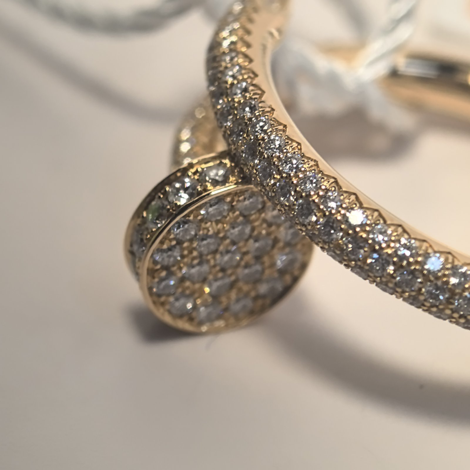 The Cartier Juste un Clou ring is a bold and minimalist band crafted from 18K rose gold featuring the signature nail motif accented with brilliant-cut diamonds, complete with exquisite diamond pavé detailing, meticulous Italian craftsmanship and timeless Cartier elegance in soft rose gold. Feel free to click below for more consultation.