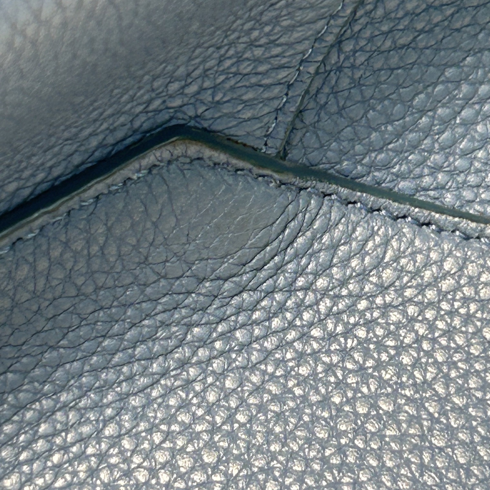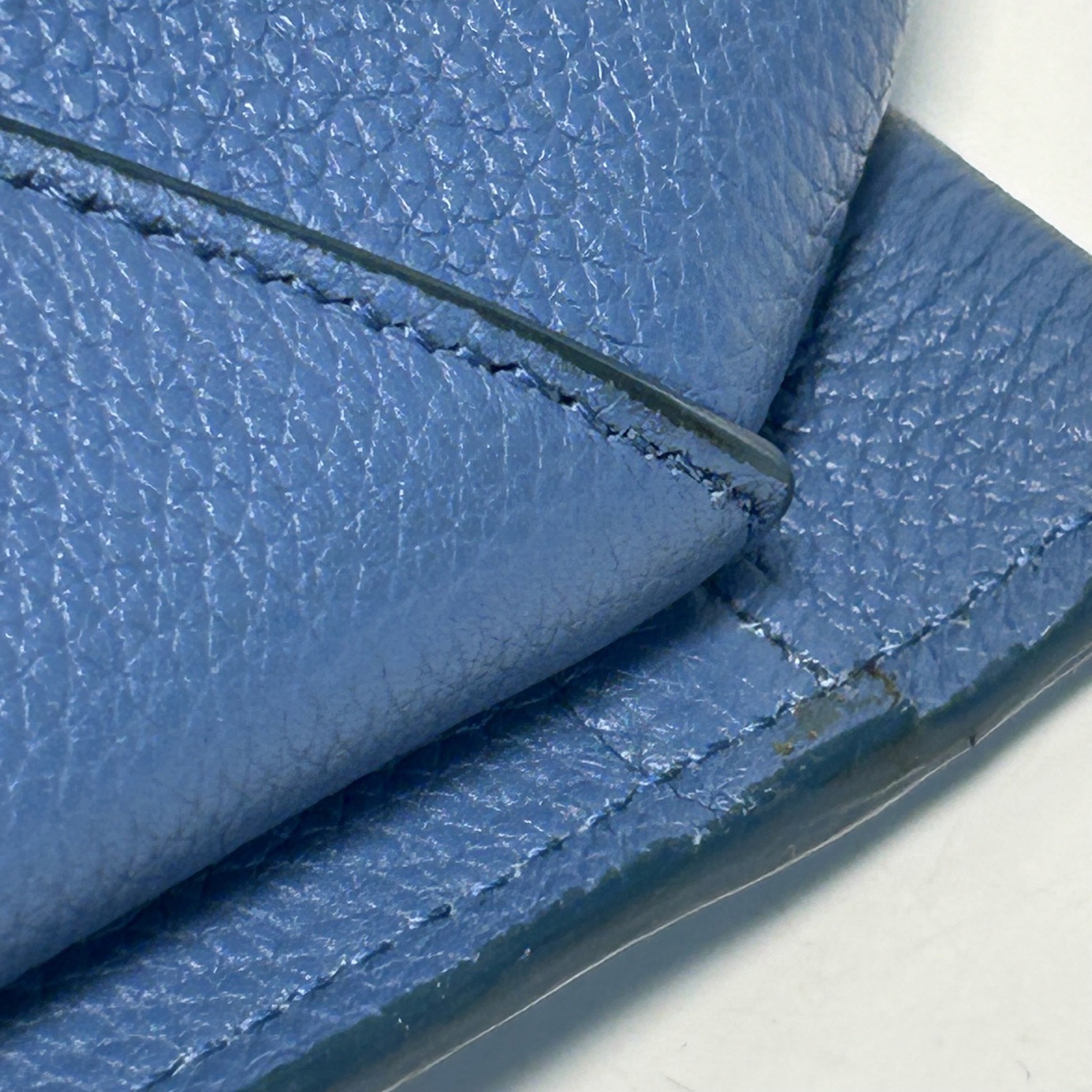This spacious blue leather tote boasts a knotted front detail and sturdy top handles, offering an open silhouette that’s perfect for carrying daily essentials while maintaining a refined, modern look.