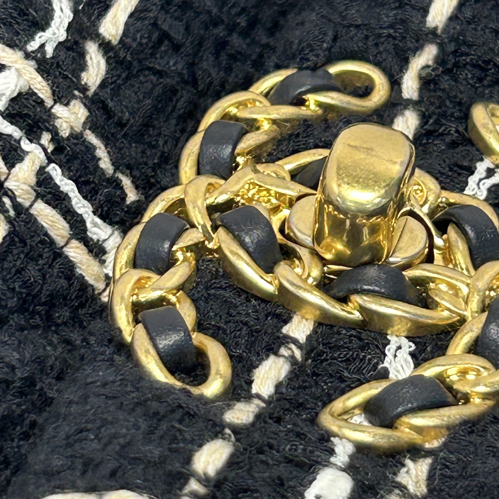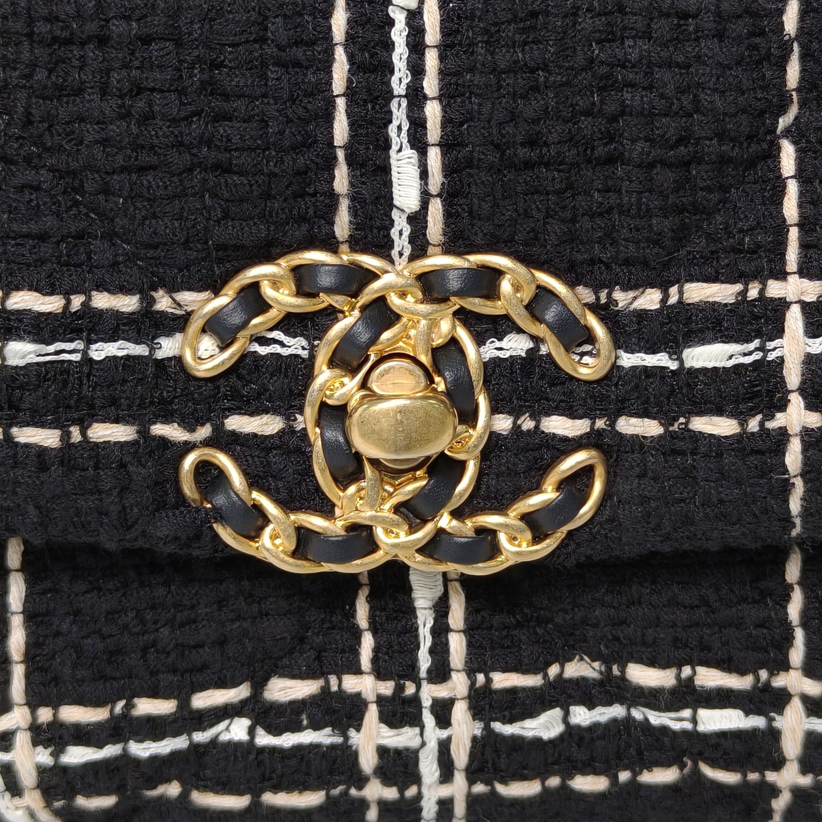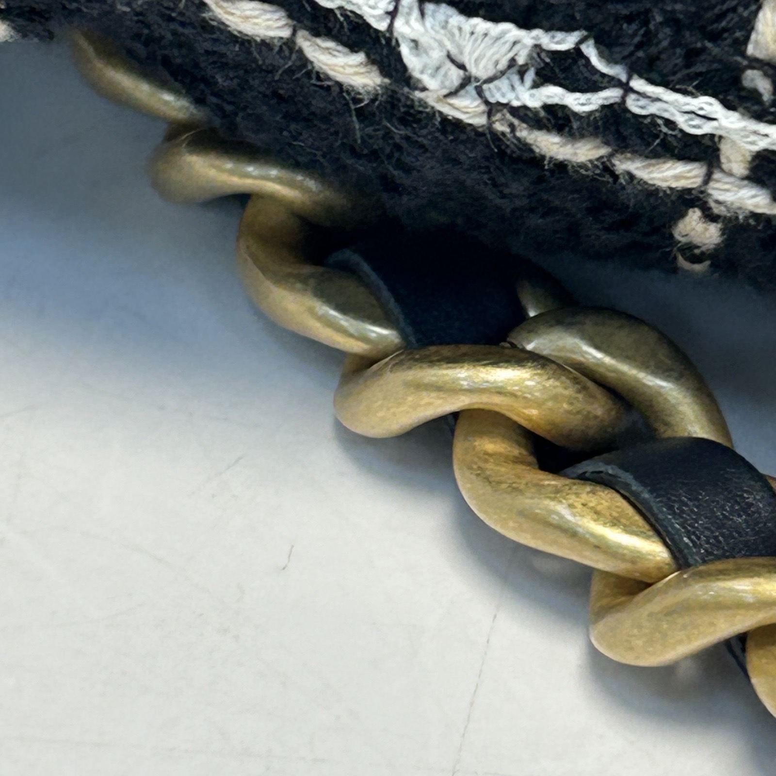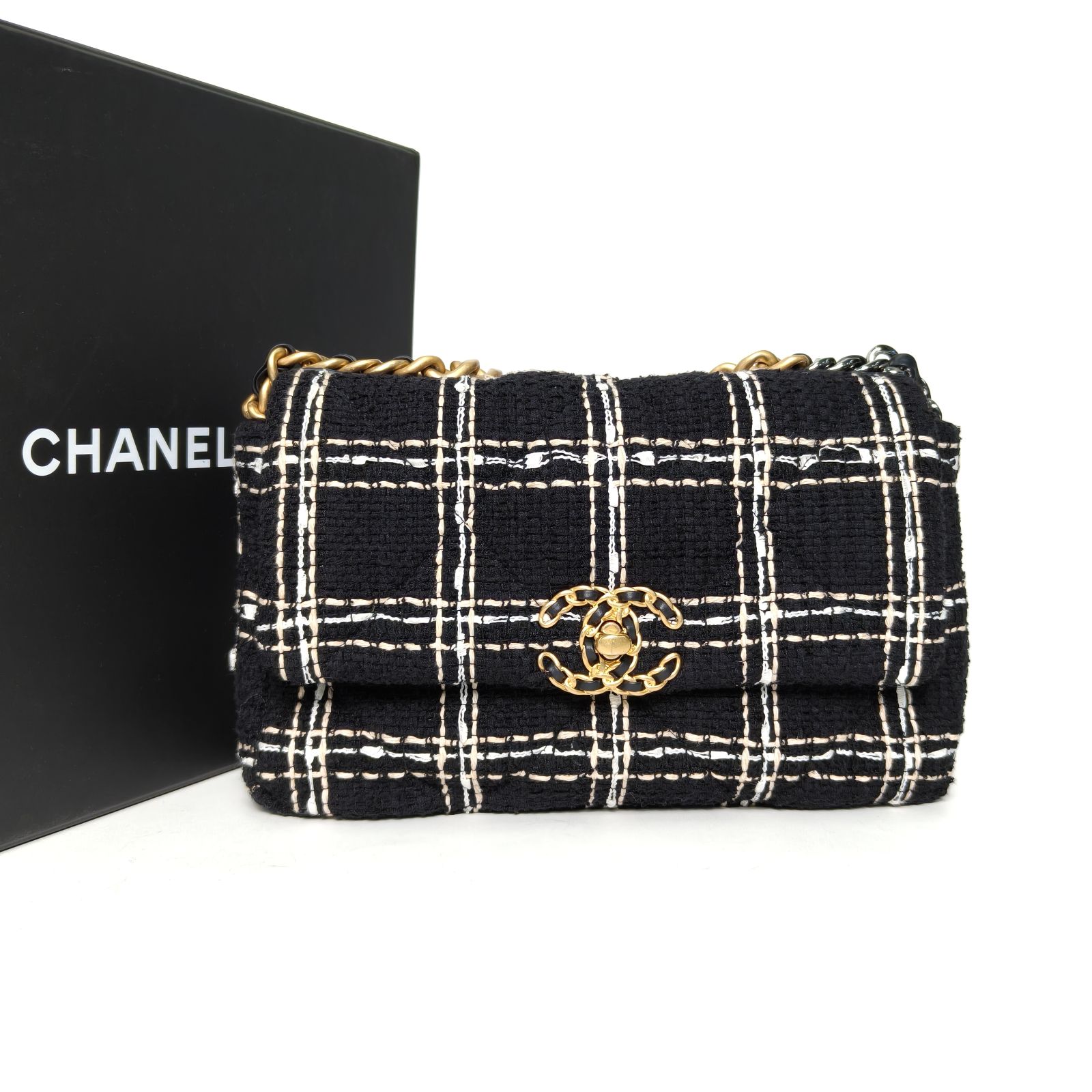 This Chanel 19Bag small 26cm is made of black and white tweed with gold-tone hardware, featuring a double chain strap and interlocking CC clasp.