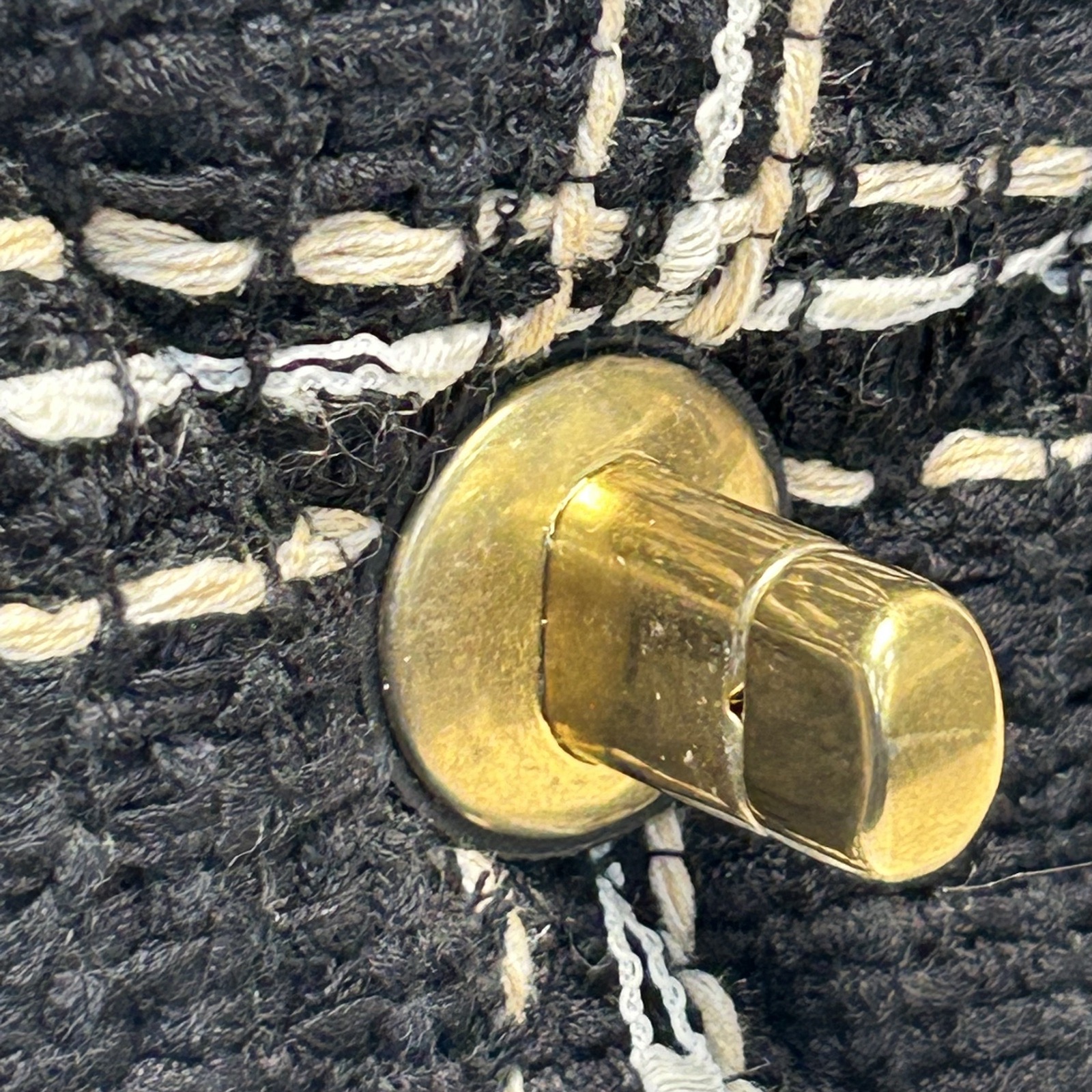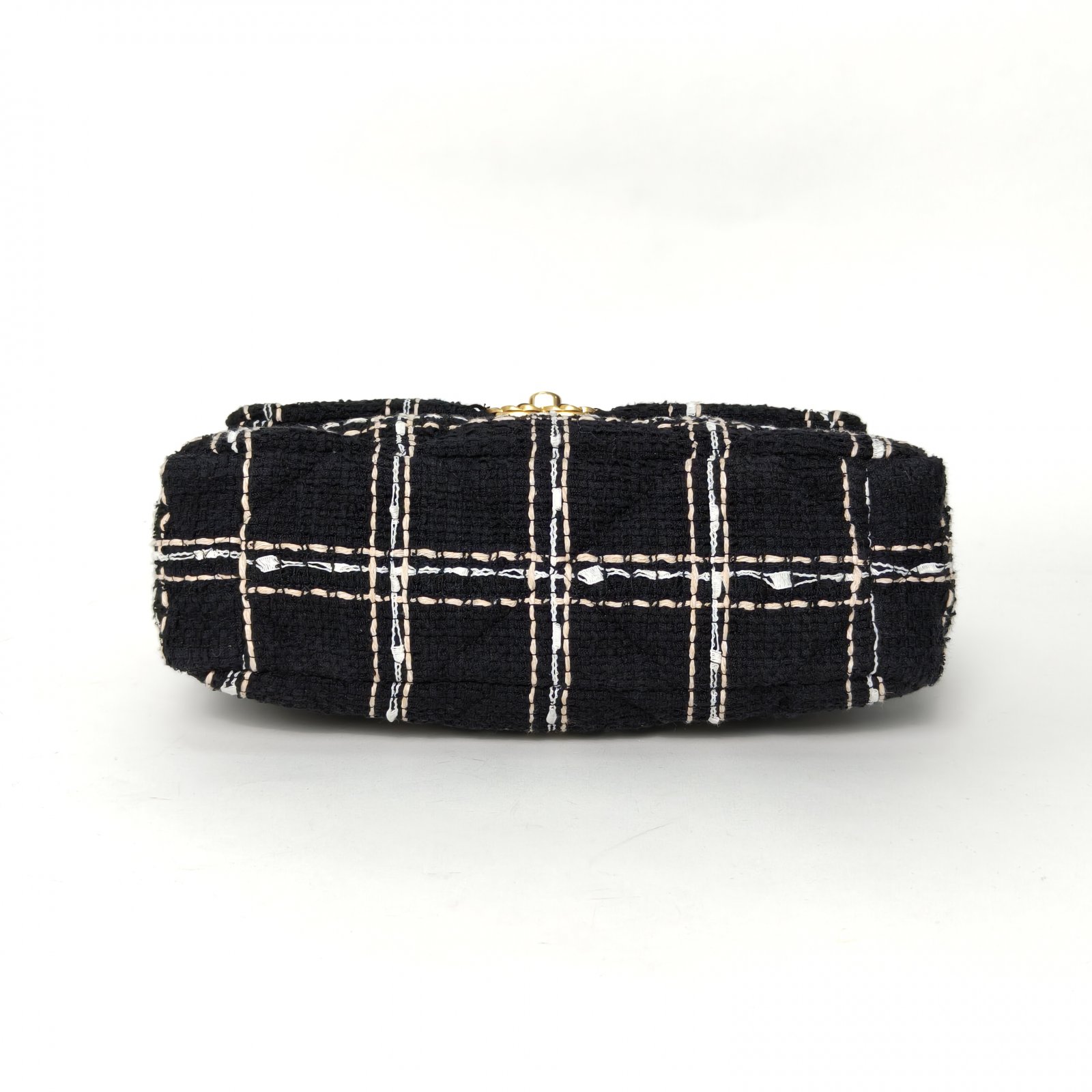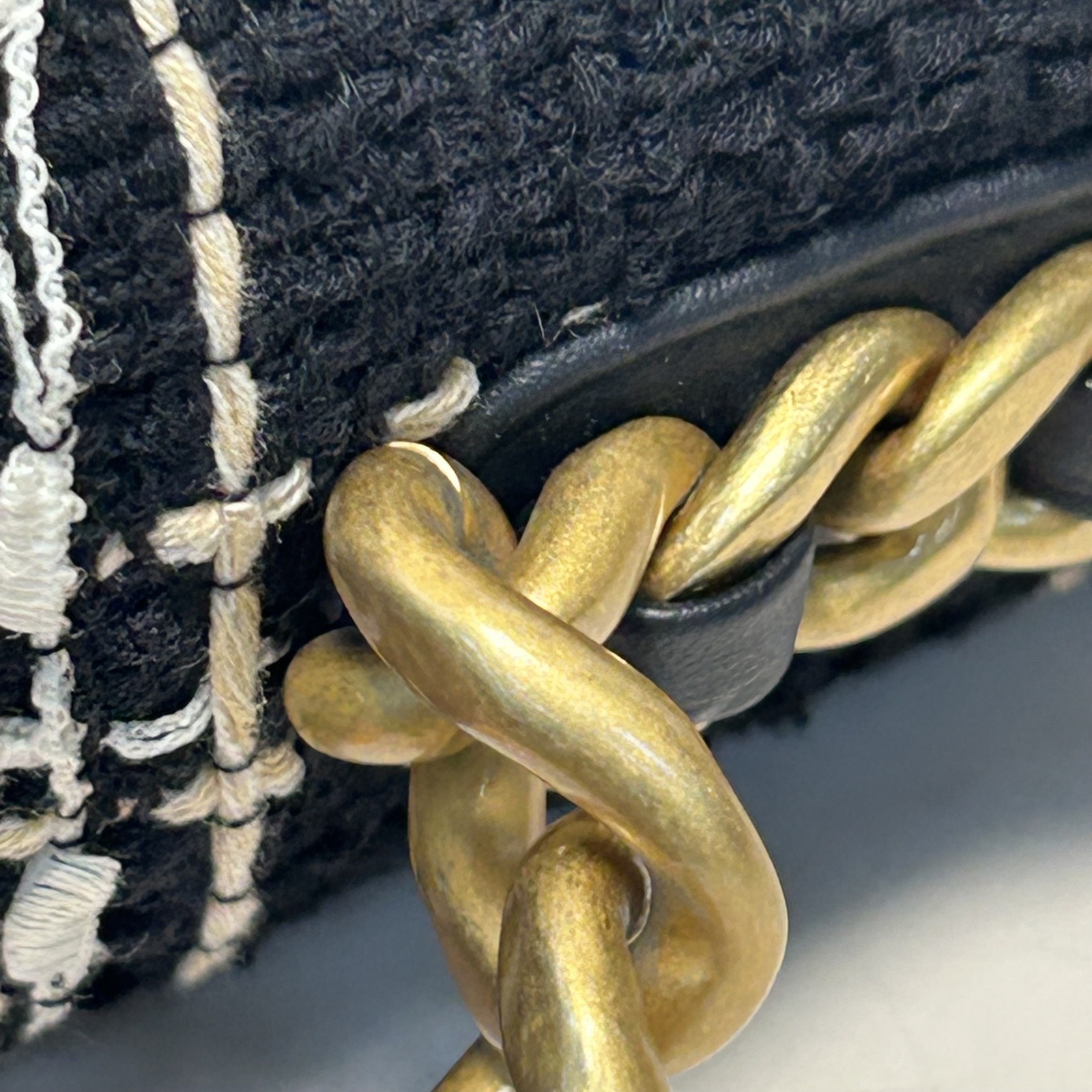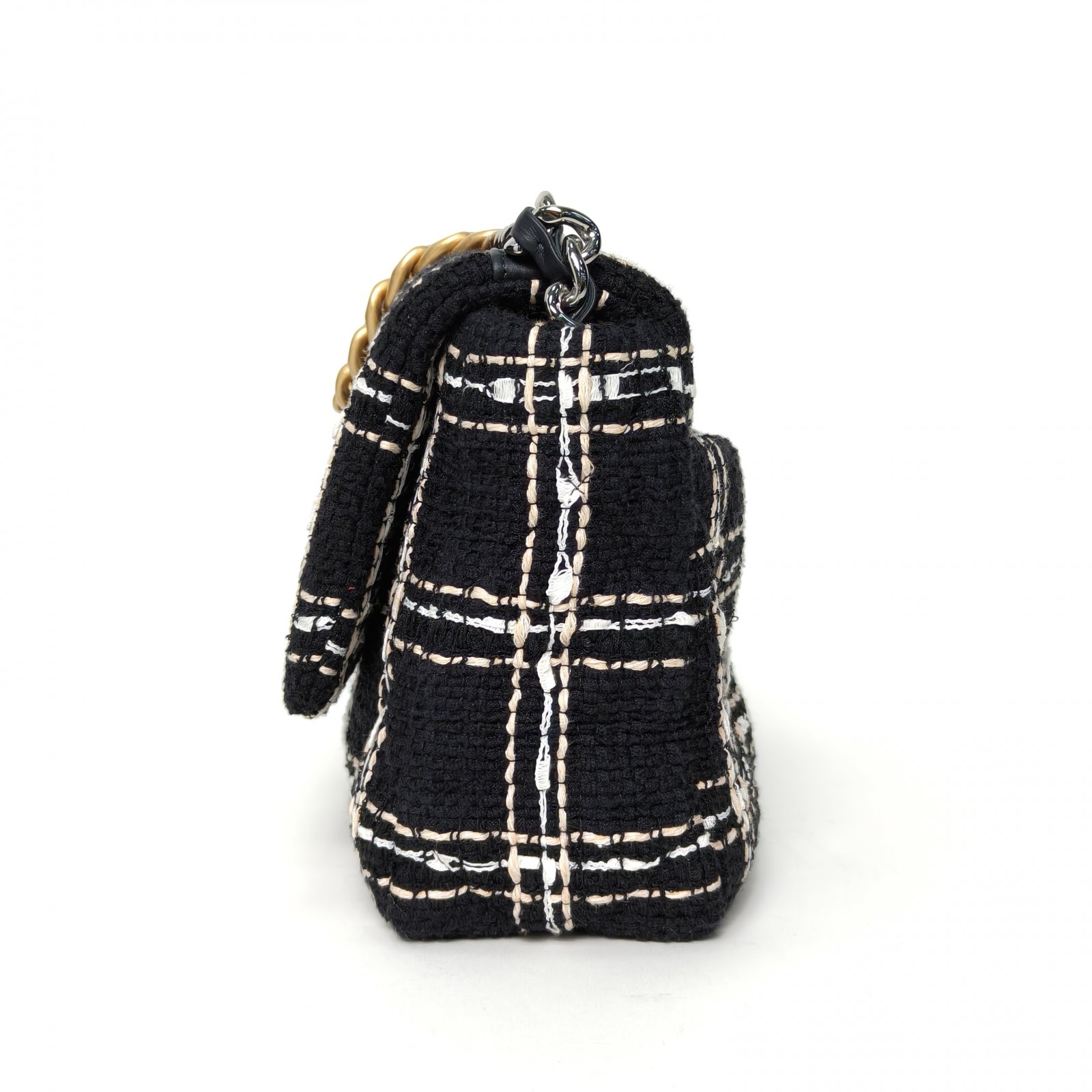 This Chanel 19Bag small 26cm is made of black and white tweed with gold-tone hardware, featuring a double chain strap and interlocking CC clasp.