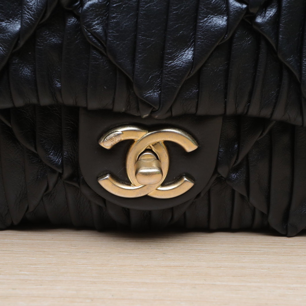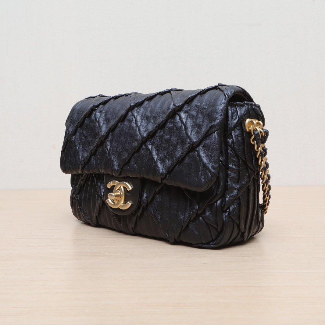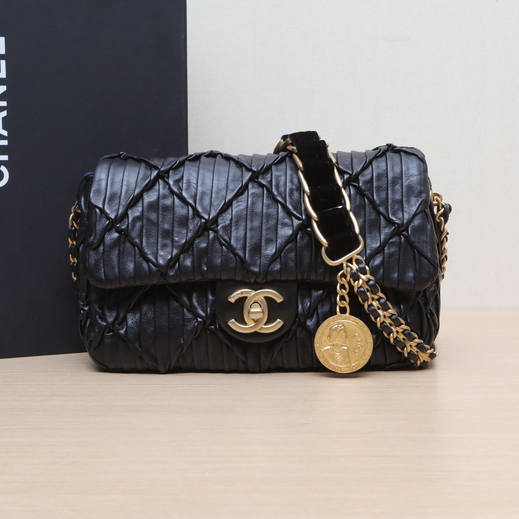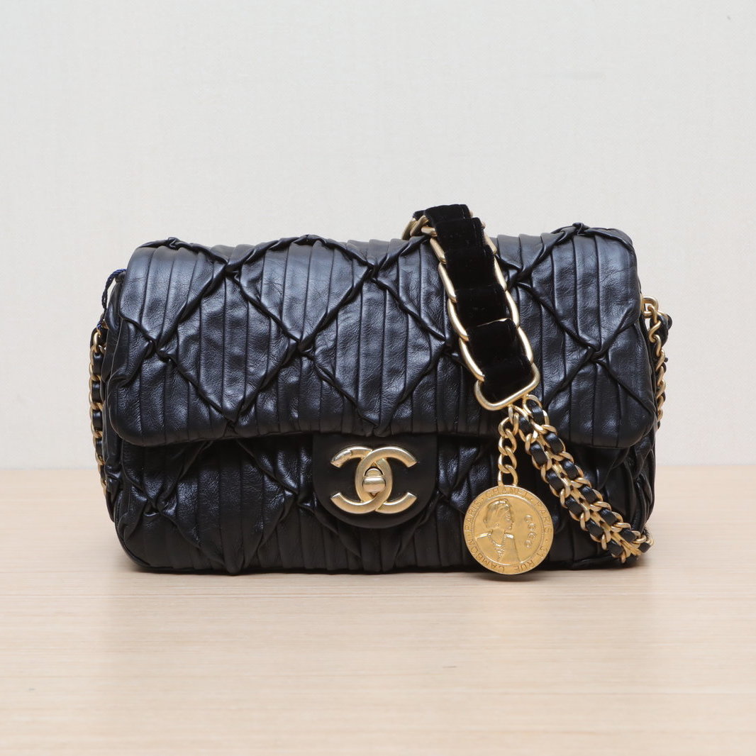 Crafted from black leather with crinkled diamond-quilted pattern and iconic CC logo, this 21A CF flap bag features a gold coin double chain strap, a limited-edition Chanel piece.