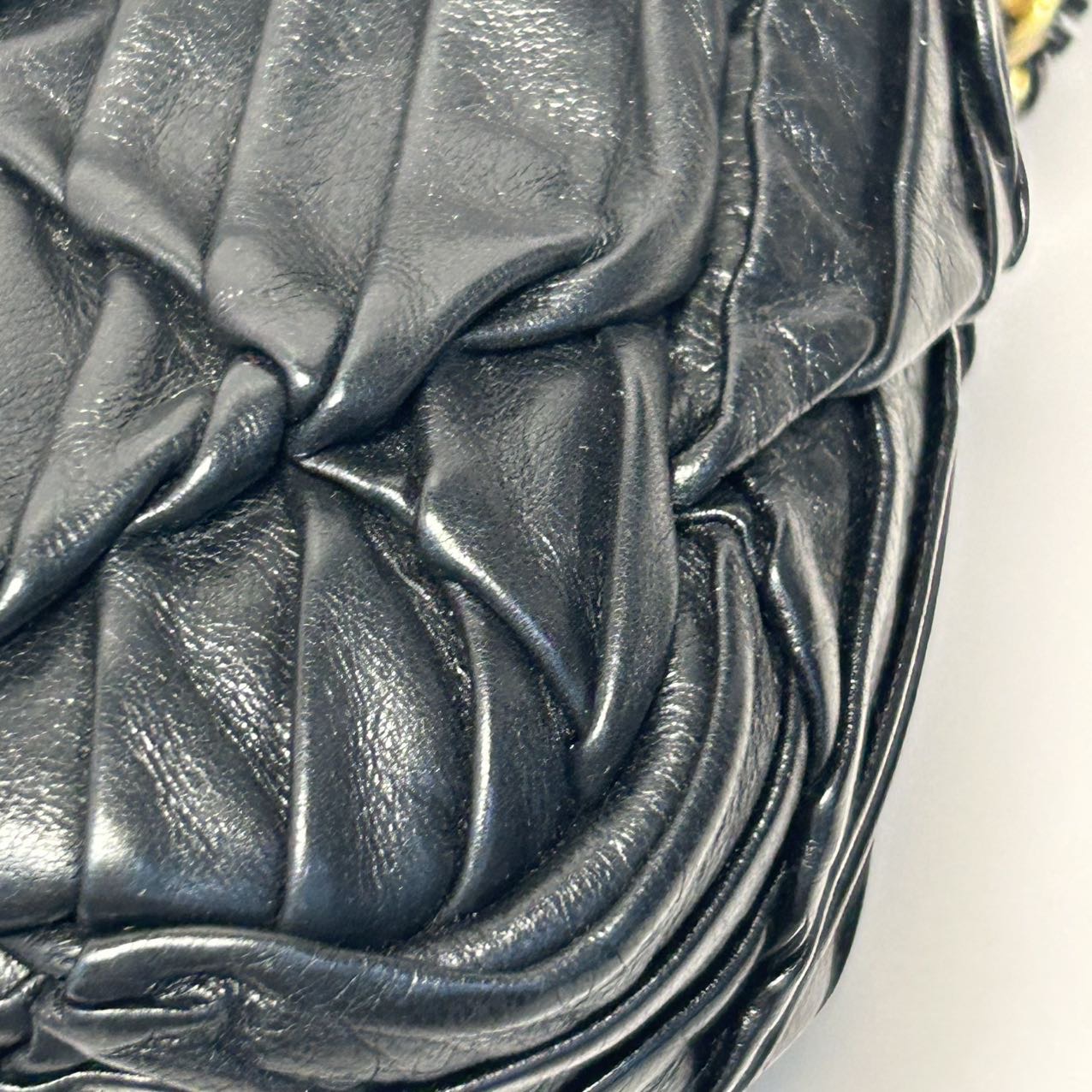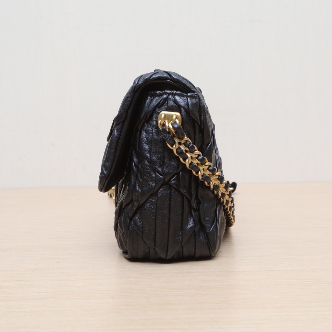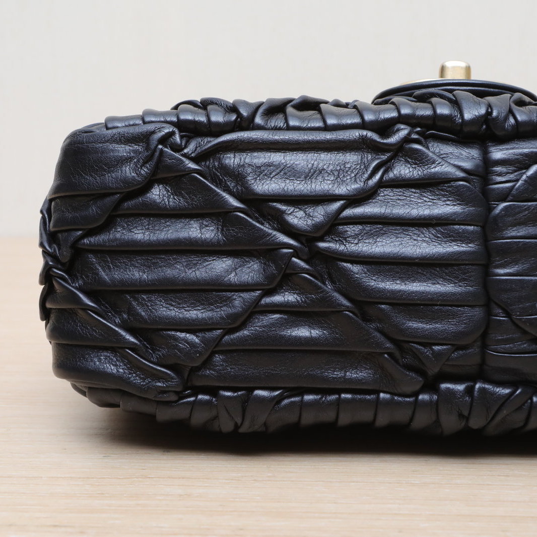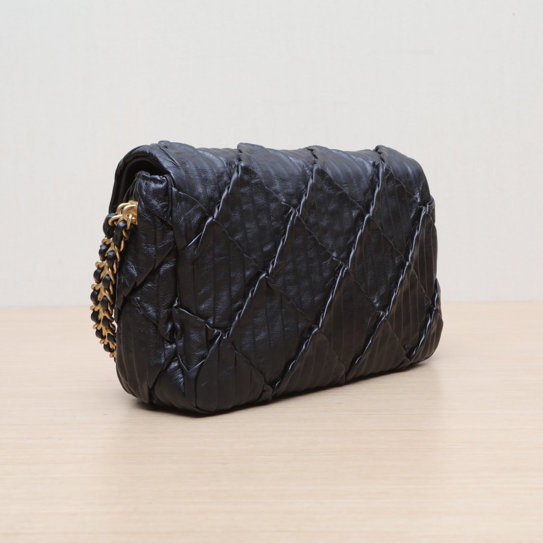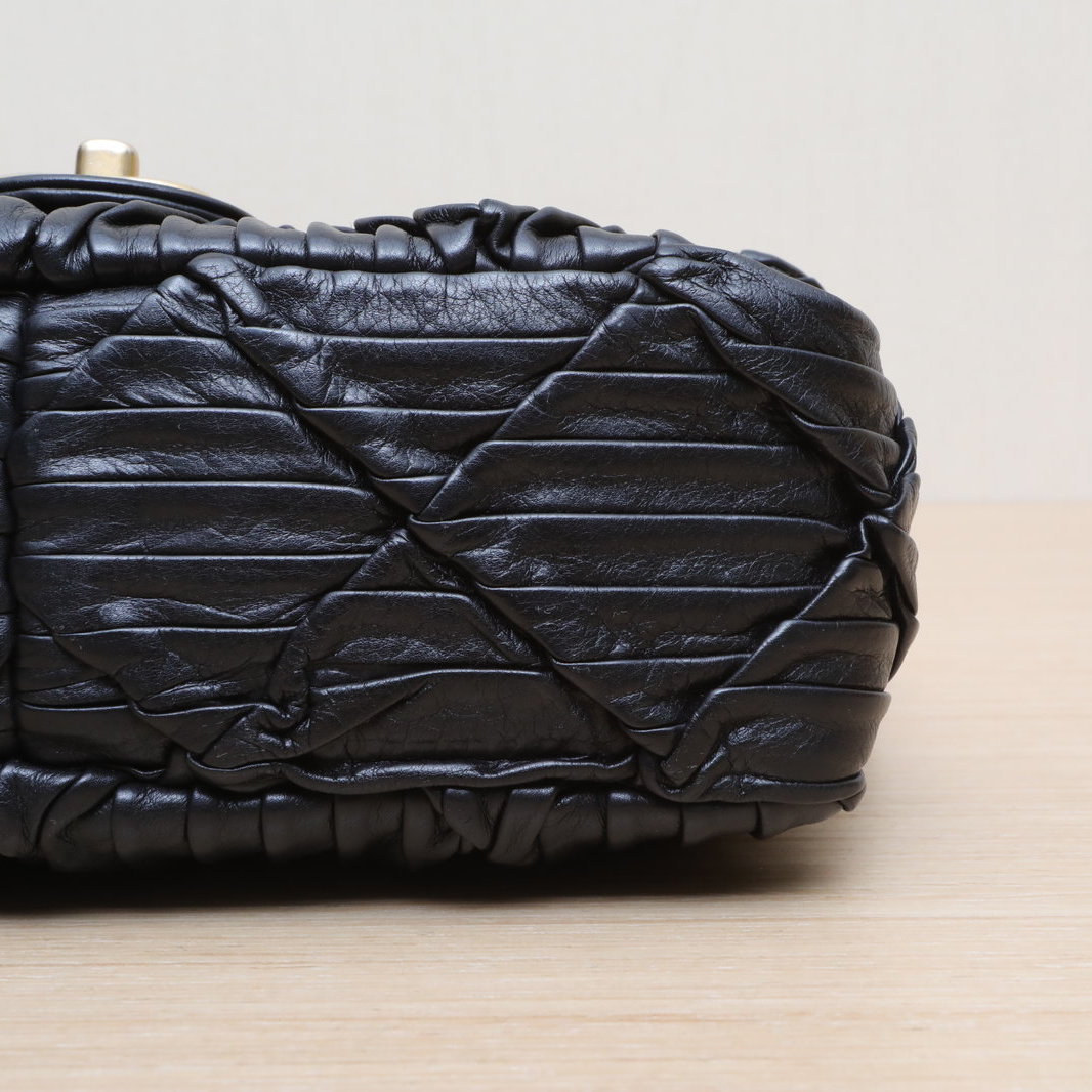 Crafted from black leather with crinkled diamond-quilted pattern and iconic CC logo, this 21A CF flap bag features a gold coin double chain strap, a limited-edition Chanel piece.