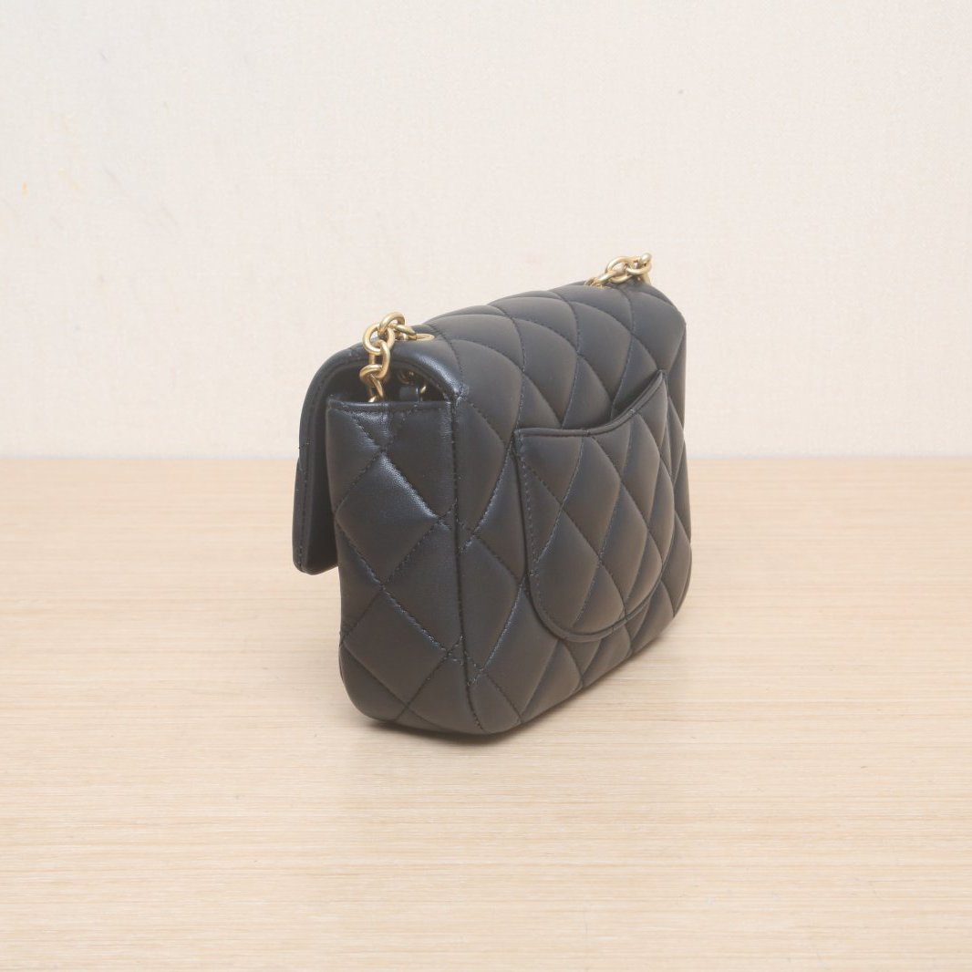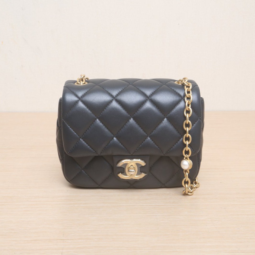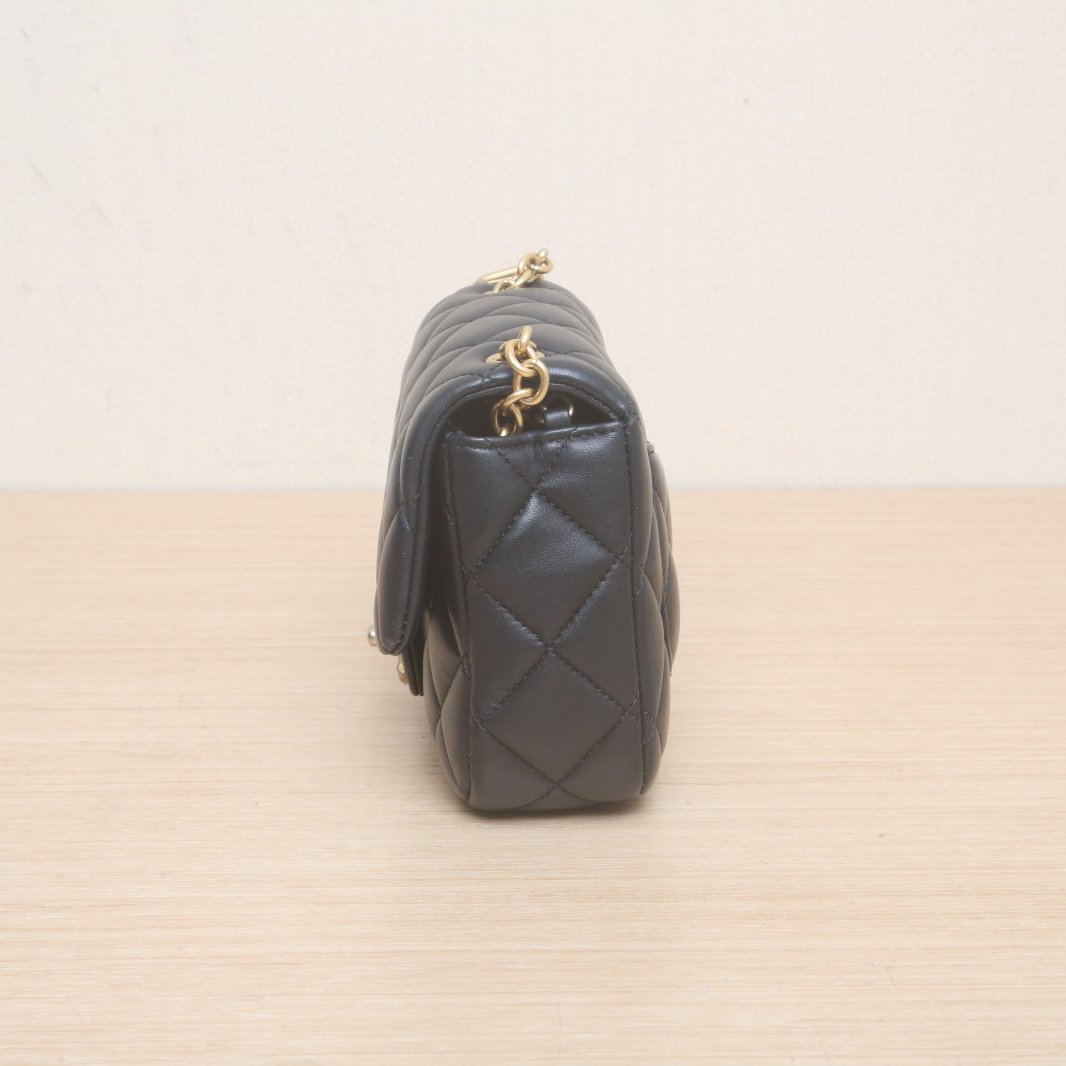 Crafted from quilted leather with iconic enamel turnlock hardware, this compact flap bag features a chain strap.