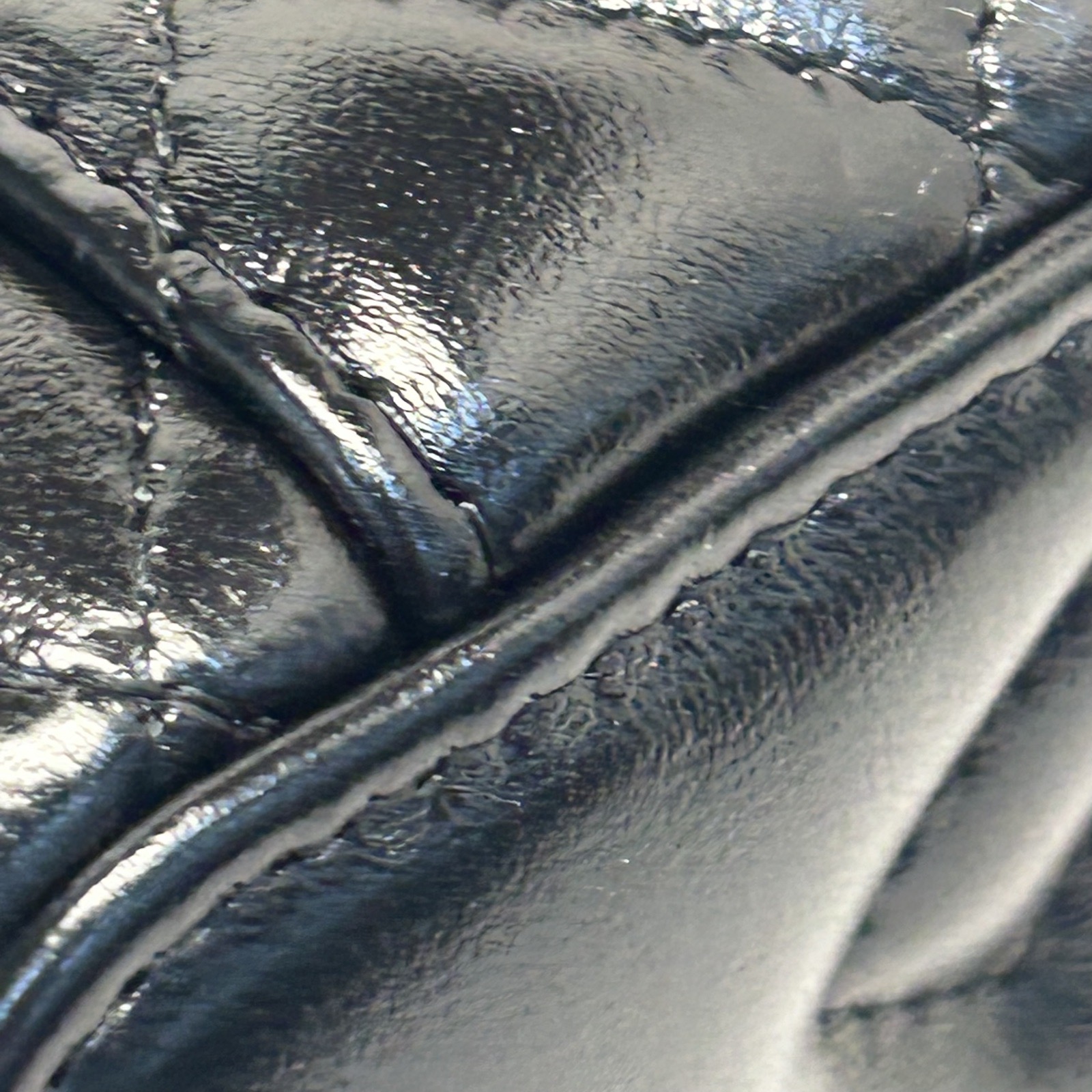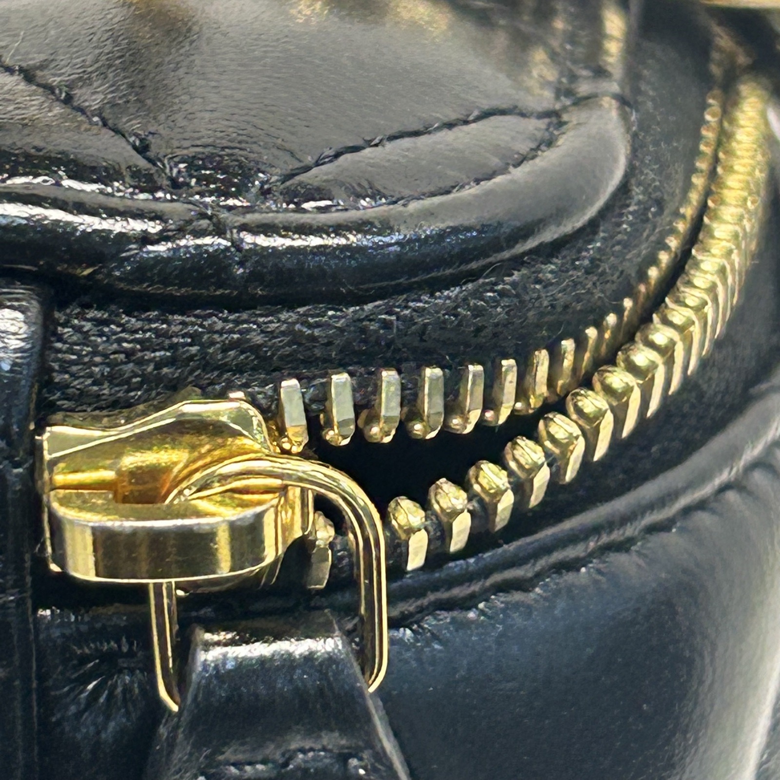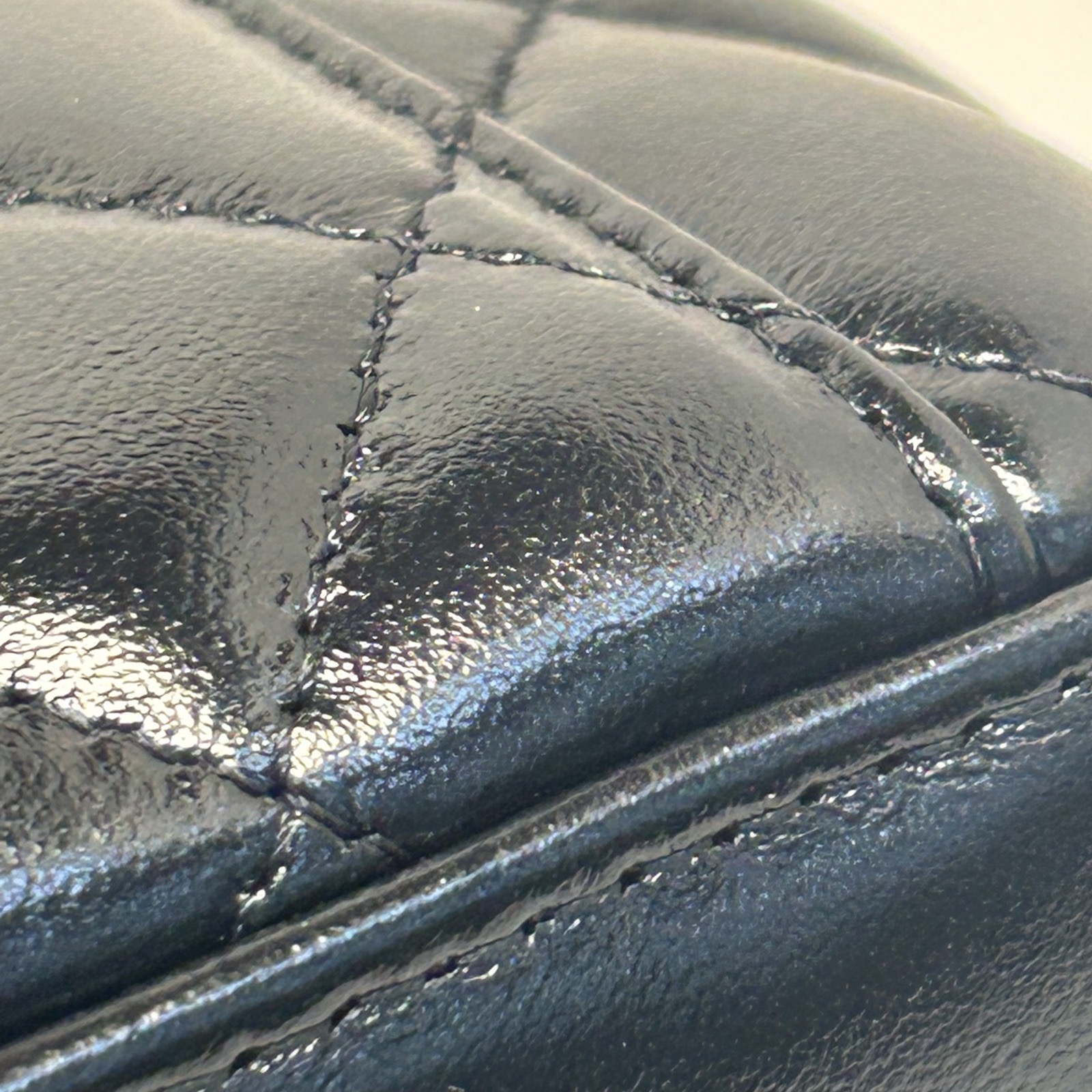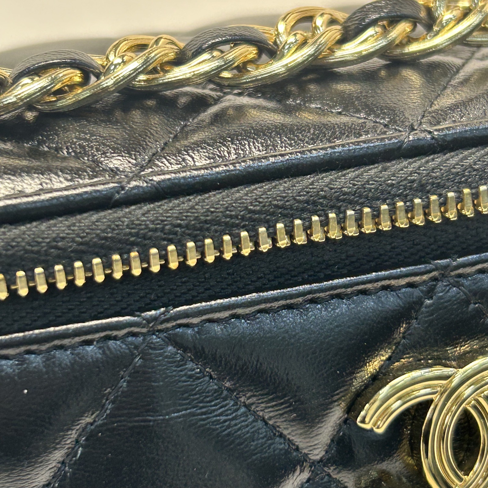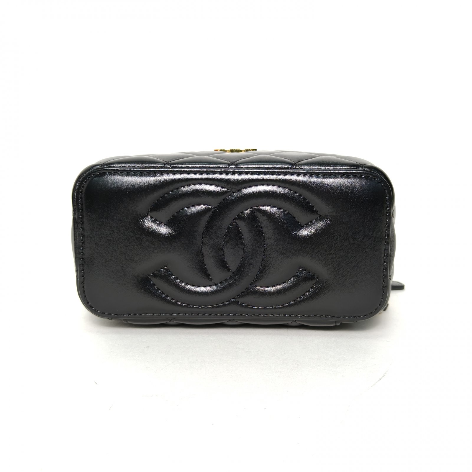 Made from black leather with quilted pattern and iconic CC logo, this long vanity case features a top handle, built-in mirror and chain strap, offering compact, stylish storage.
