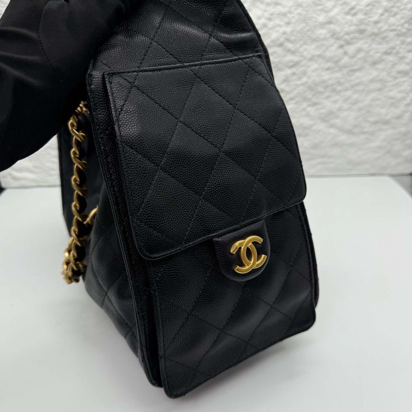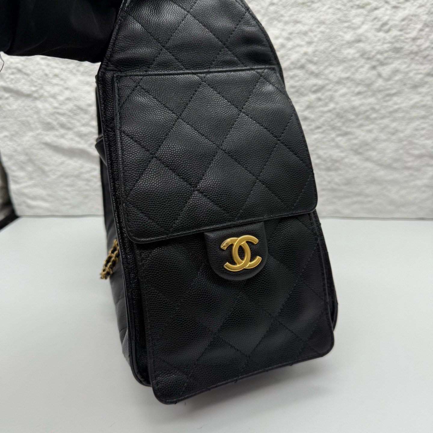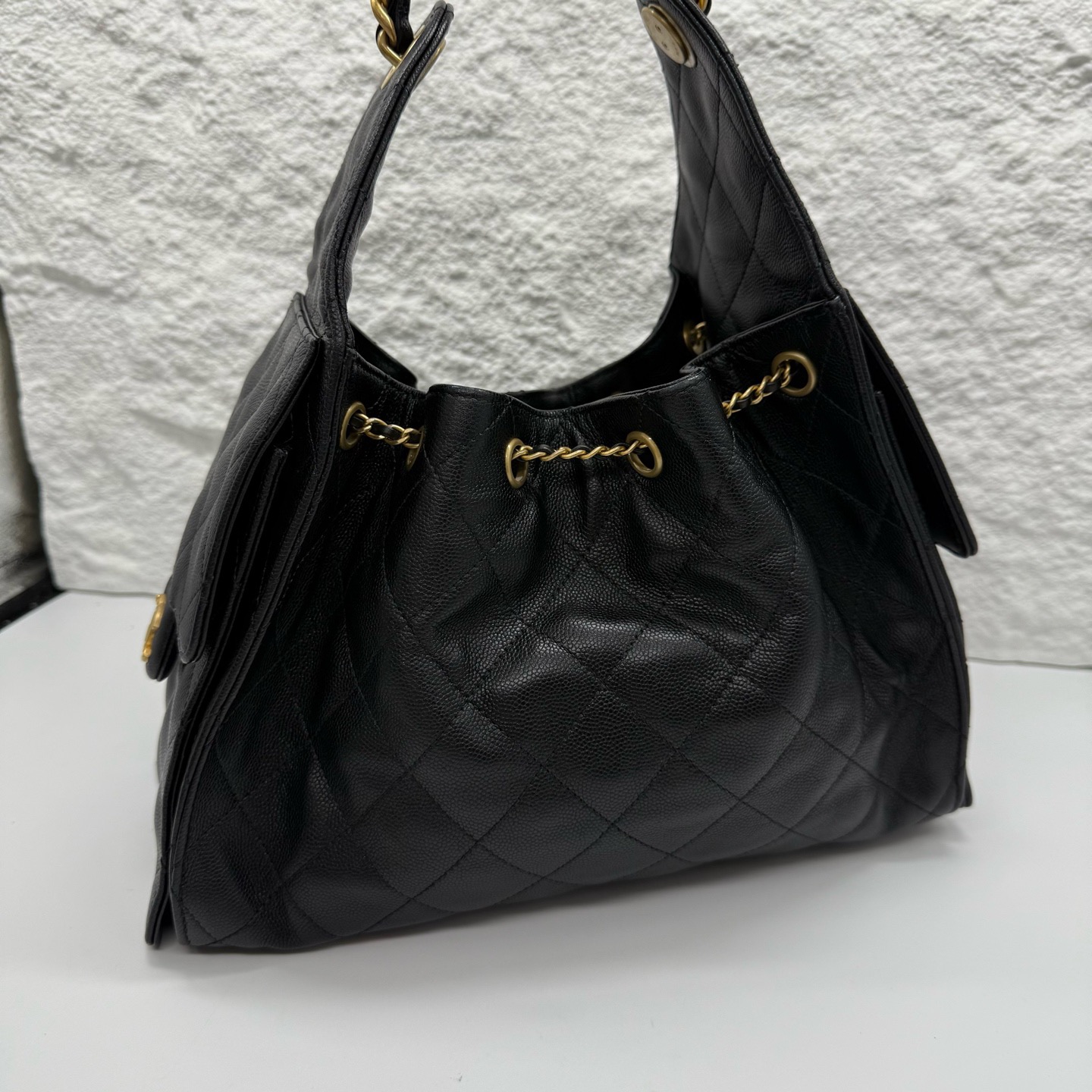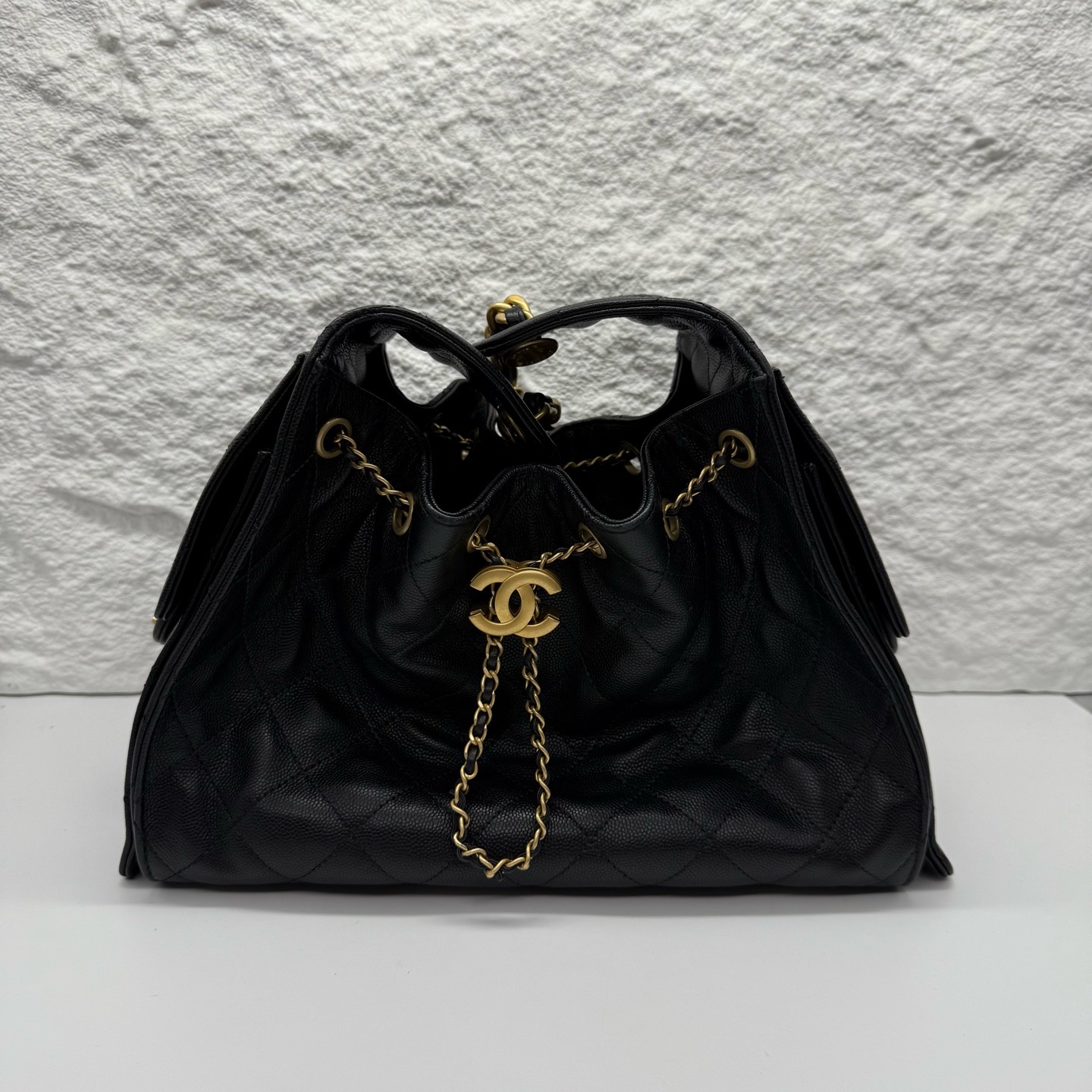Crafted from premium leather with classic diamond quilting and gold-tone CC hardware, this 25bag drawstring bucket bag features a detachable chain strap, a timeless luxury icon.