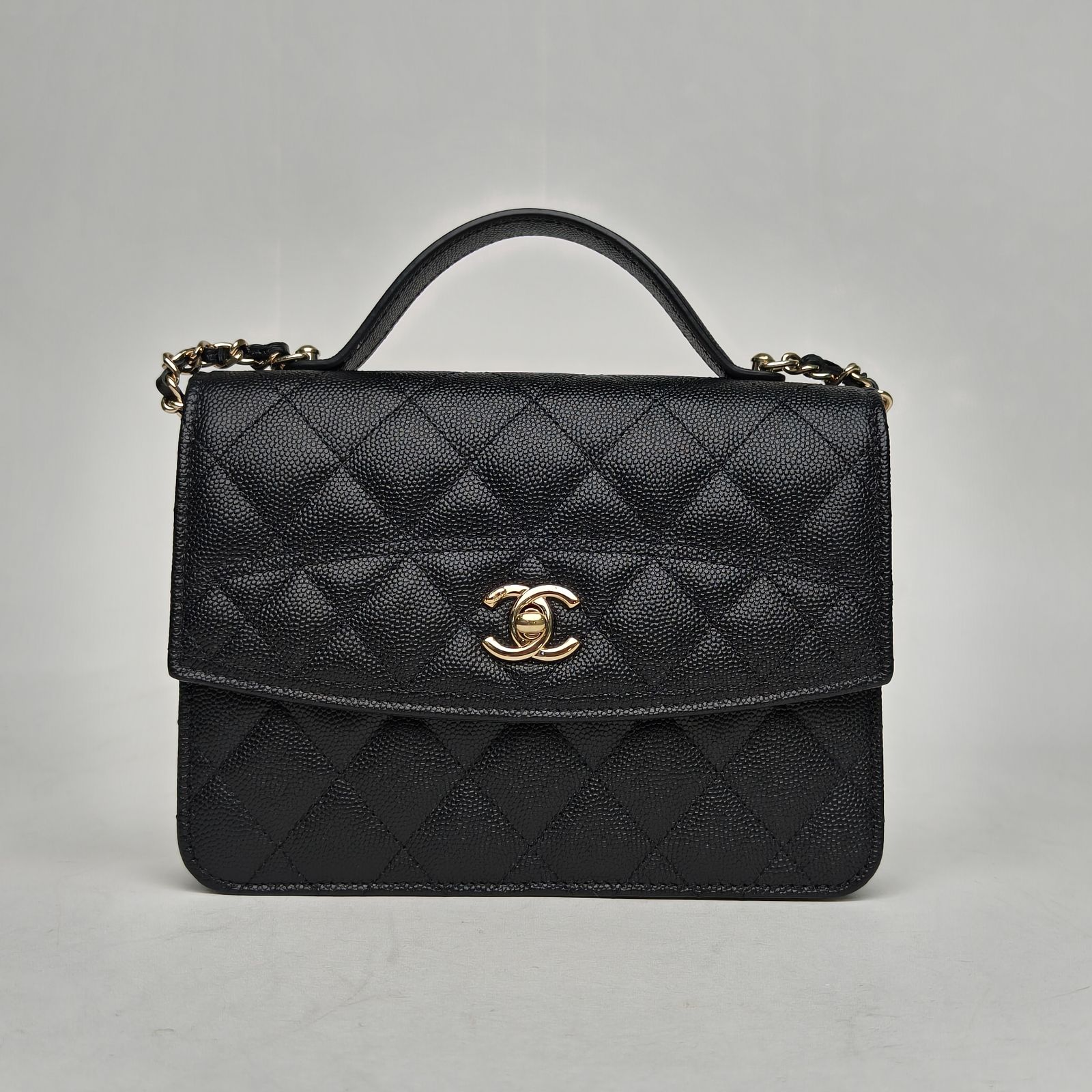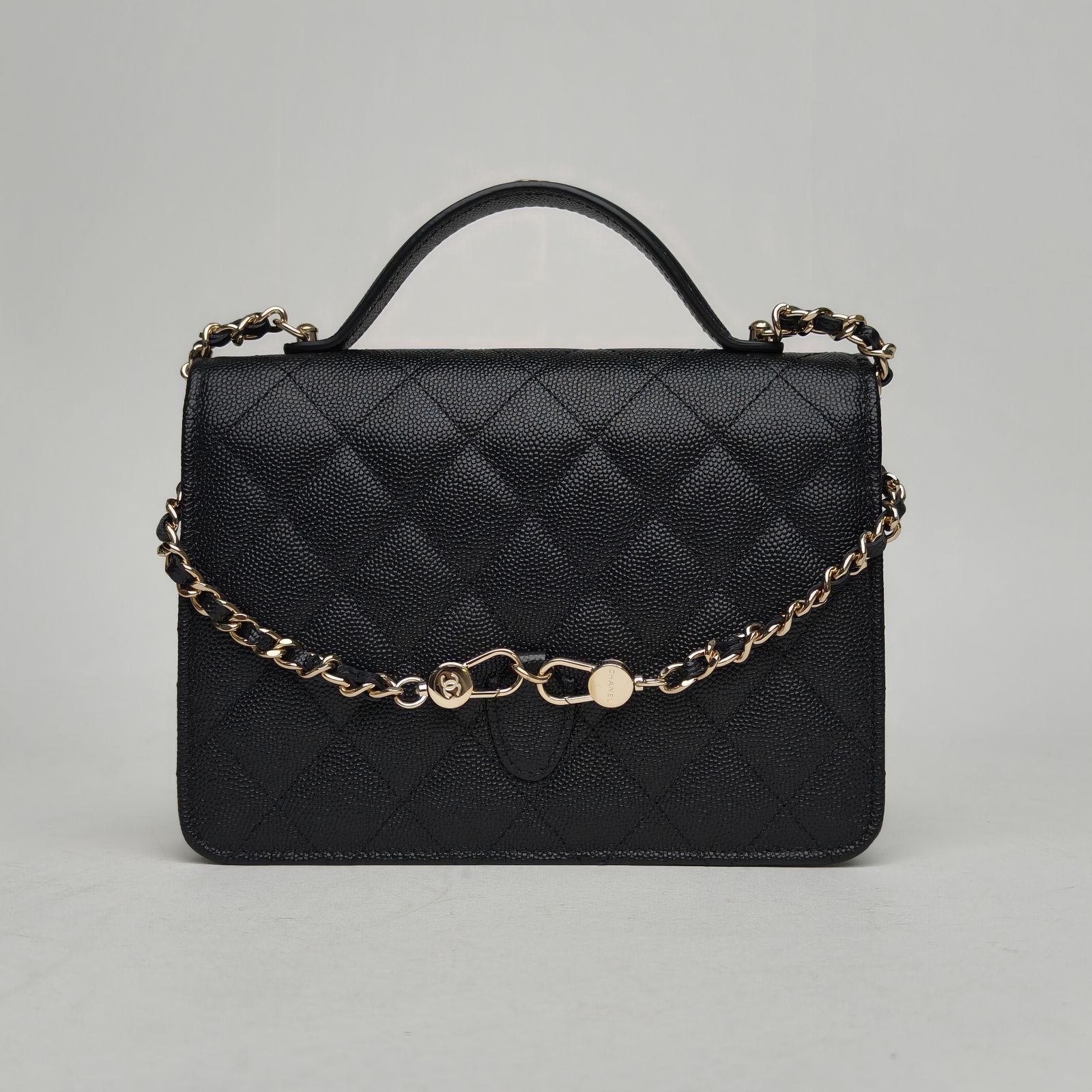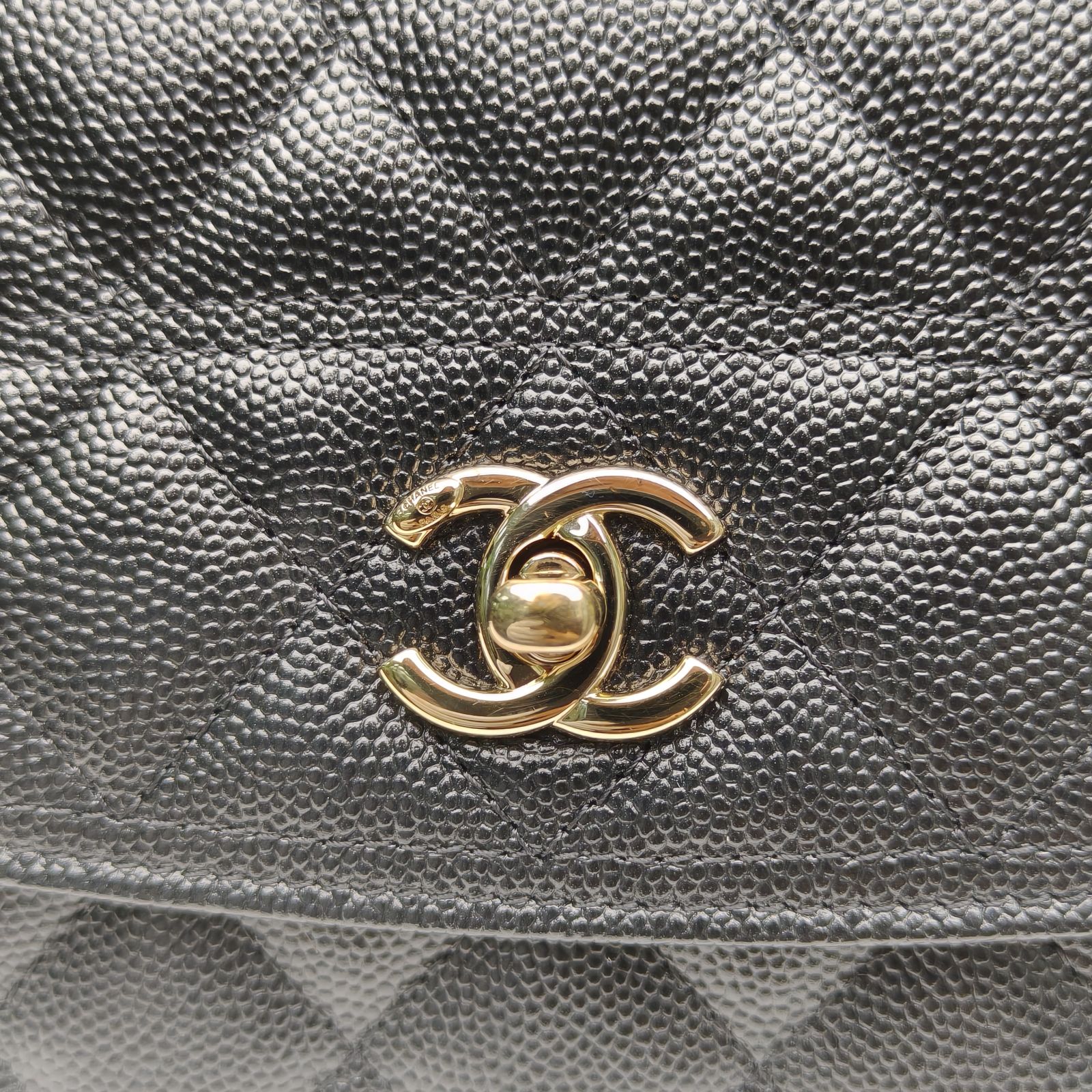 Crafted from black caviar leather with diamond quilting and CC hardware, this 25C accordion backpack features a top handle and chain strap, a unique luxury piece.