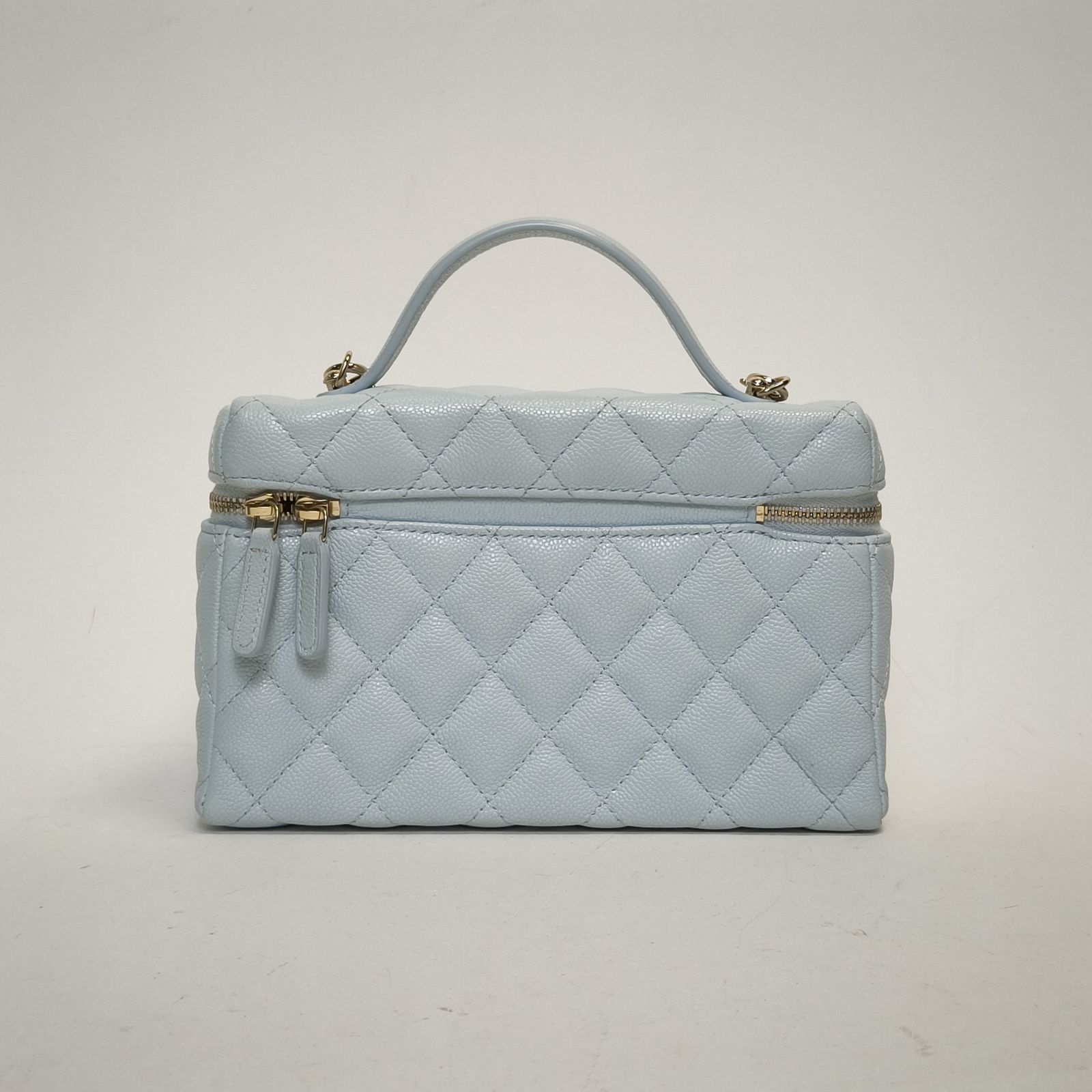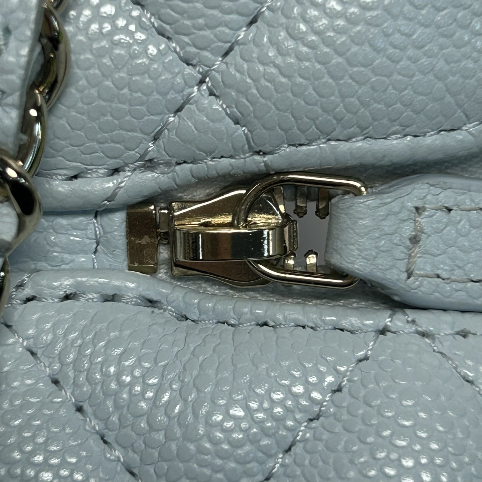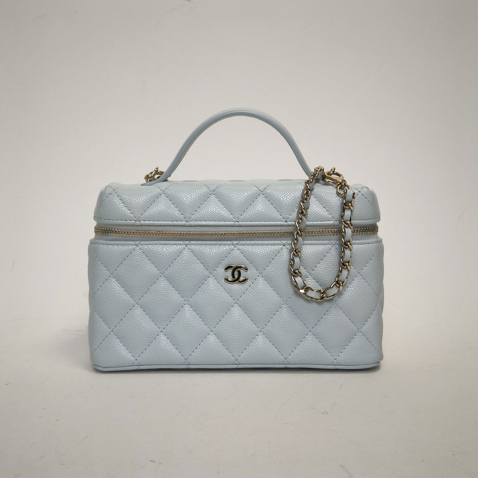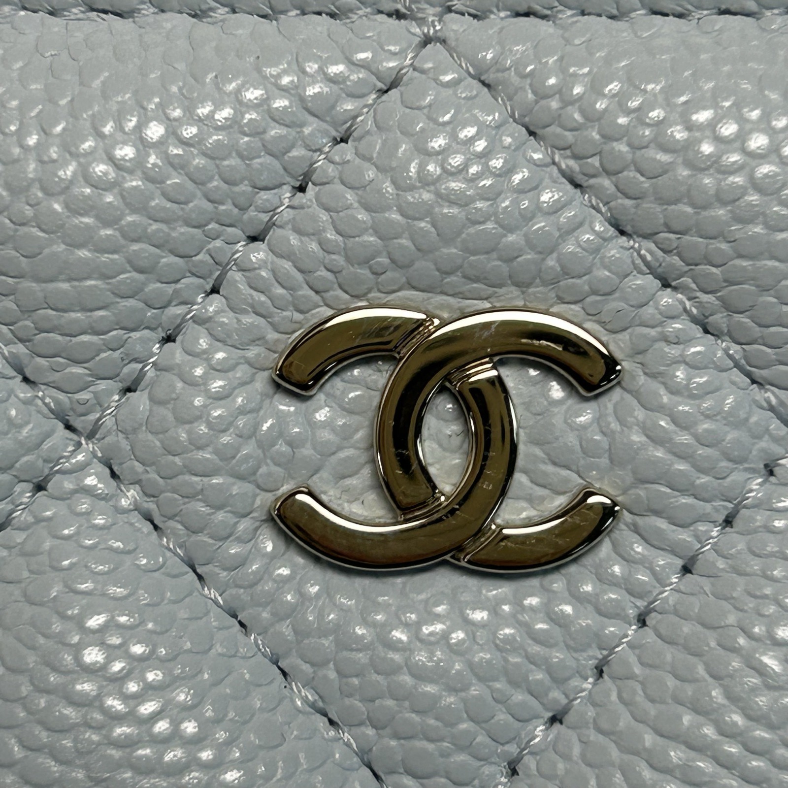 Made from baby blue caviar leather with classic quilting and light gold-tone CC hardware, this 25C lunch box bag features a top handle and detachable strap, a stylish daily luxury piece.