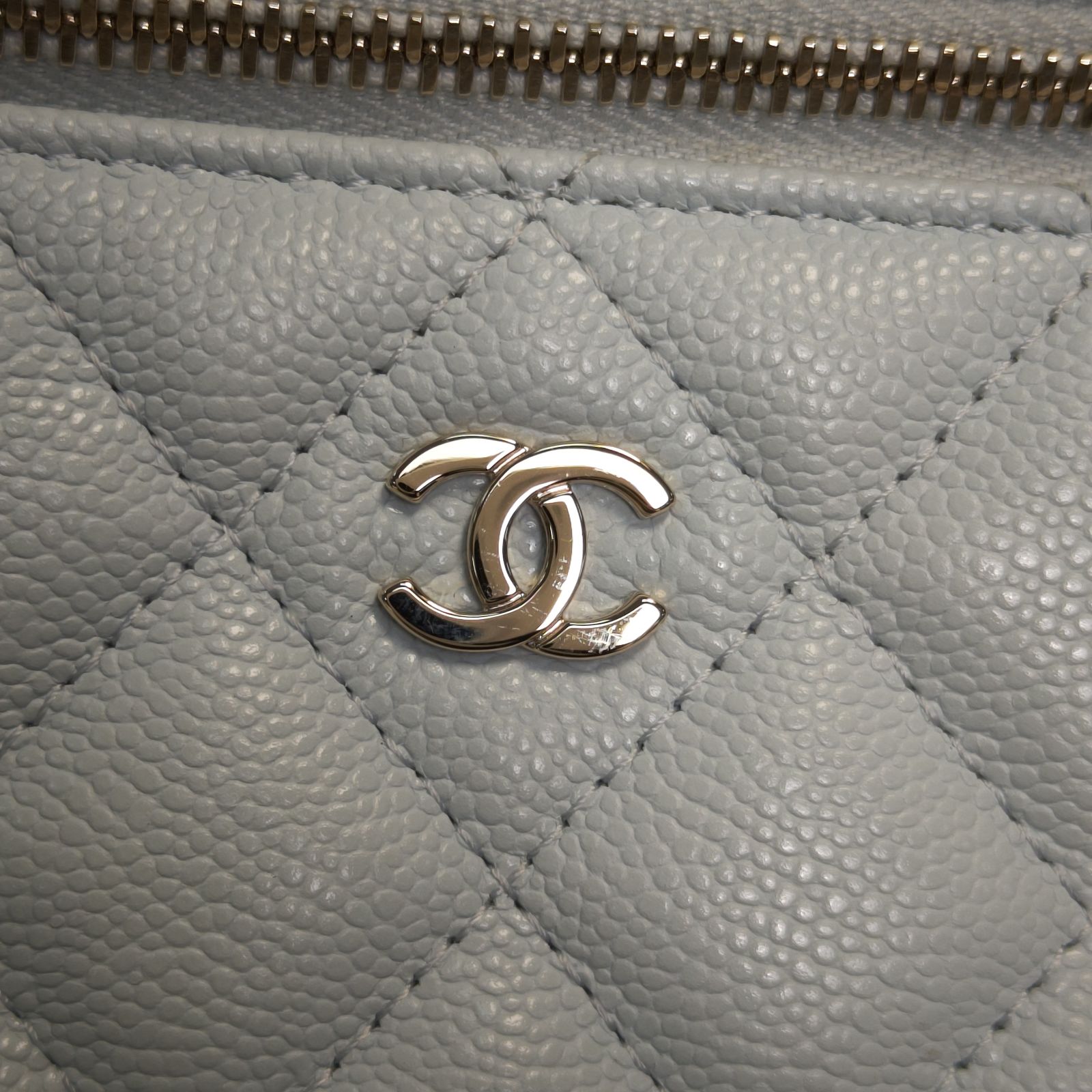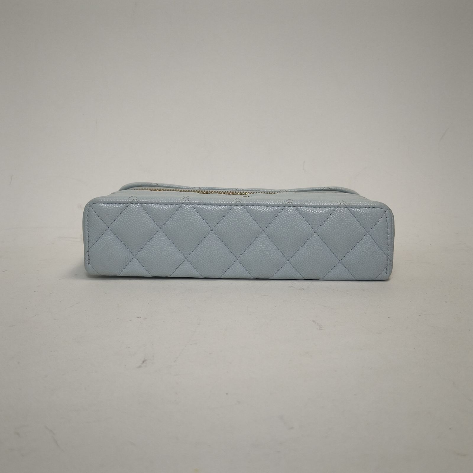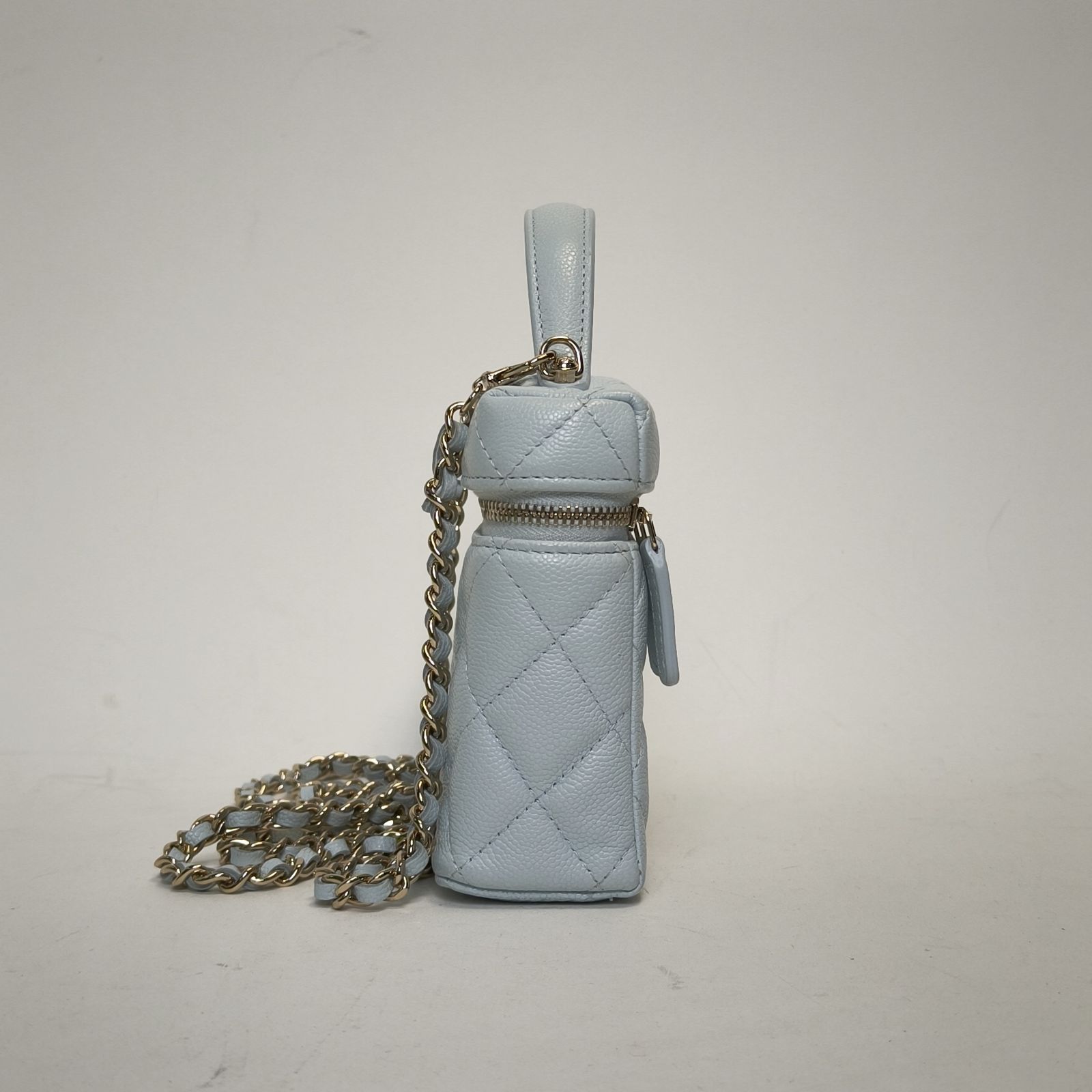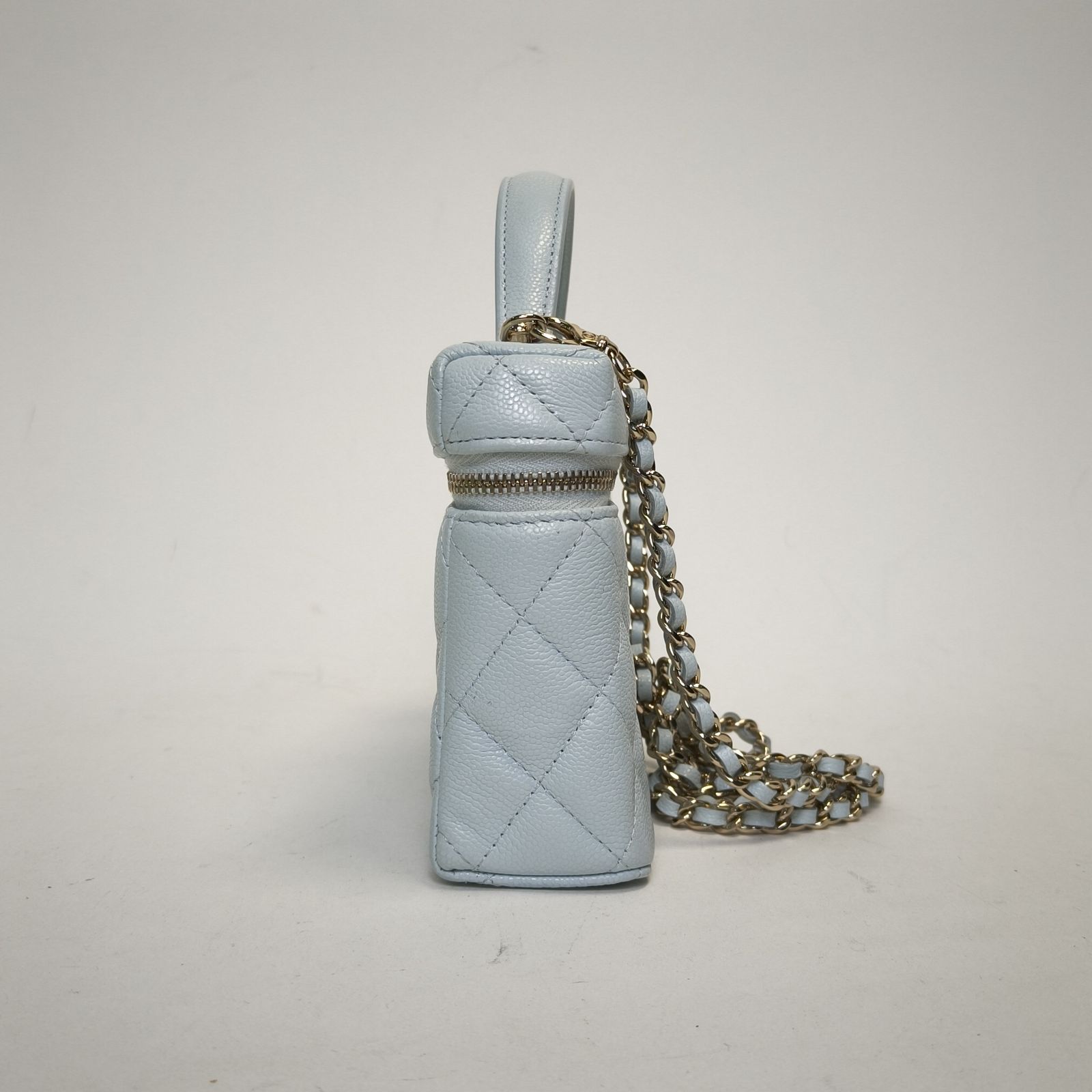 Made from baby blue caviar leather with classic quilting and light gold-tone CC hardware, this 25C lunch box bag features a top handle and detachable strap, a stylish daily luxury piece.