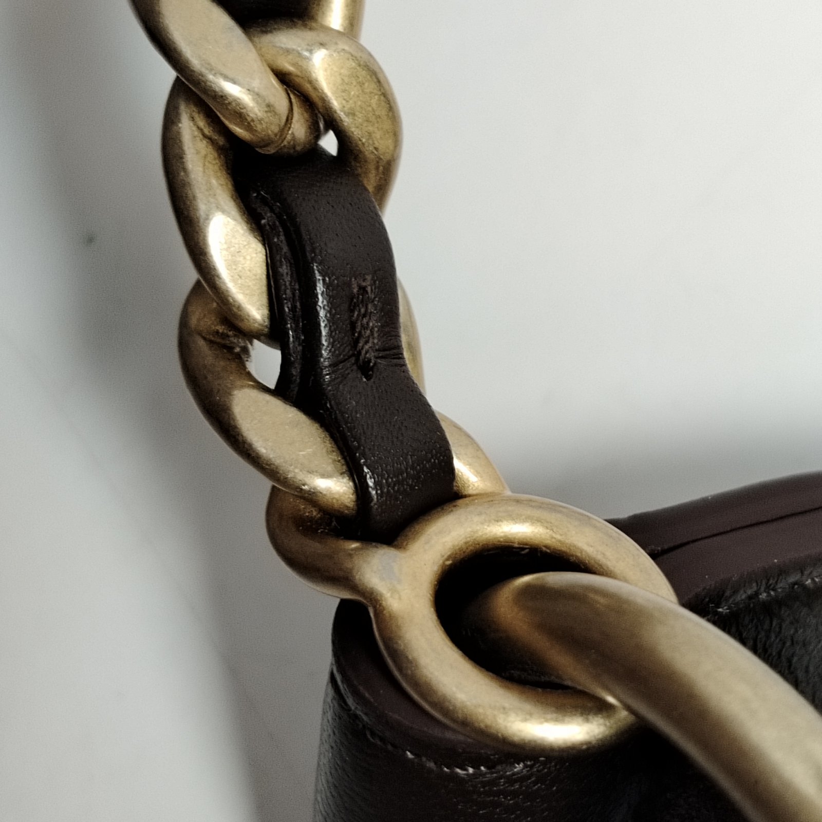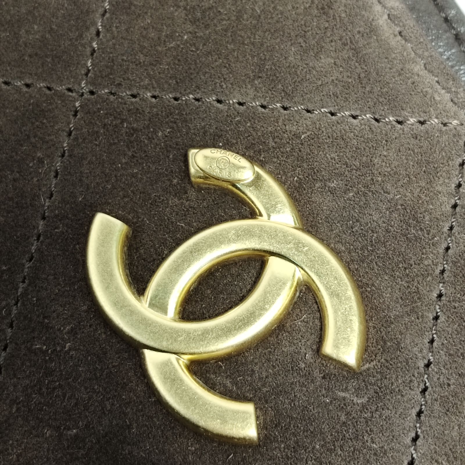 Chanel 26C Hobo Bag features a soft brown suede body with a signature gold chain strap and interlocking CC logo. Crafted in Italy, it offers versatile underarm and crossbody wear, with a size of 33cm*12cm*23cm that holds daily essentials. The rich brown suede and gold hardware embody Chanel’s vintage and sophisticated luxury.