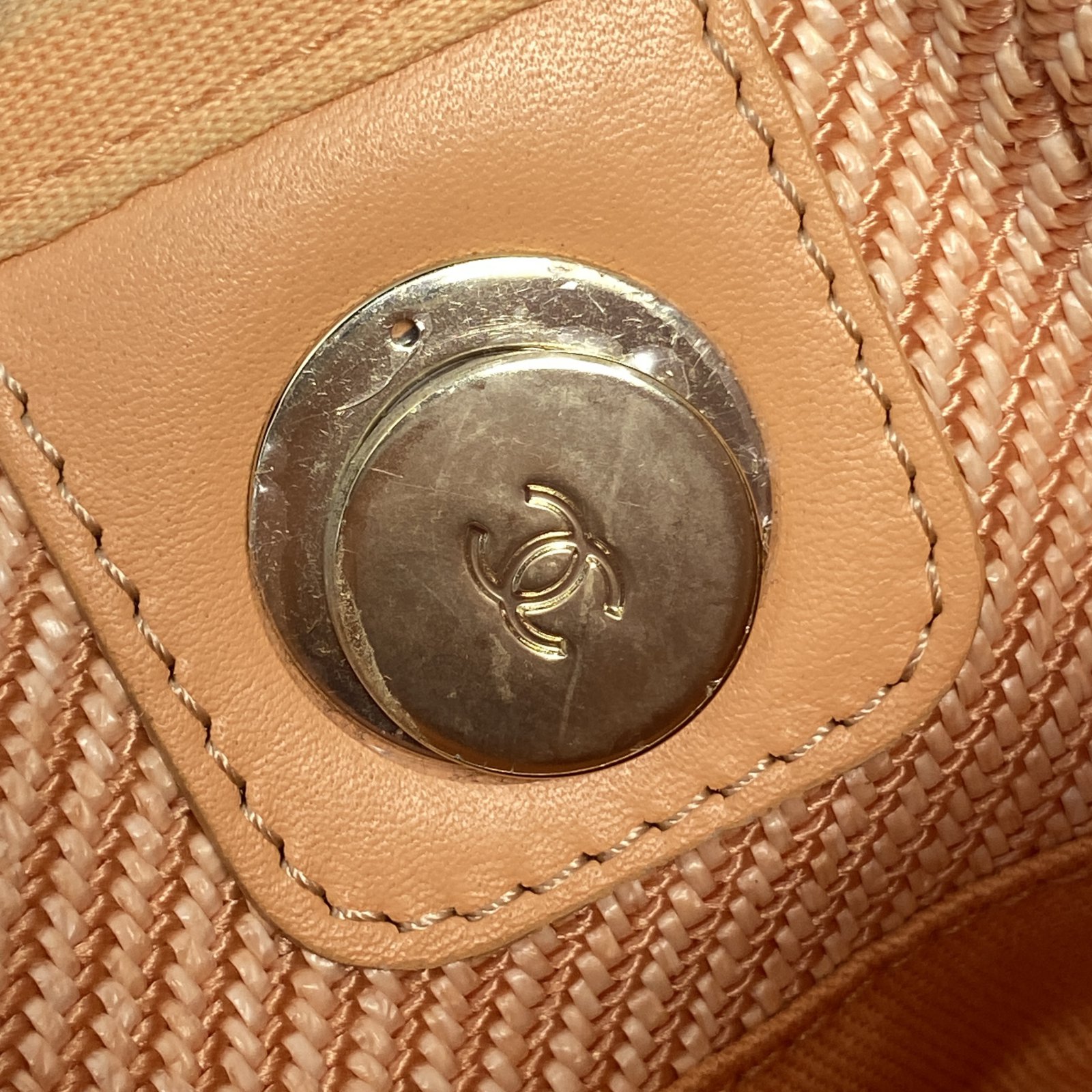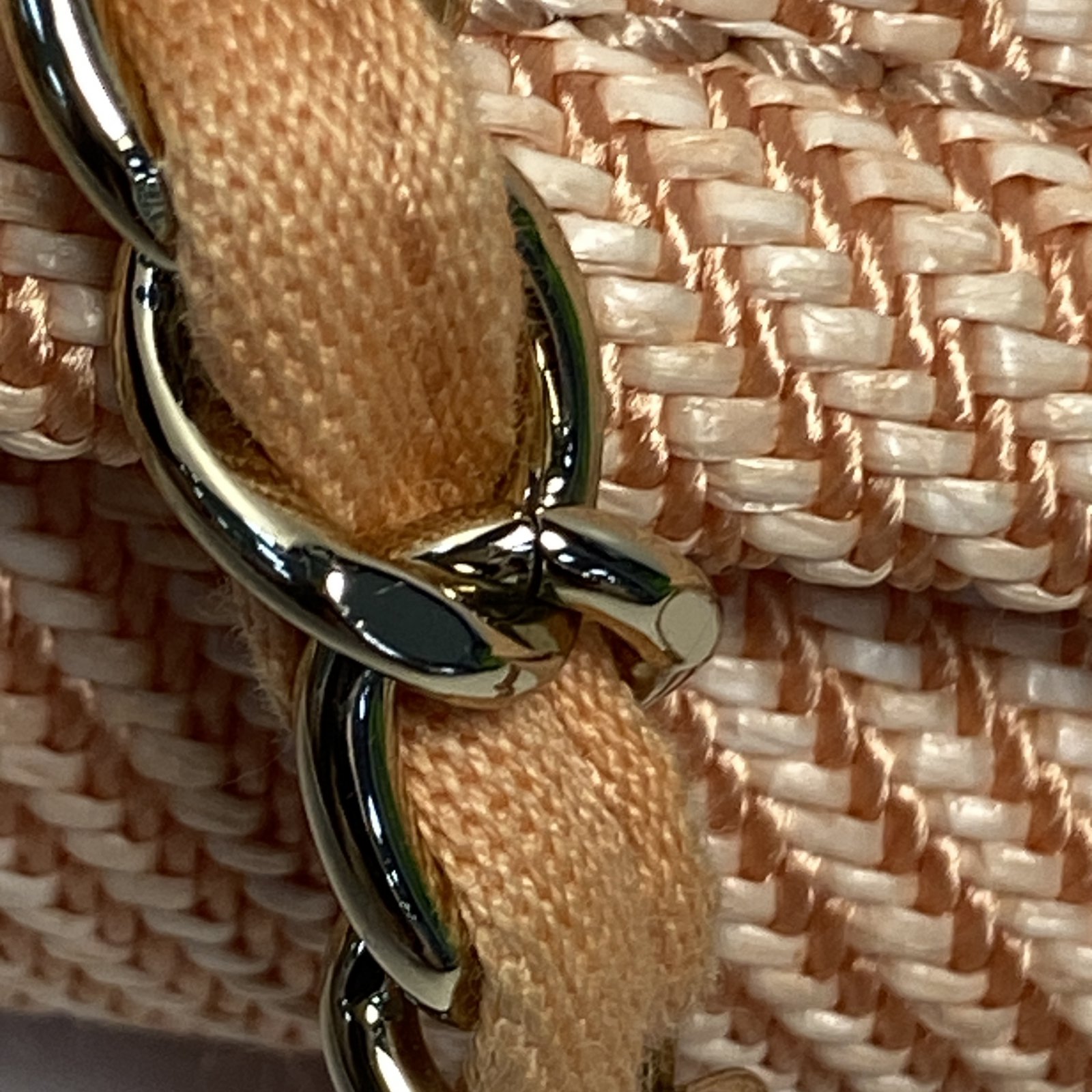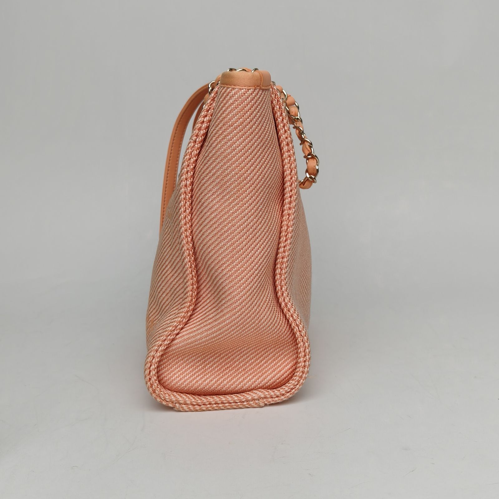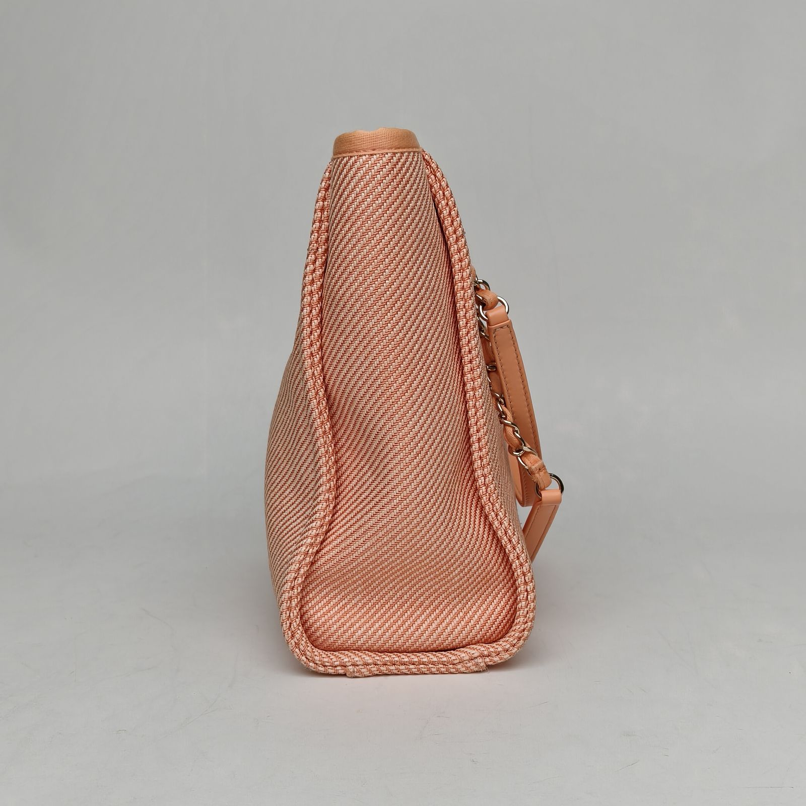 Made from orange canvas with iconic CHANEL logo, this beach tote small bag features a chain strap, a stylish daily piece.