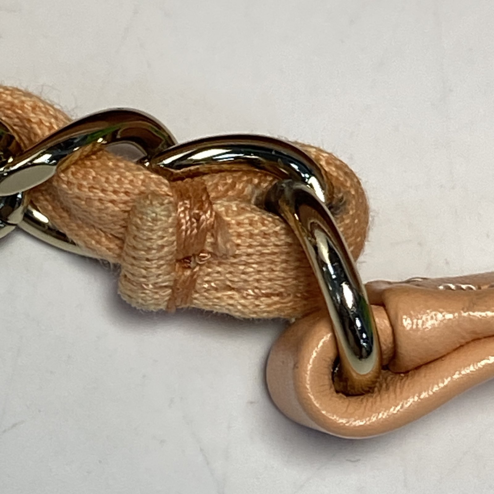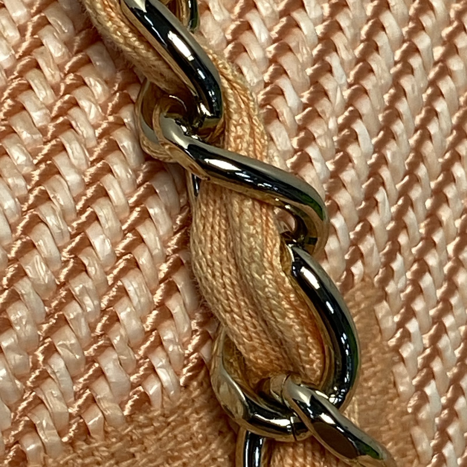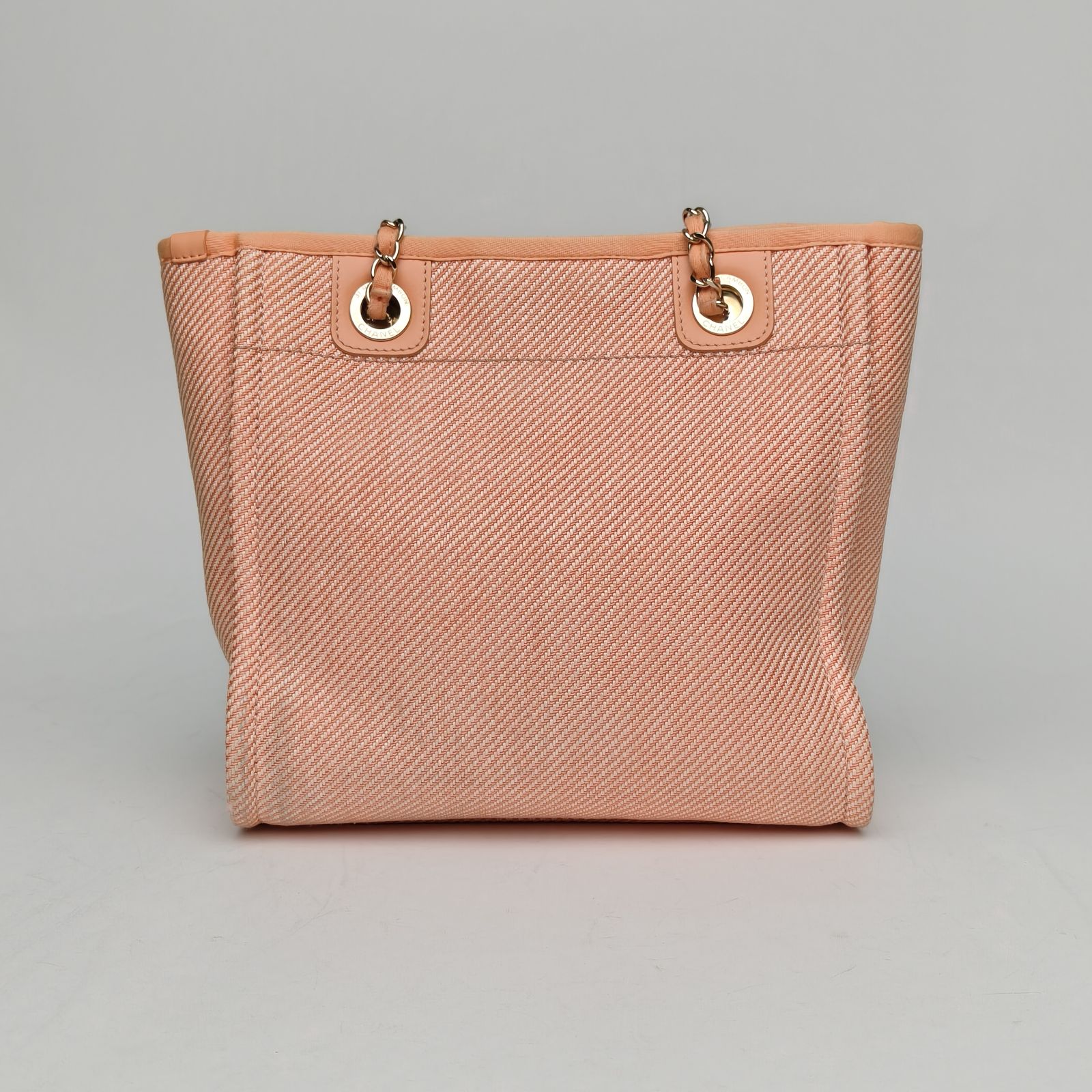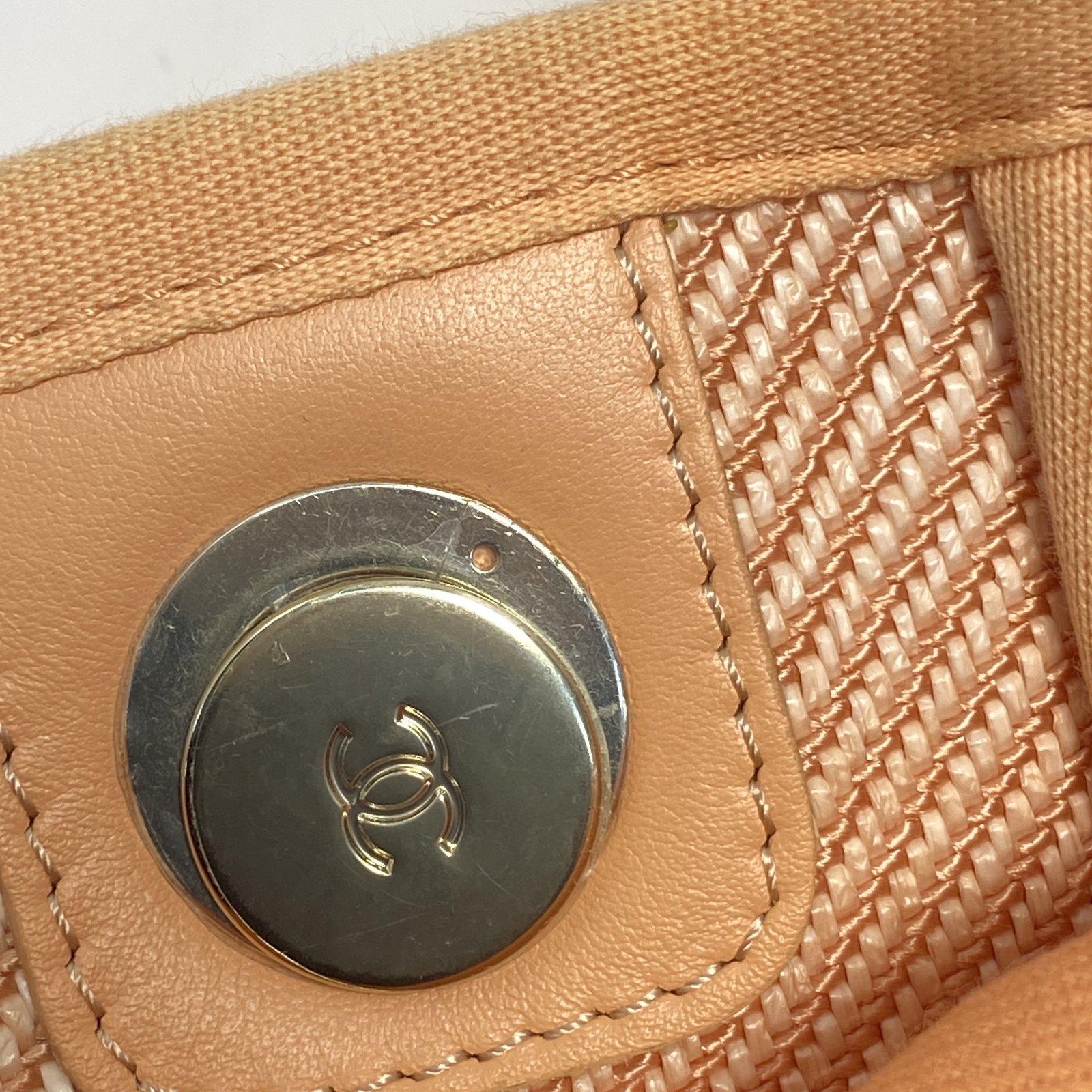 Made from orange canvas with iconic CHANEL logo, this beach tote small bag features a chain strap, a stylish daily piece.
