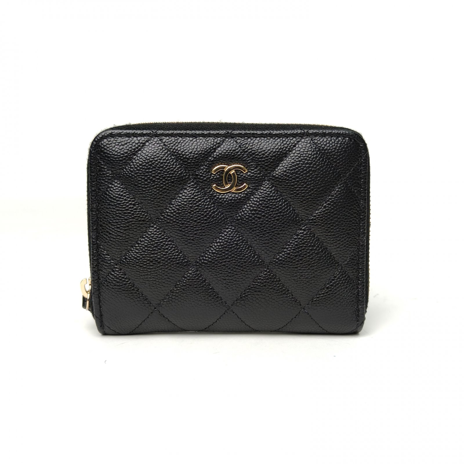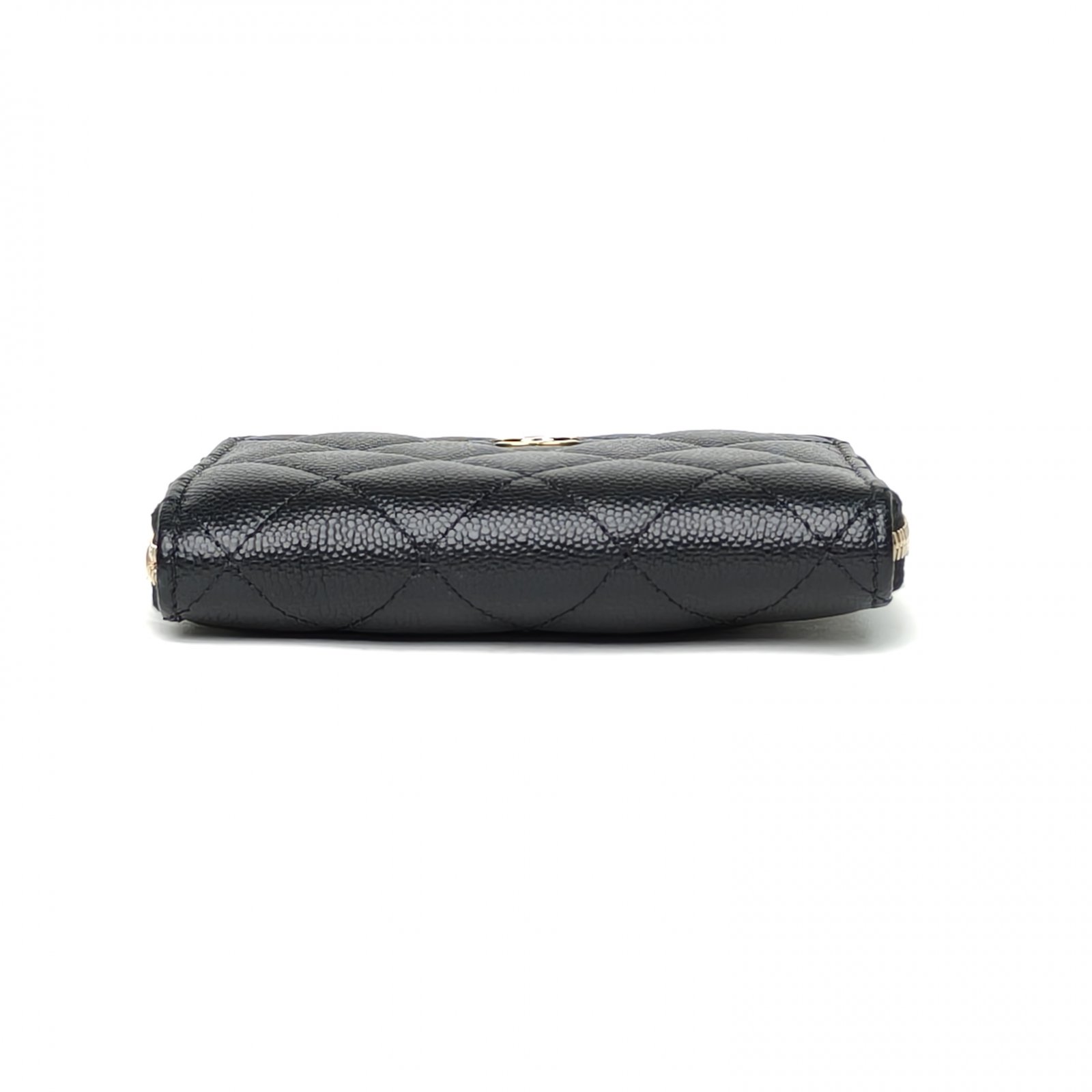 This Chanel zip card holder is crafted from black quilted leather with gold-tone hardware, featuring a compact silhouette for card storage.