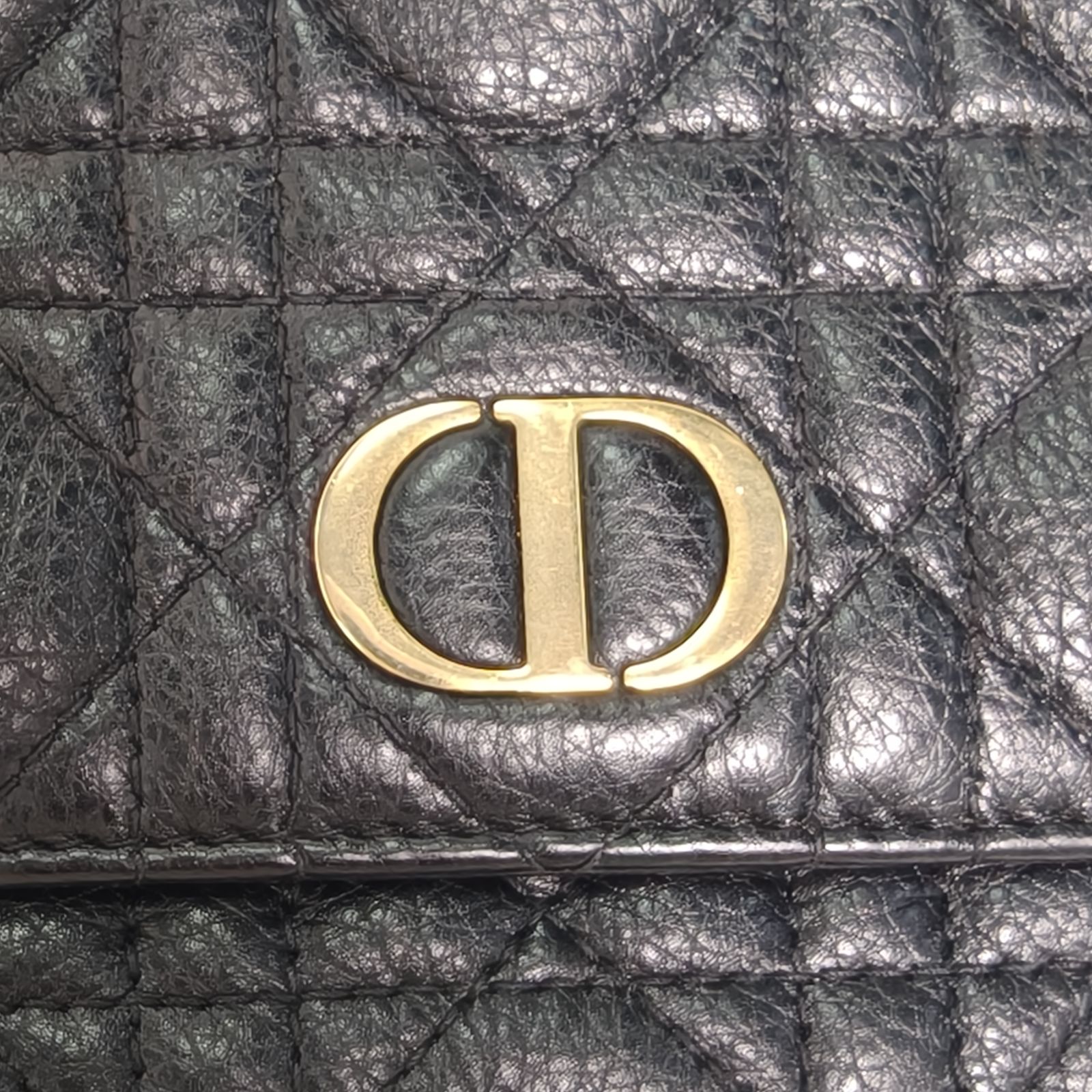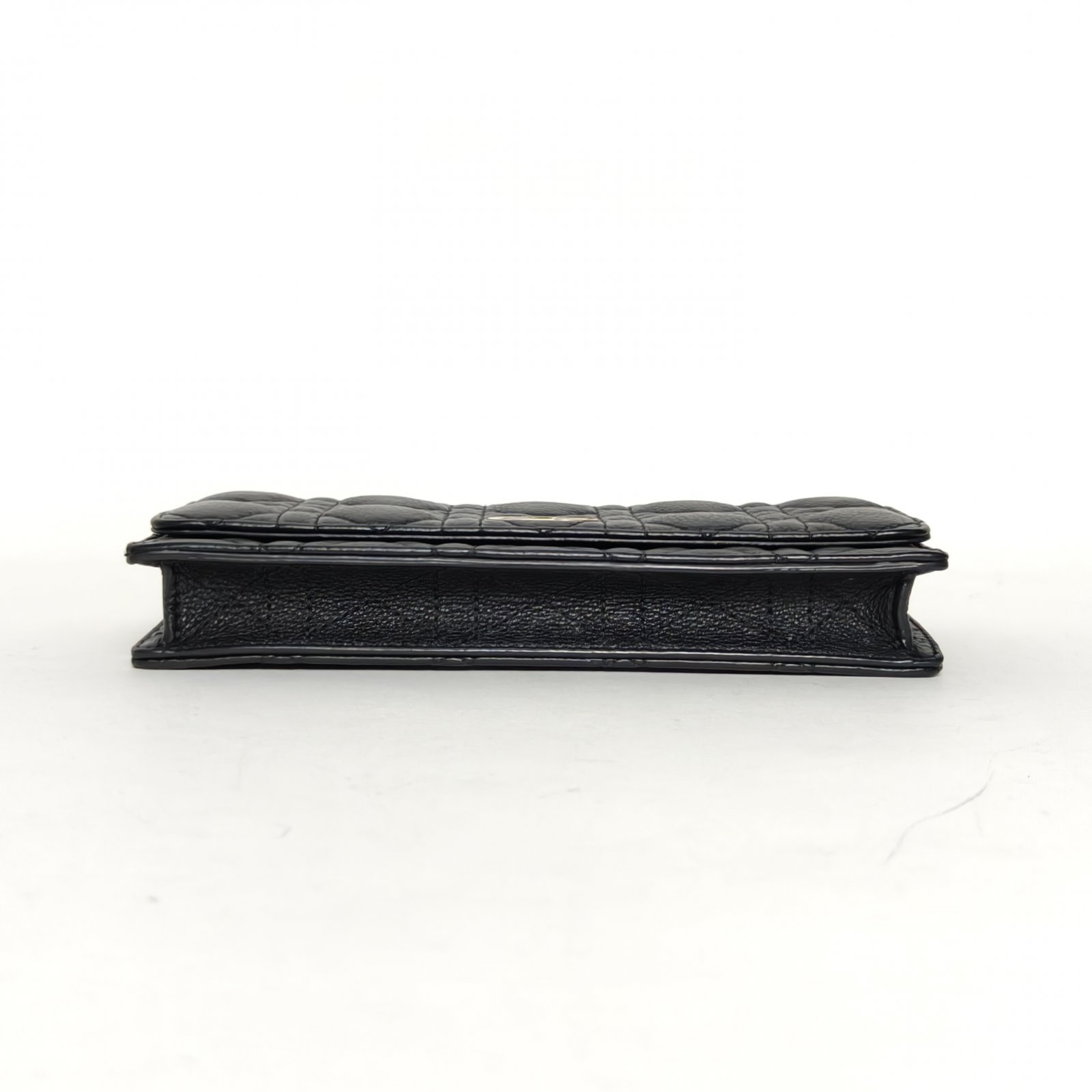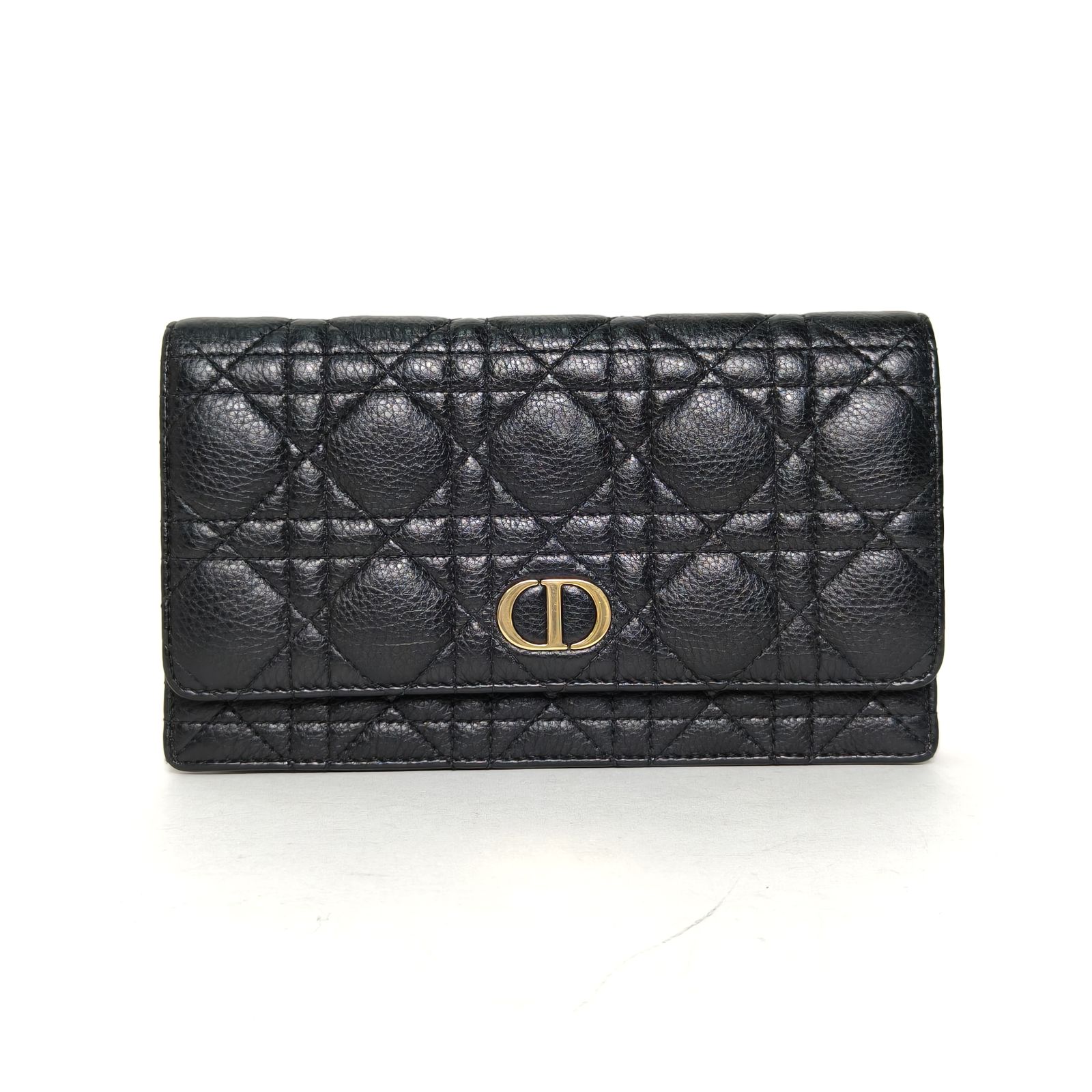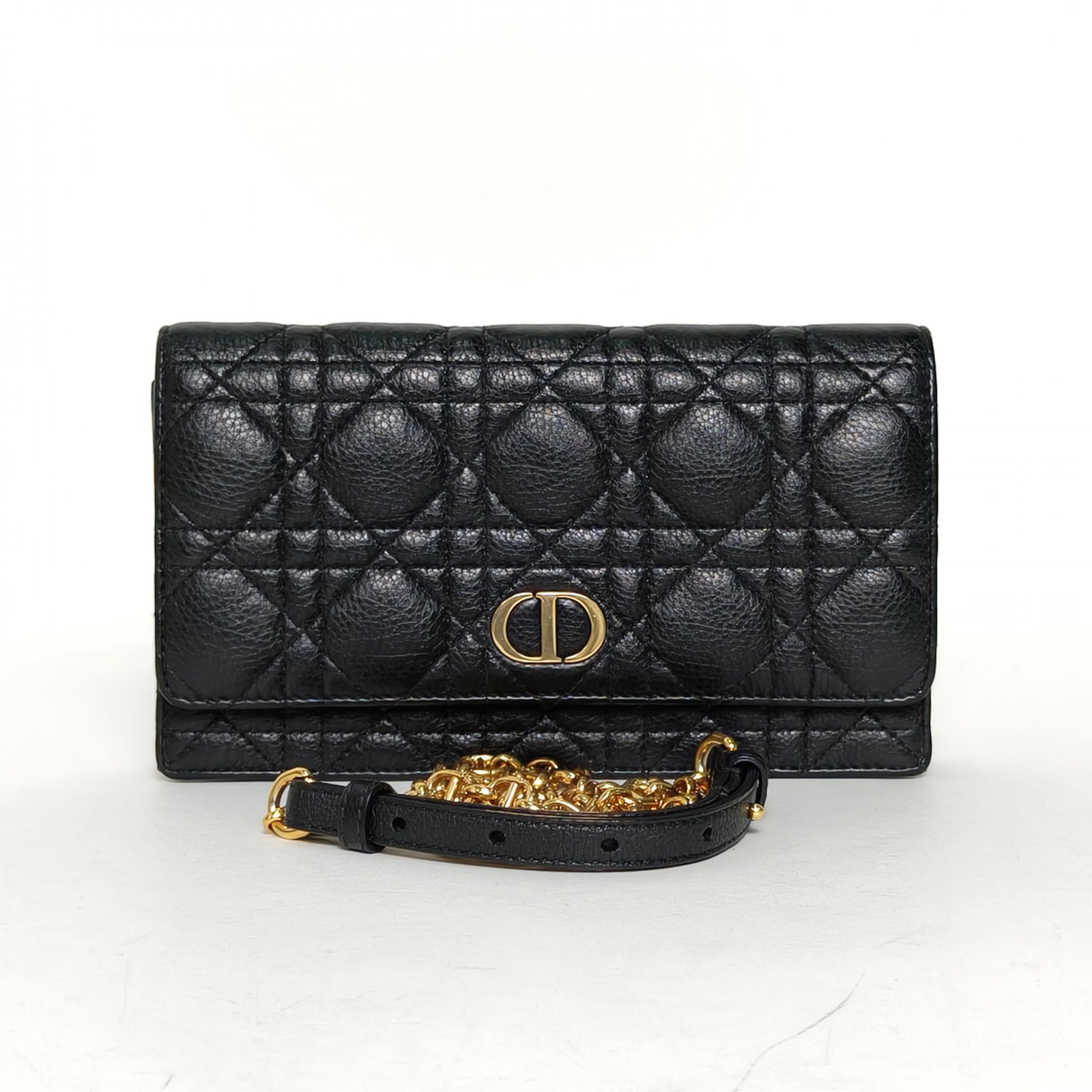 This Chanel Caro chain WOC is crafted from black leather with gold-tone hardware, featuring a quilted pattern and interlocking CD clasp.