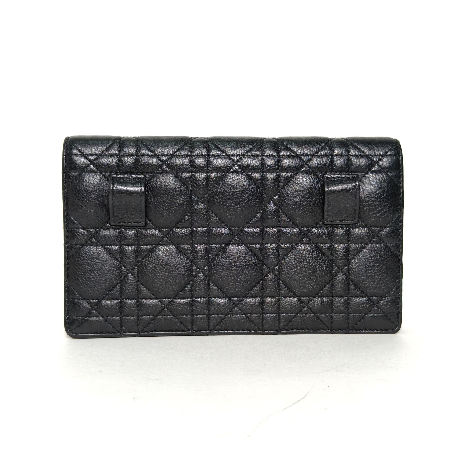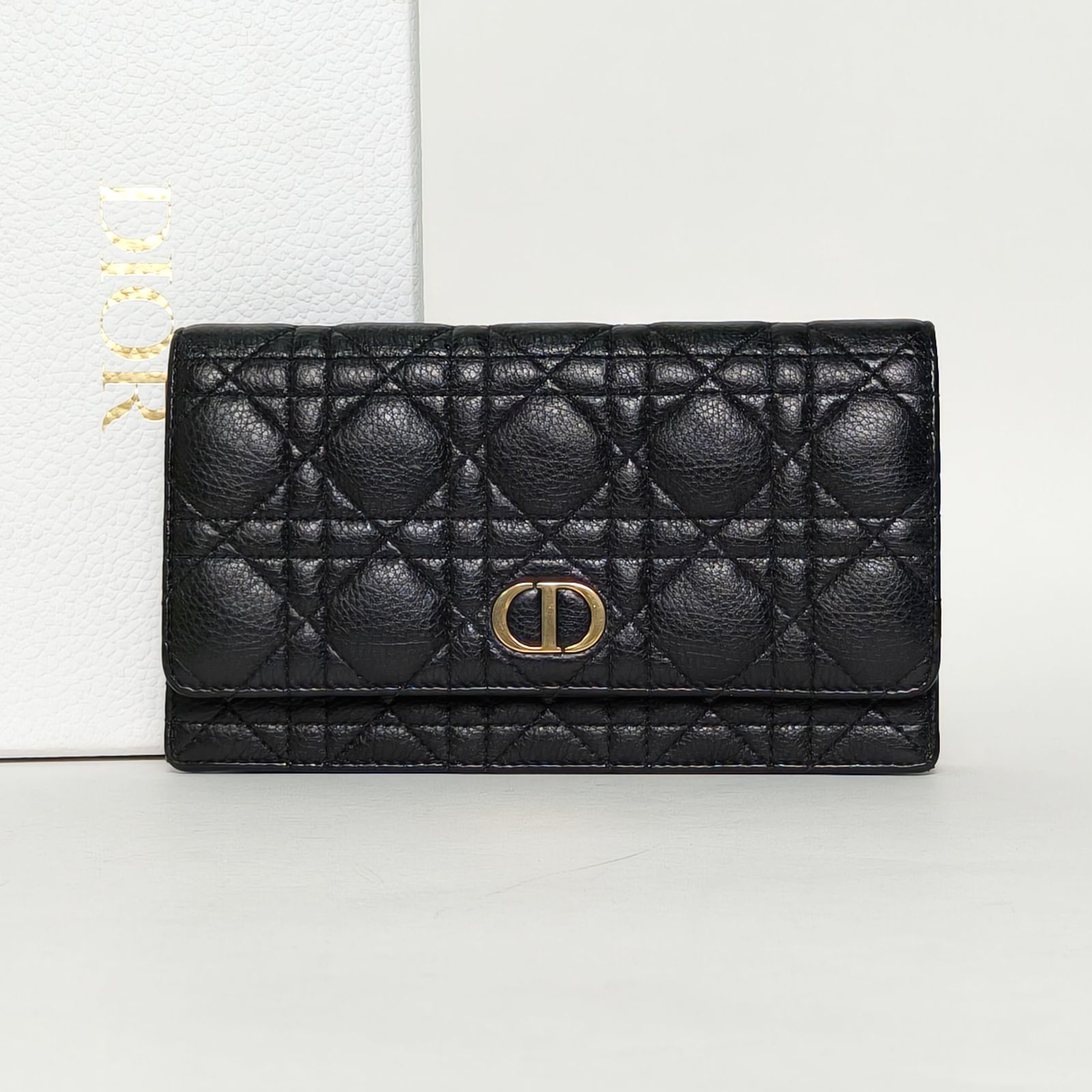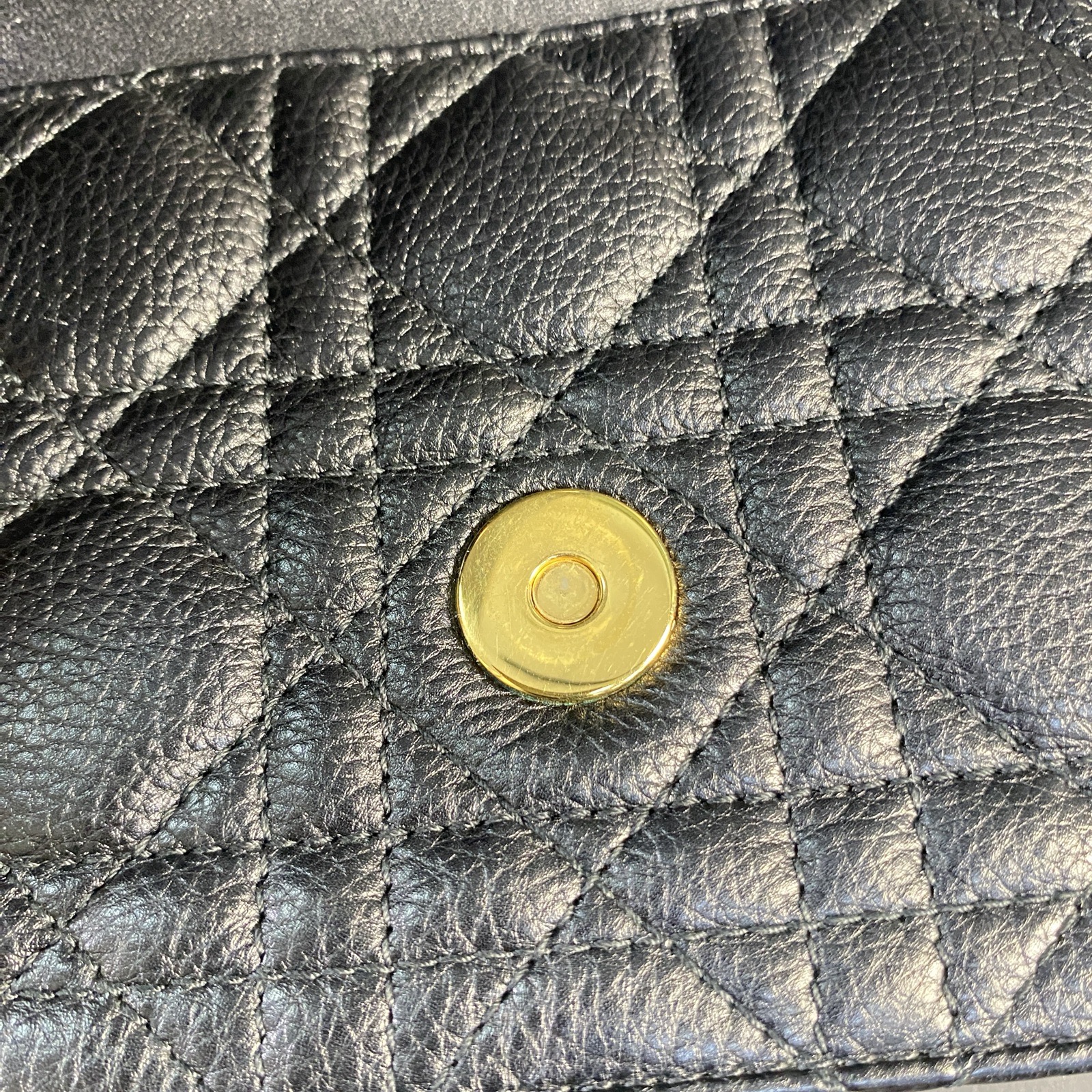 This Chanel Caro chain WOC is crafted from black leather with gold-tone hardware, featuring a quilted pattern and interlocking CD clasp.