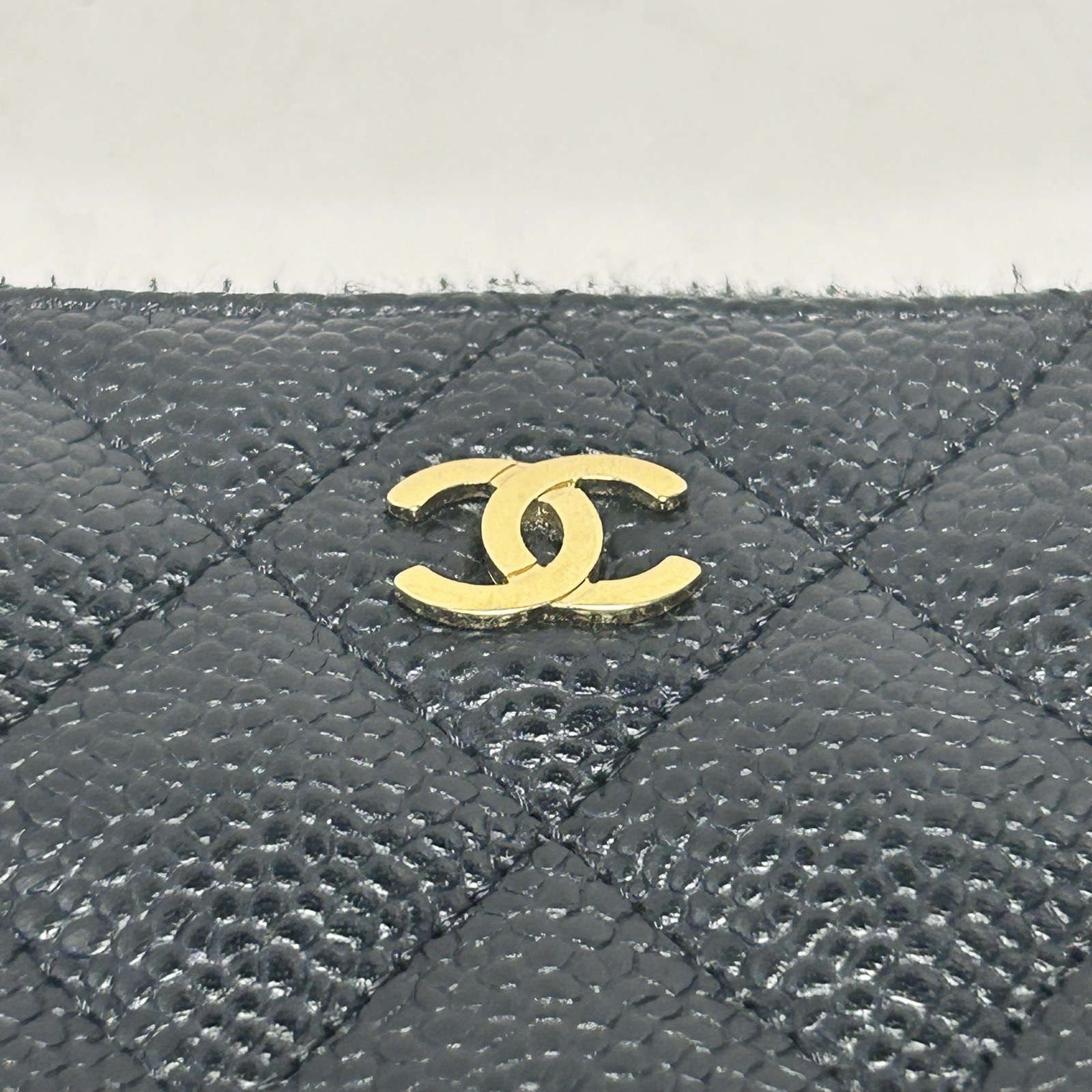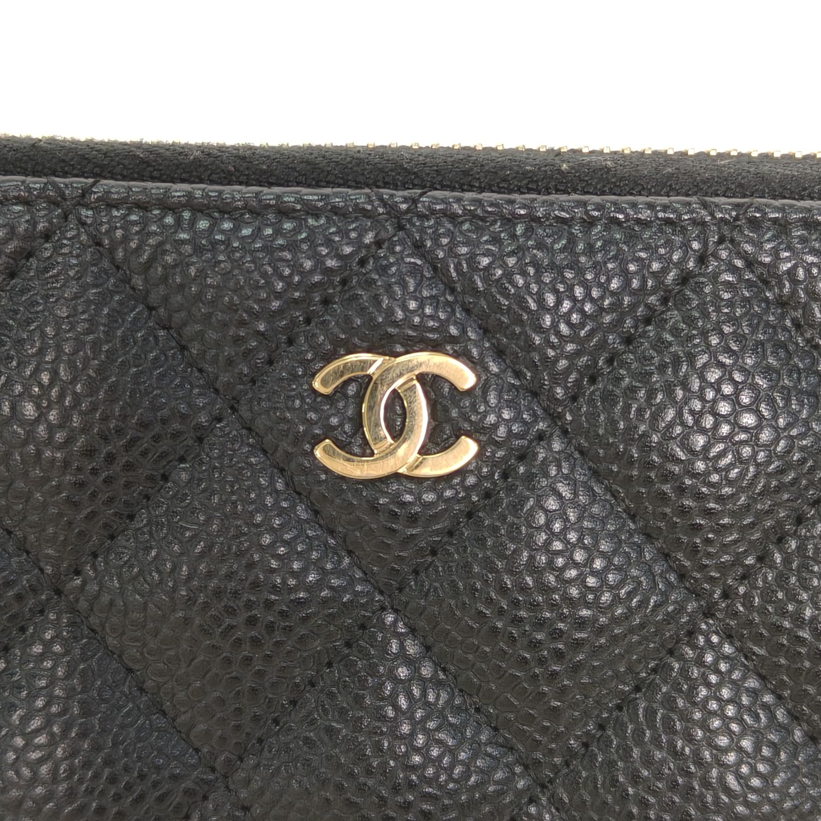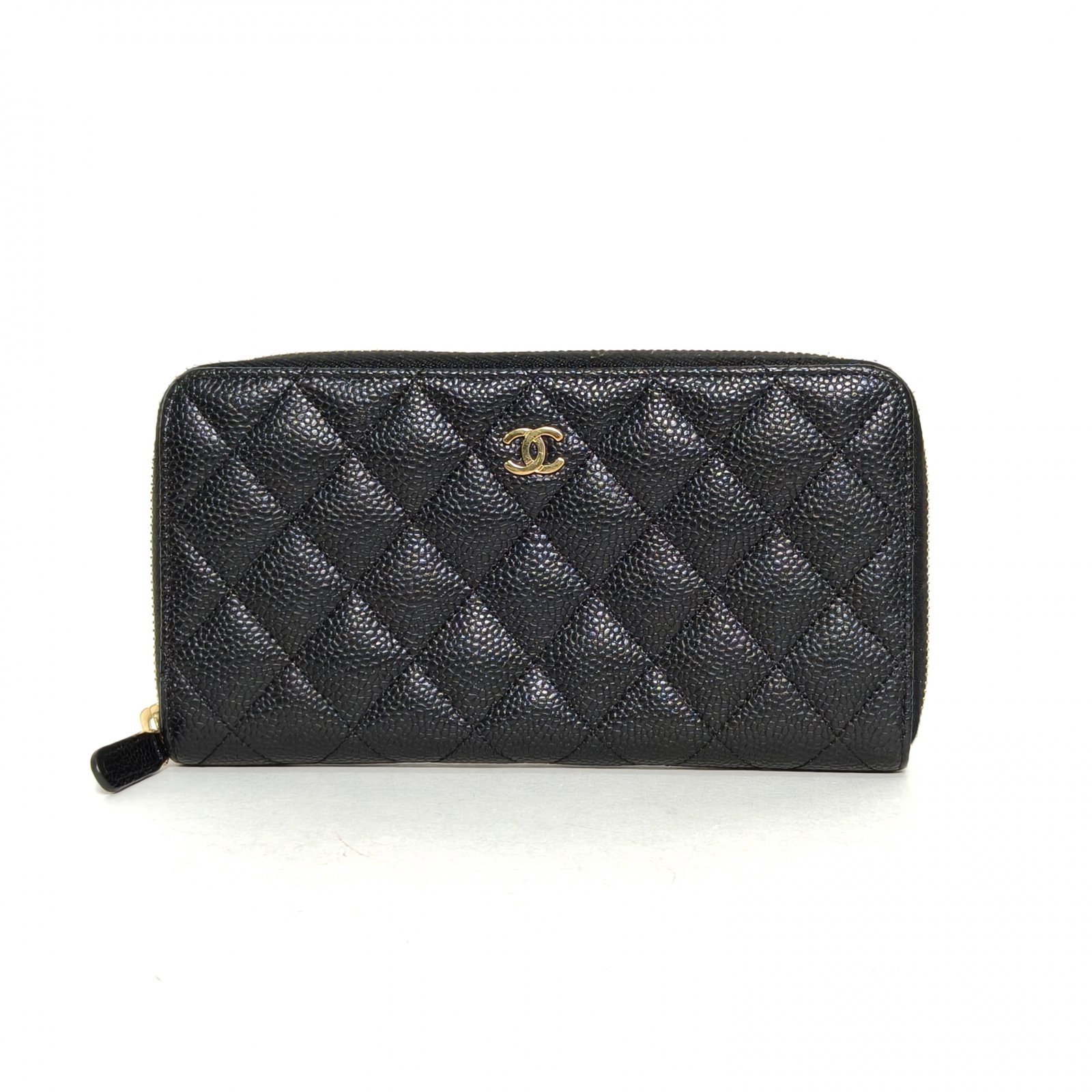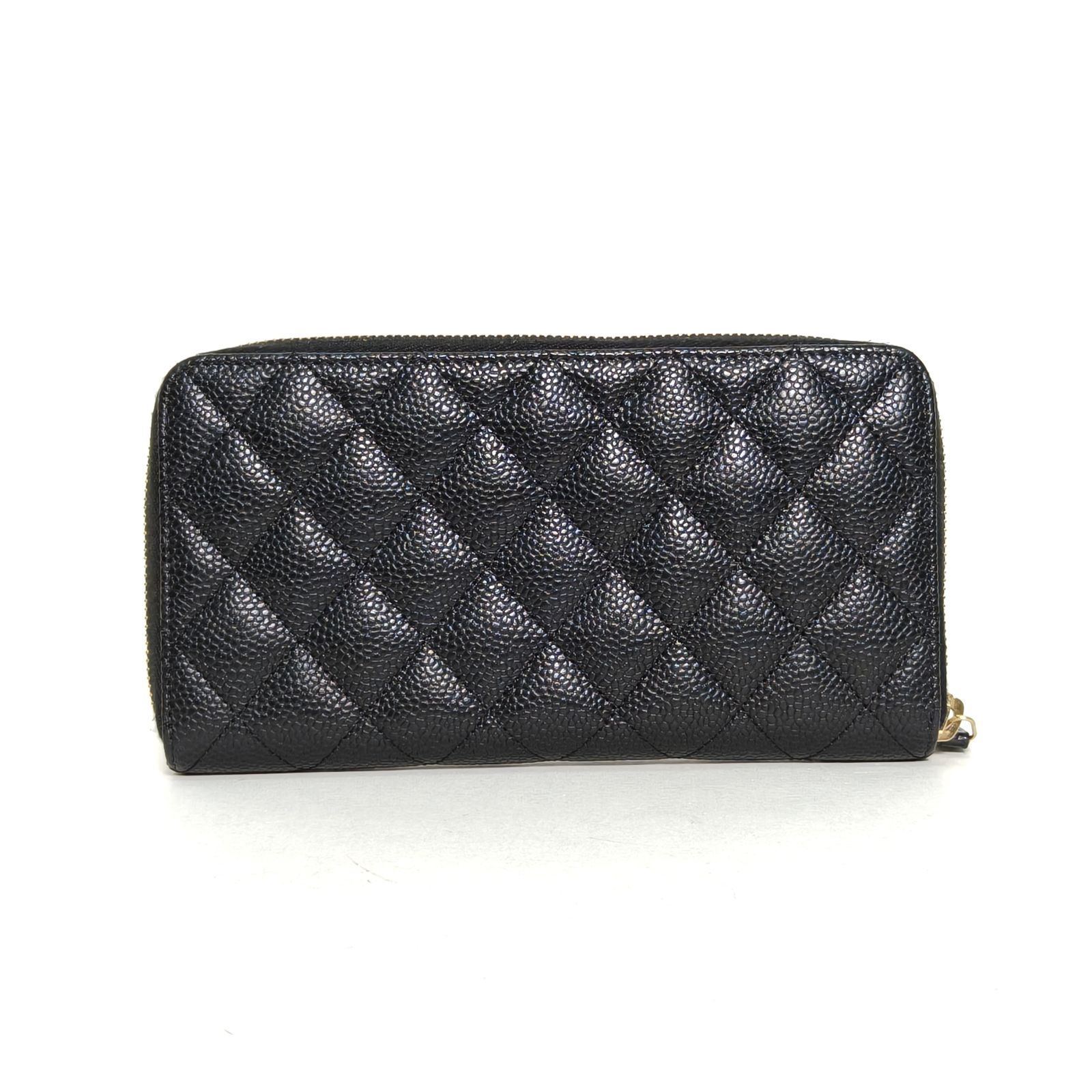 Crafted from black grained leather with gold-tone hardware, this long zip wallet features quilted texture and iconic CC logo, providing ample storage for cards and cash.