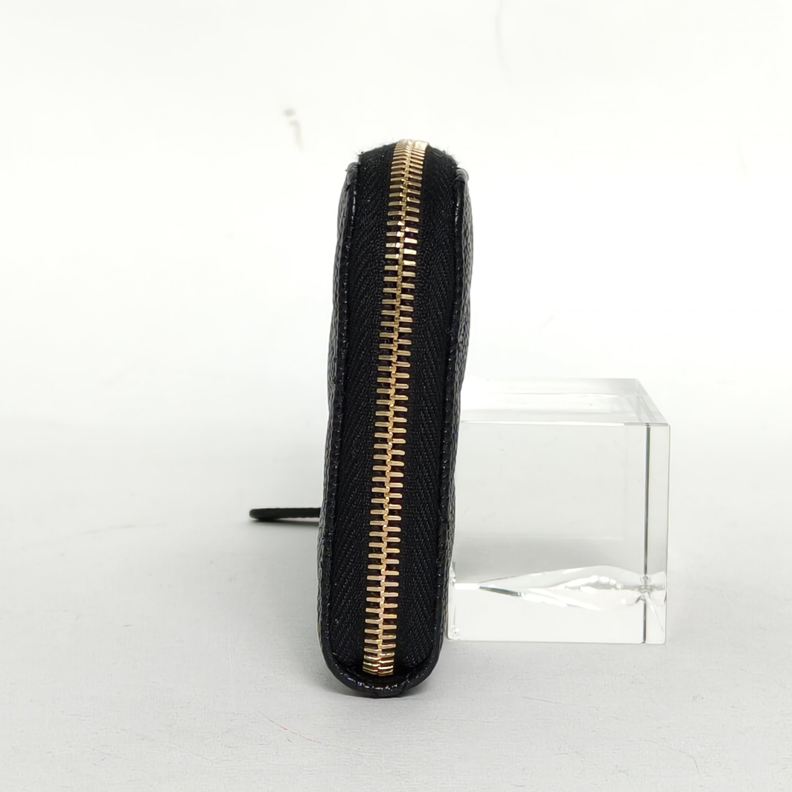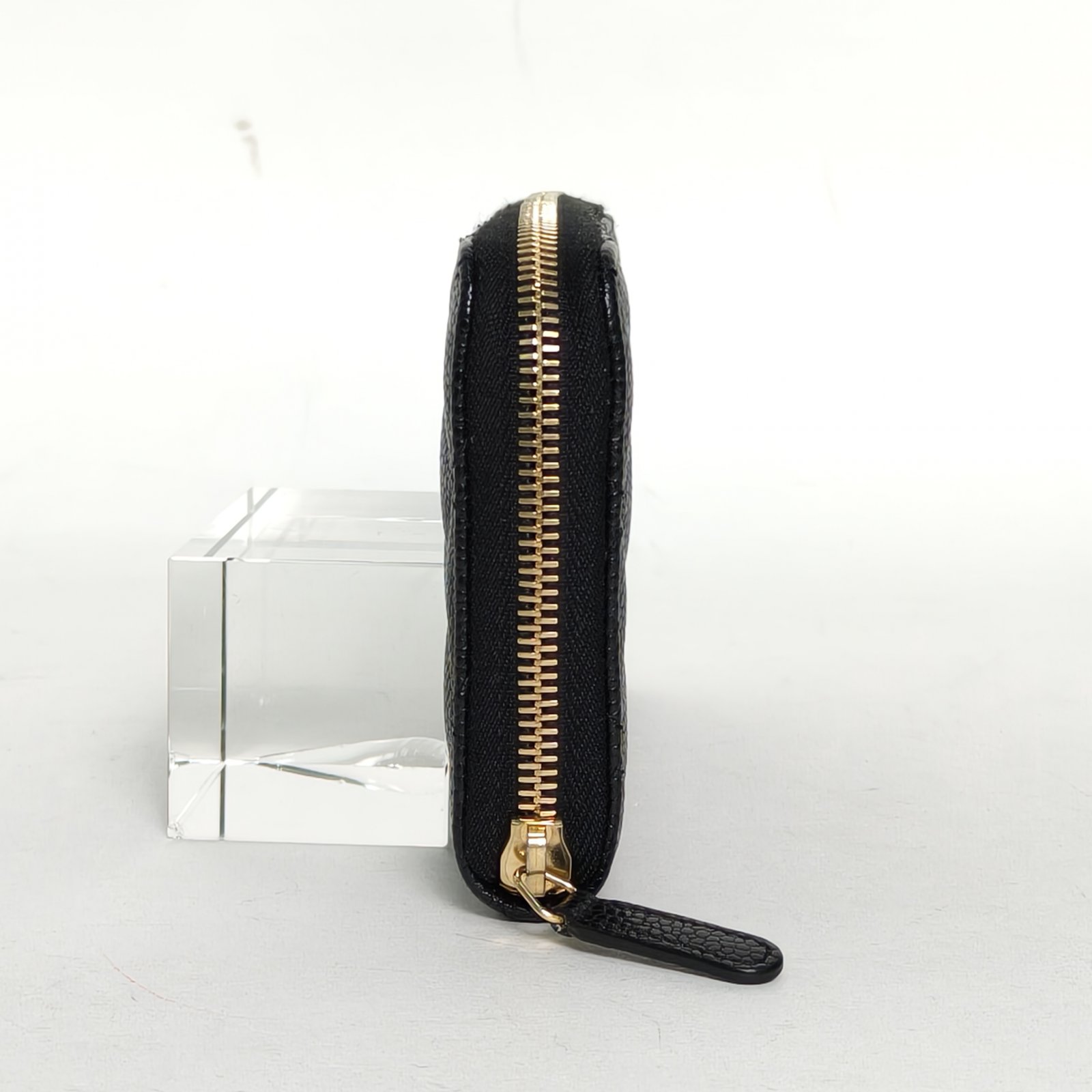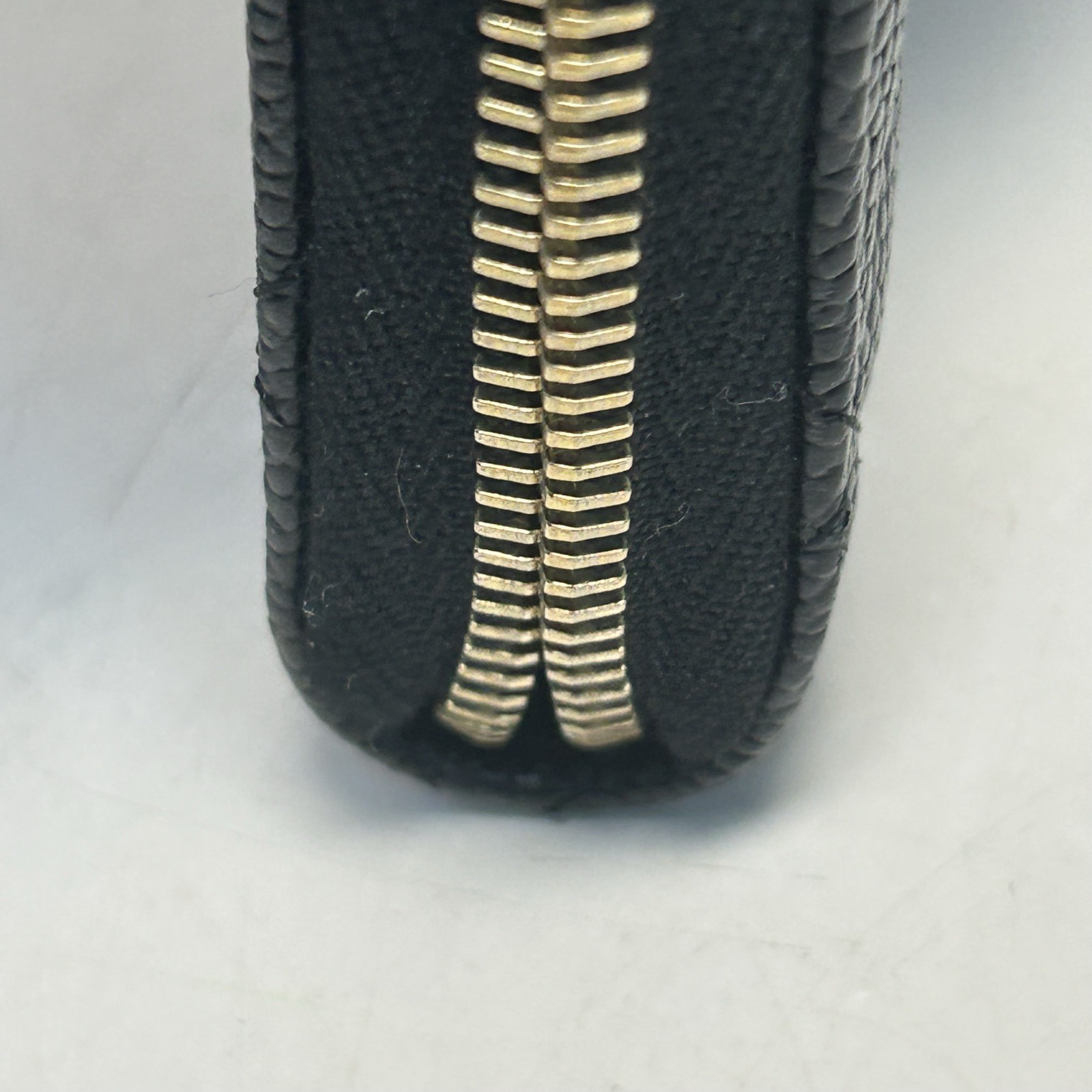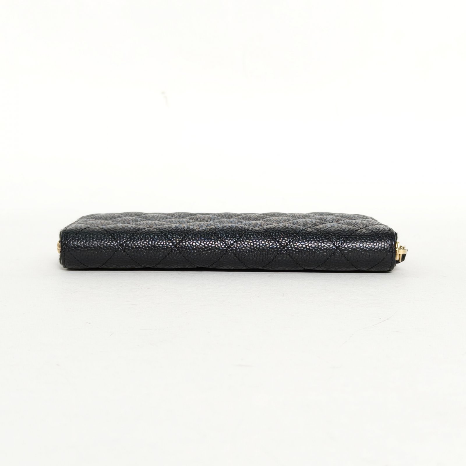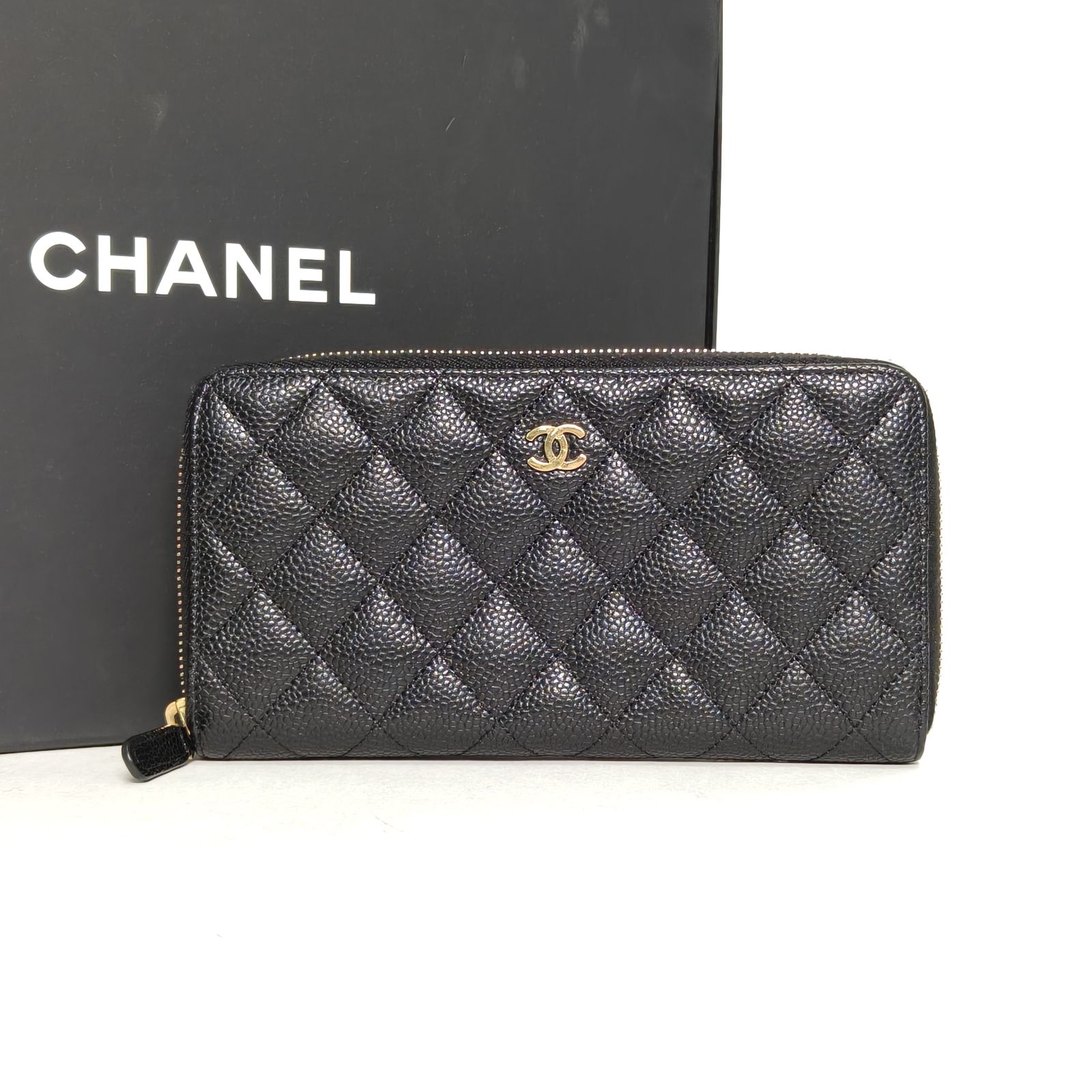 Crafted from black grained leather with gold-tone hardware, this long zip wallet features quilted texture and iconic CC logo, providing ample storage for cards and cash.