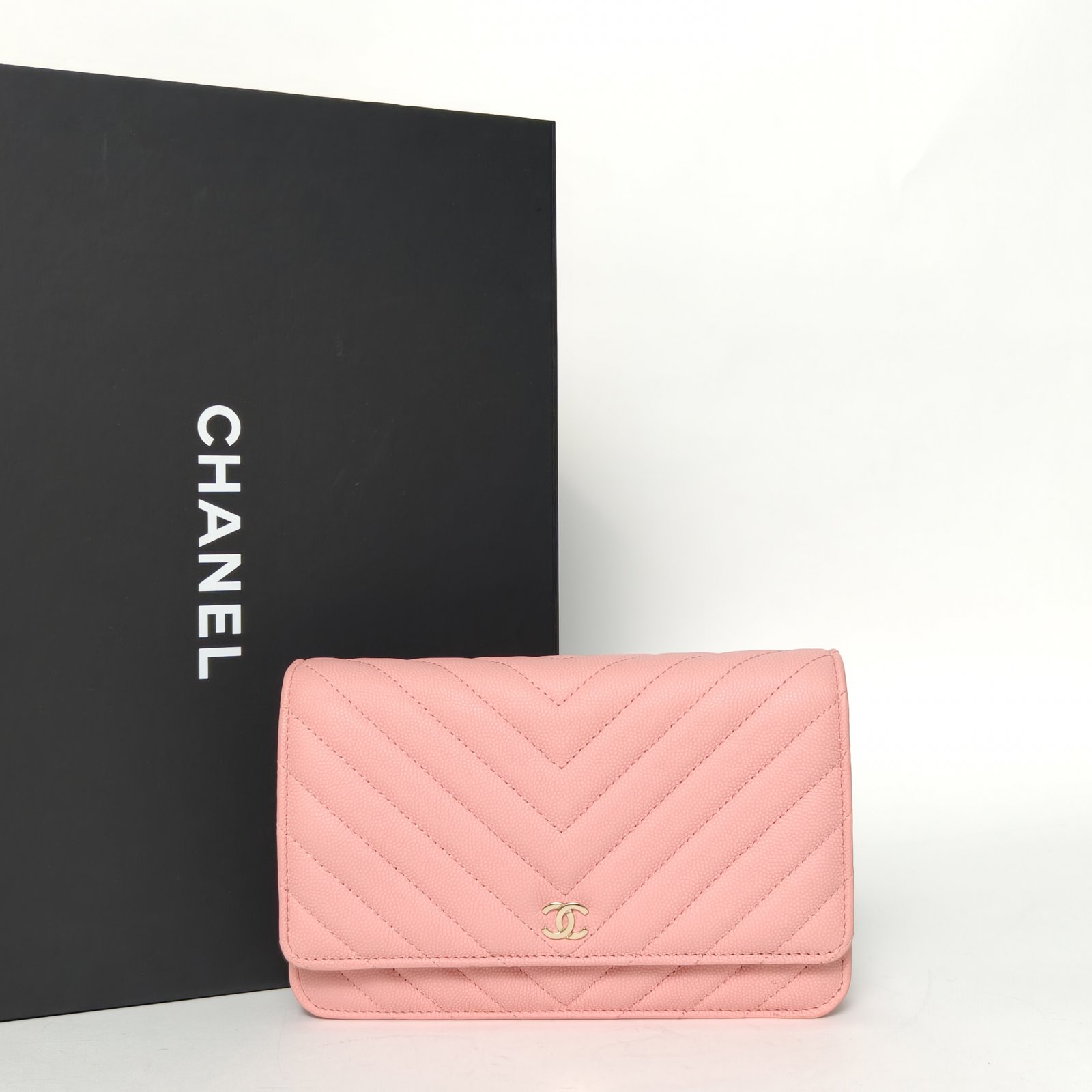 Crafted from premium leather with iconic V-stitch and gold-tone CC hardware, this CF WOC 19cm features a detachable strap, a timeless luxury icon.
