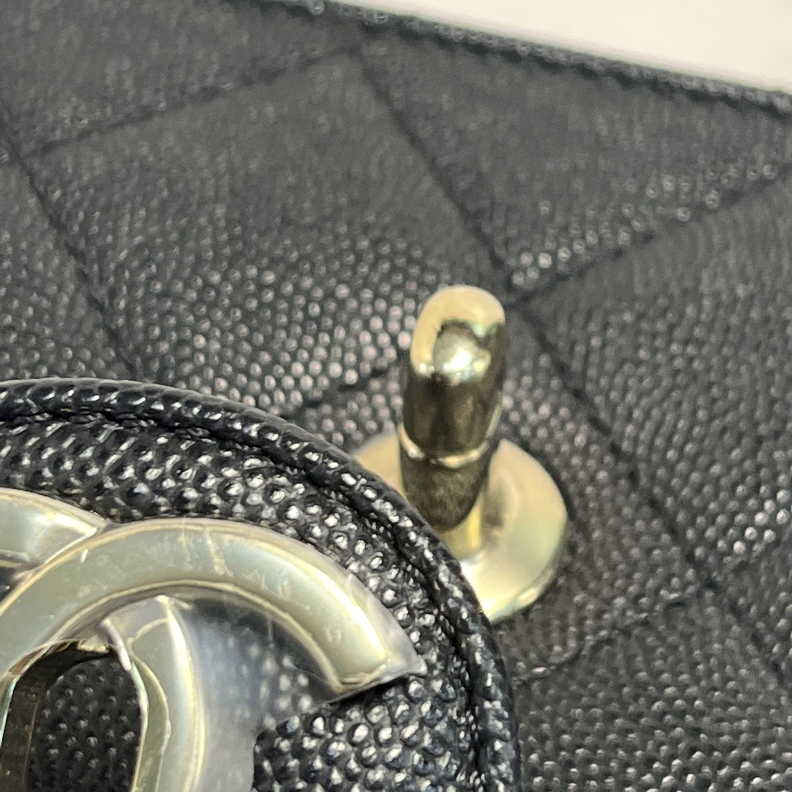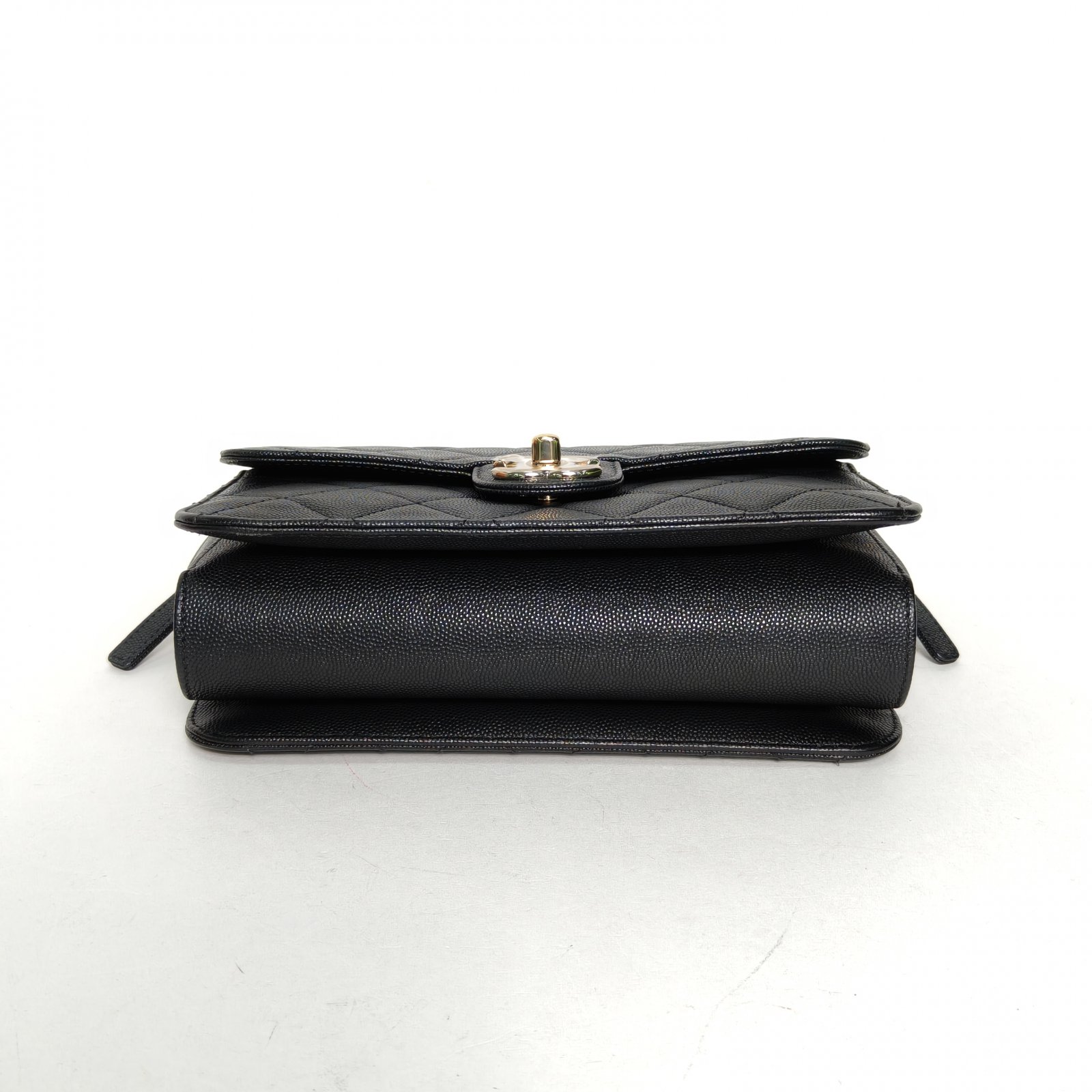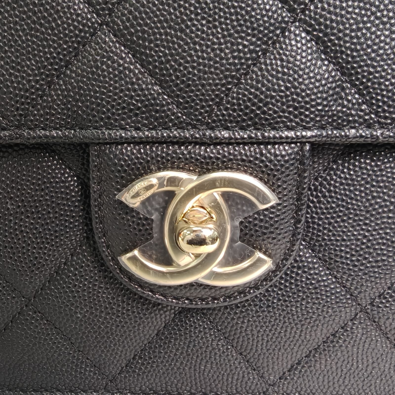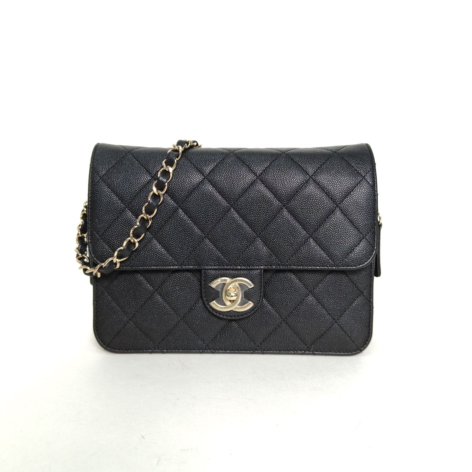 Crafted from black grained leather with quilted pattern and iconic CC turn-lock, this 22C early spring flap bag features an interior zipper and gold-tone hardware, blending timeless elegance with functional design.