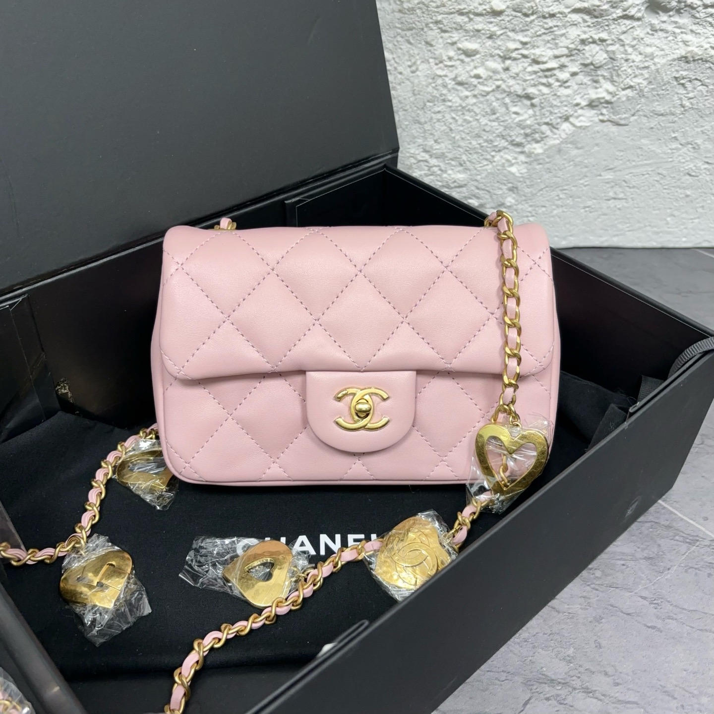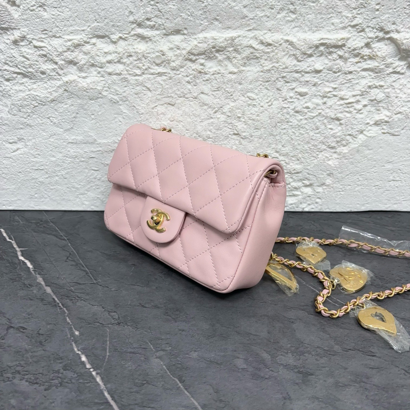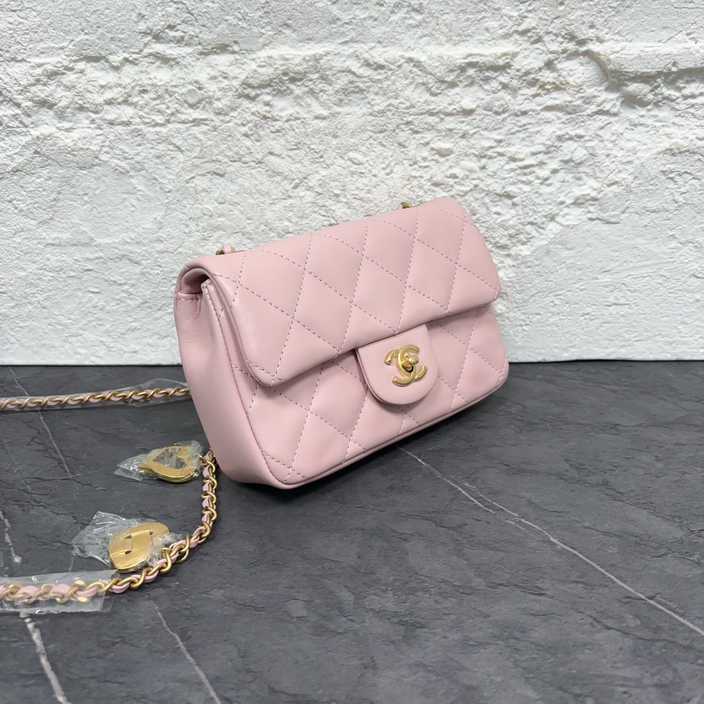 The Chanel Classic Flap leather handbag is a compact and refined crossbody crafted from soft lambskin featuring quilted pattern and classic double flap with CC turnlock, complete with lustrous gold-tone heart charms hardware, exquisite French precision, and timeless Chanel allure in gentle rose. Feel free to click below for more consultation.