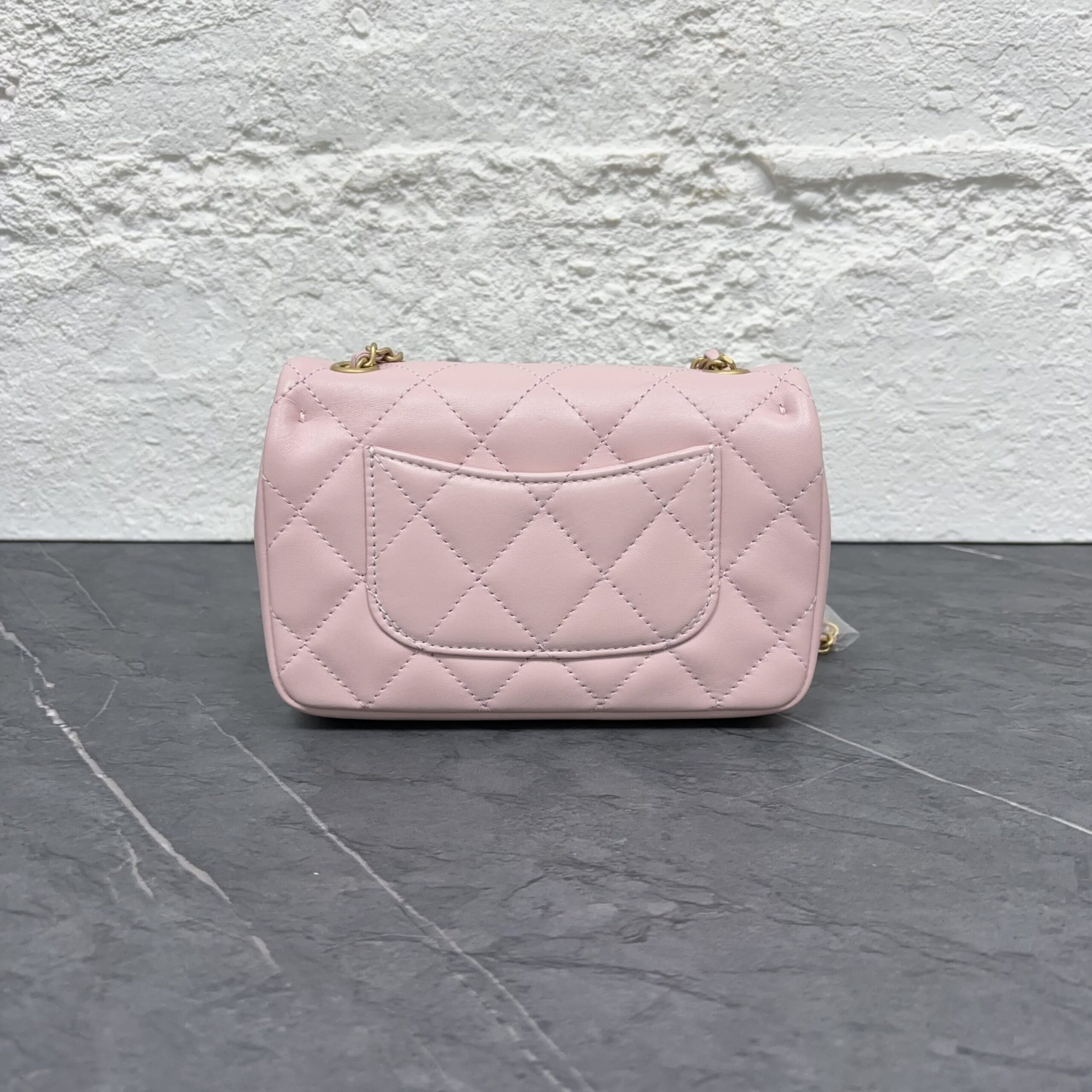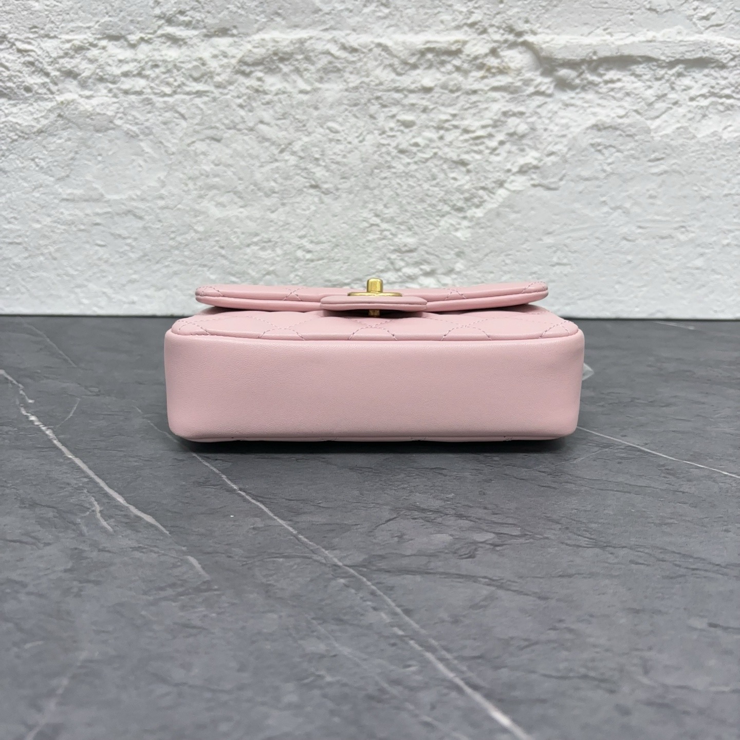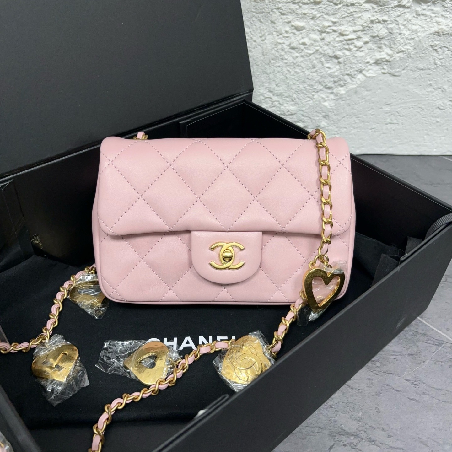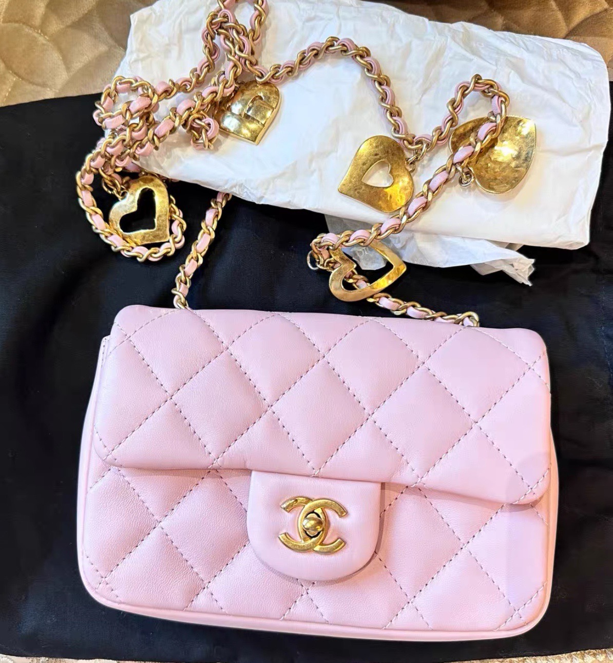 The Chanel Classic Flap leather handbag is a compact and refined crossbody crafted from soft lambskin featuring quilted pattern and classic double flap with CC turnlock, complete with lustrous gold-tone heart charms hardware, exquisite French precision, and timeless Chanel allure in gentle rose. Feel free to click below for more consultation.