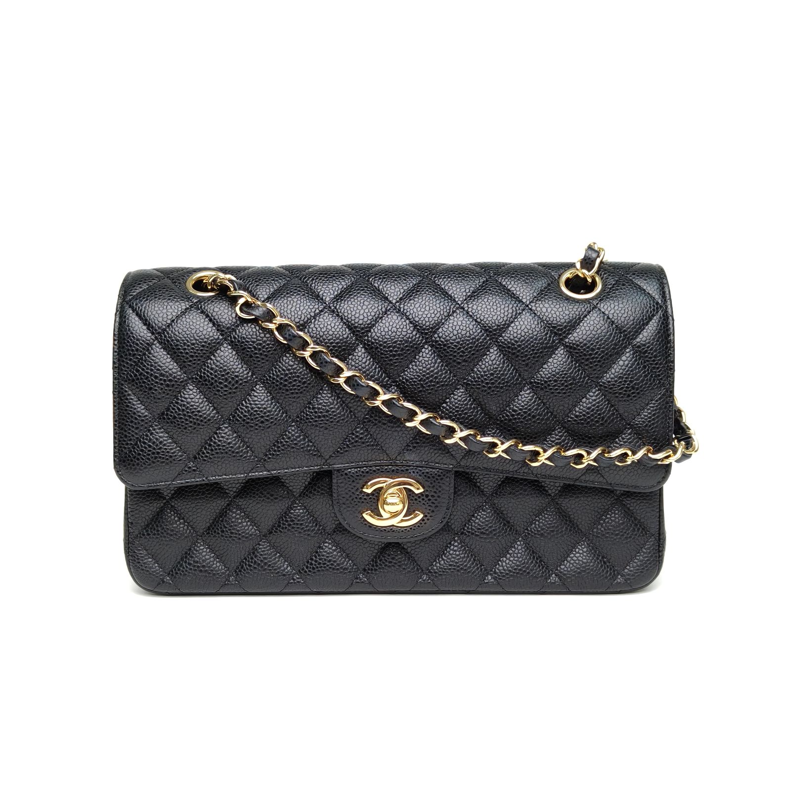 Embodying A timeless and iconic luxury bag, the Chanel Classic Flap Medium 25.5 is crafted from durable black caviar leather with signature diamond quilting and polished gold hardware. The iconic interlocking CC turn-lock and chain strap make it a coveted piece of fashion history.