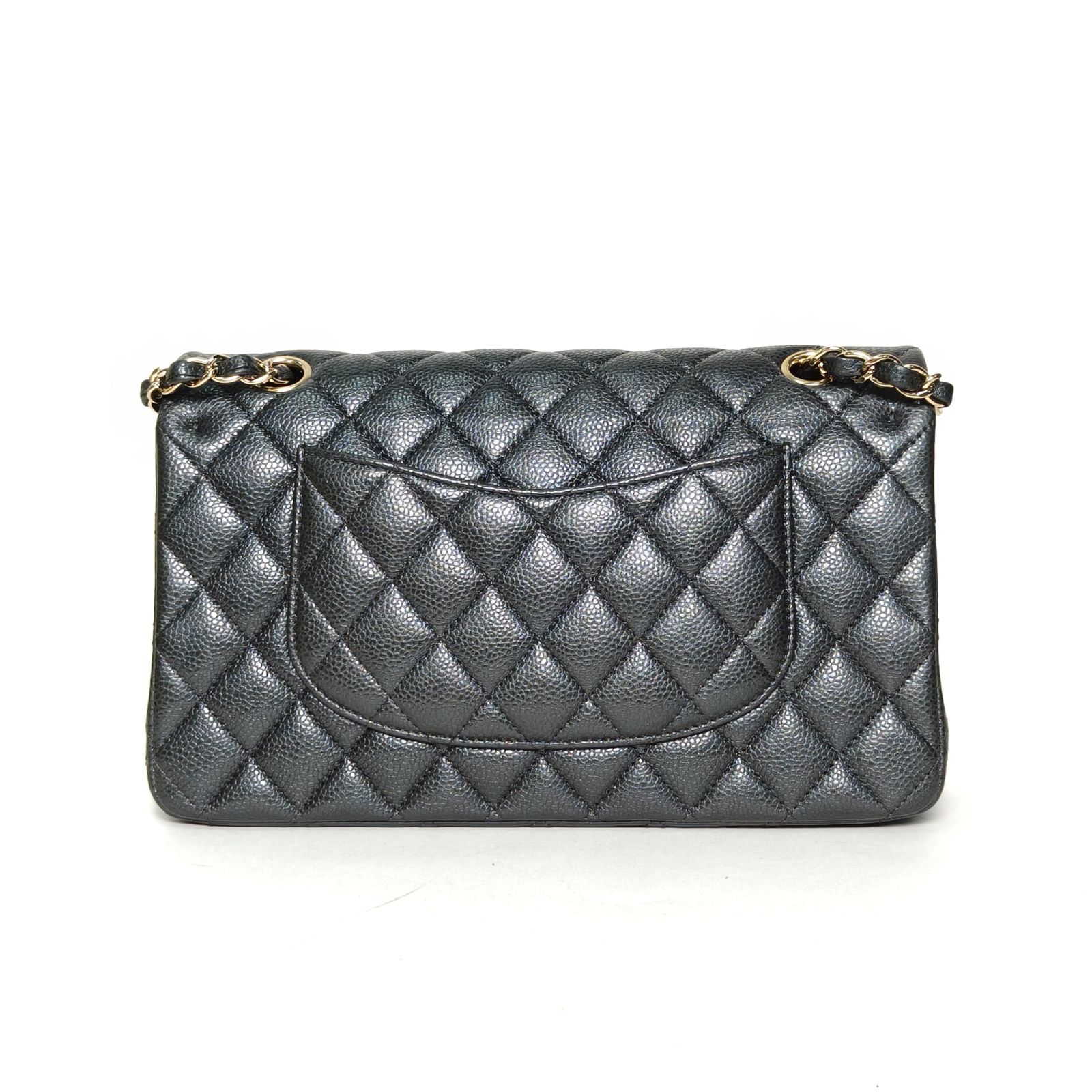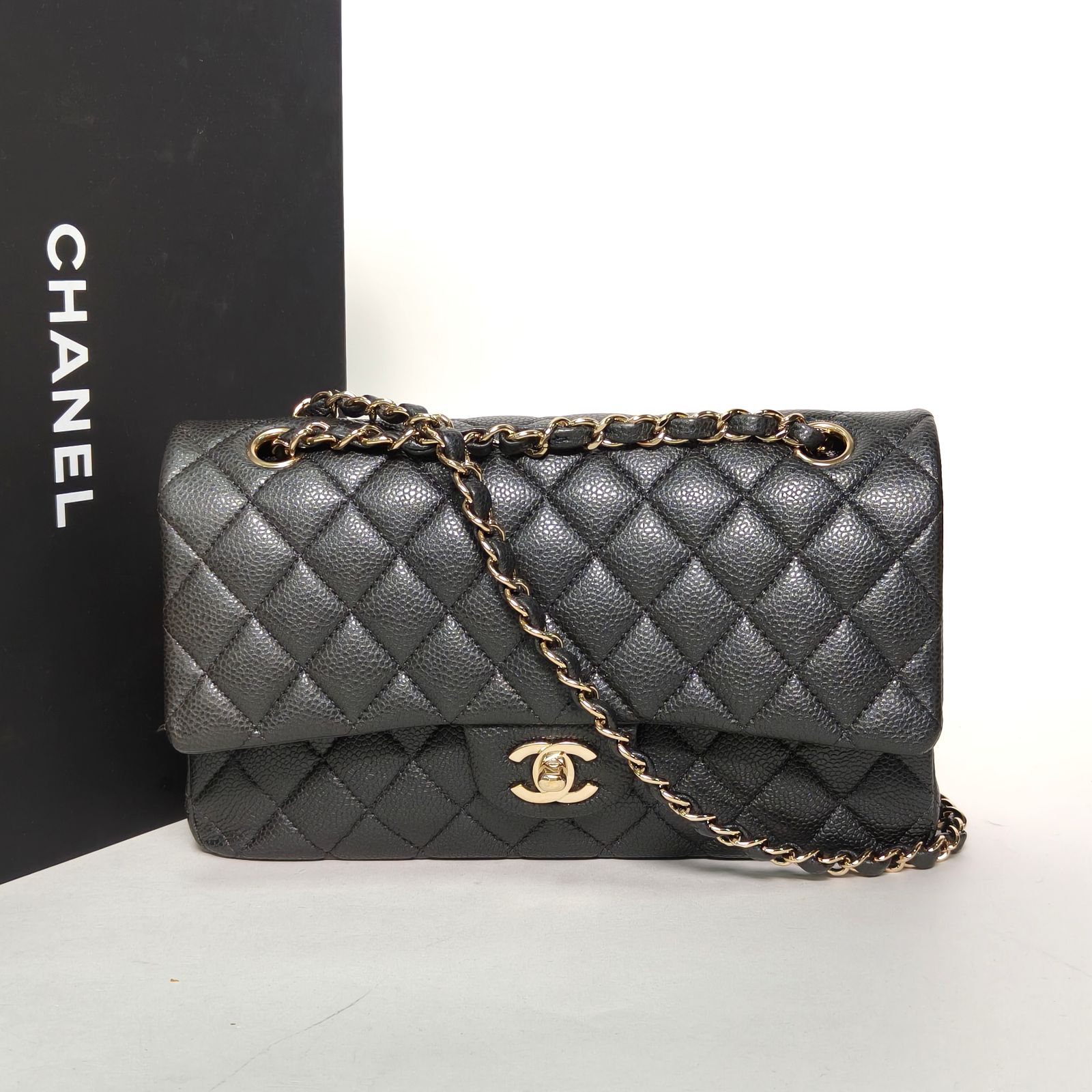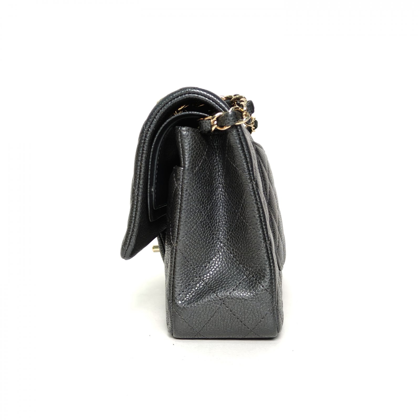 Embodying a timeless and elegant luxury handbag, the CHANEL Classic Flap Medium is crafted from dark grey caviar leather with quilted stitching and gold-tone clasp.