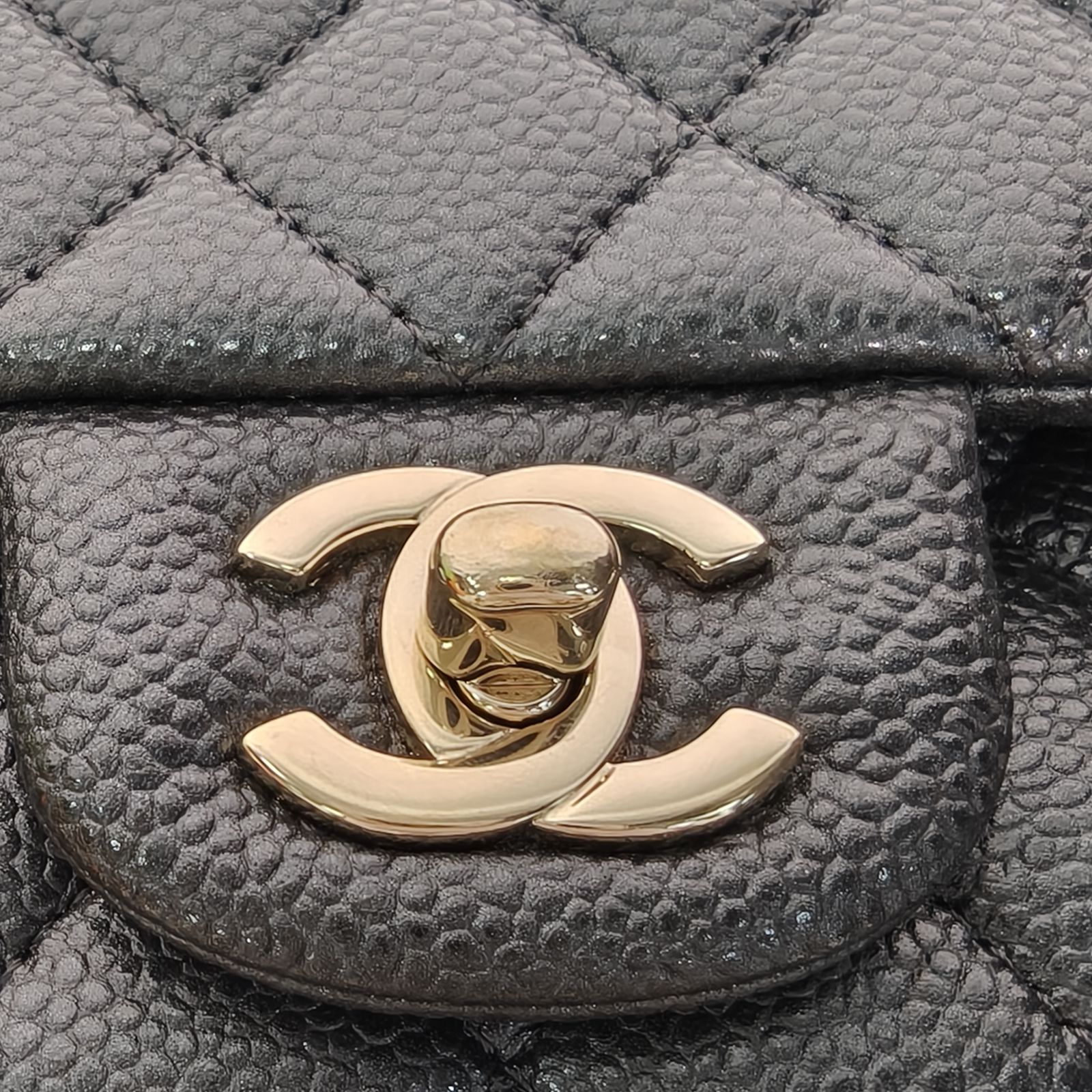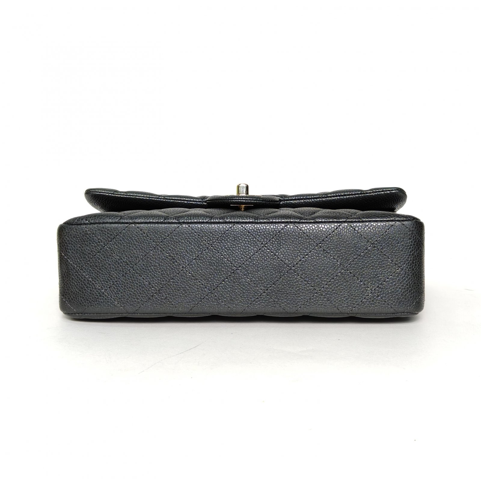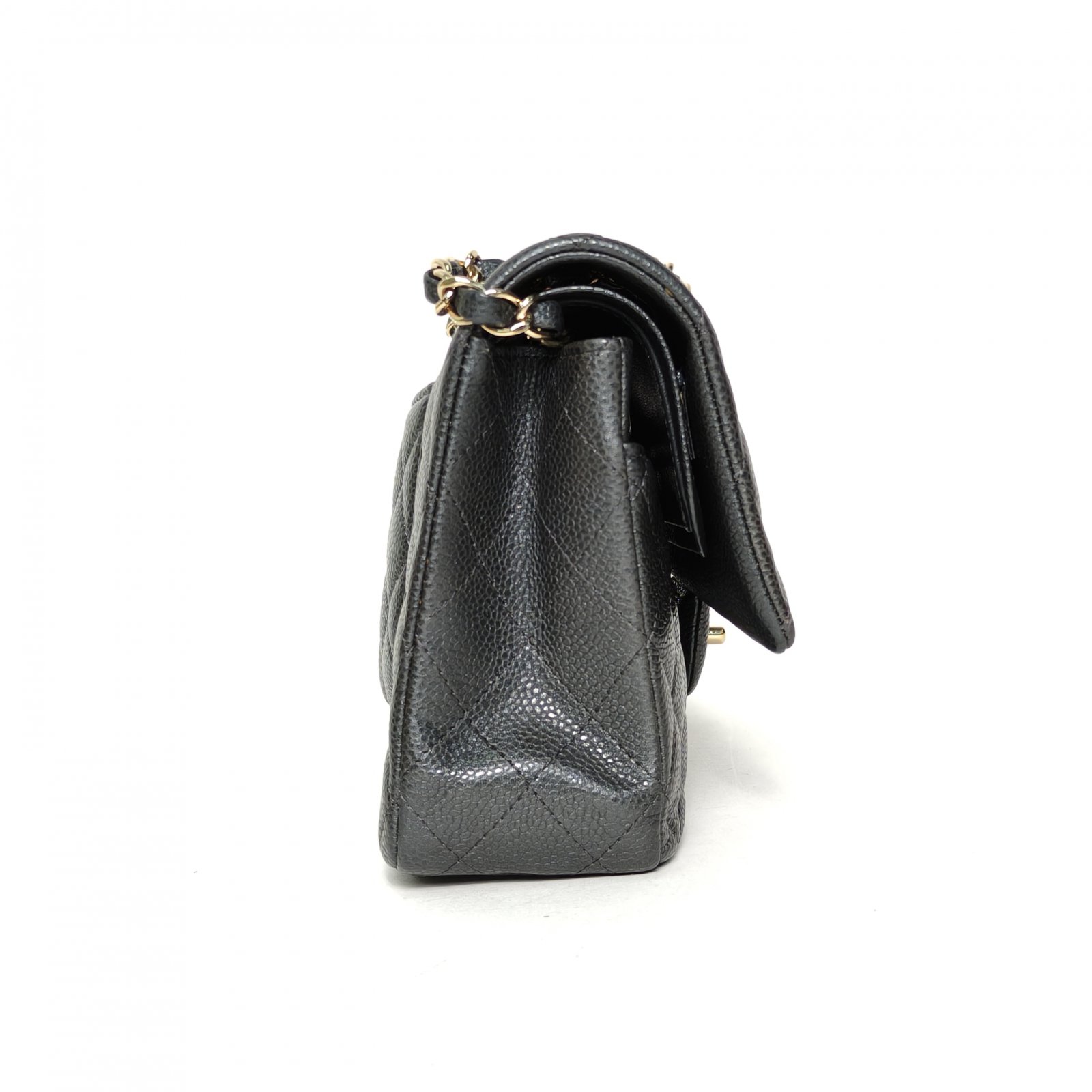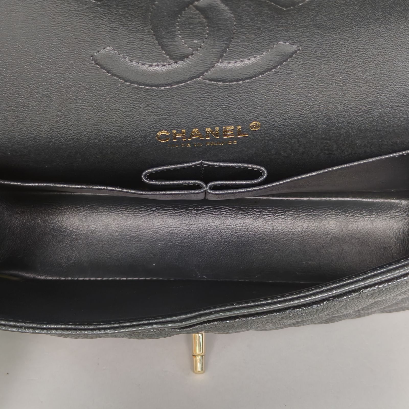 Embodying a timeless and elegant luxury handbag, the CHANEL Classic Flap Medium is crafted from dark grey caviar leather with quilted stitching and gold-tone clasp.