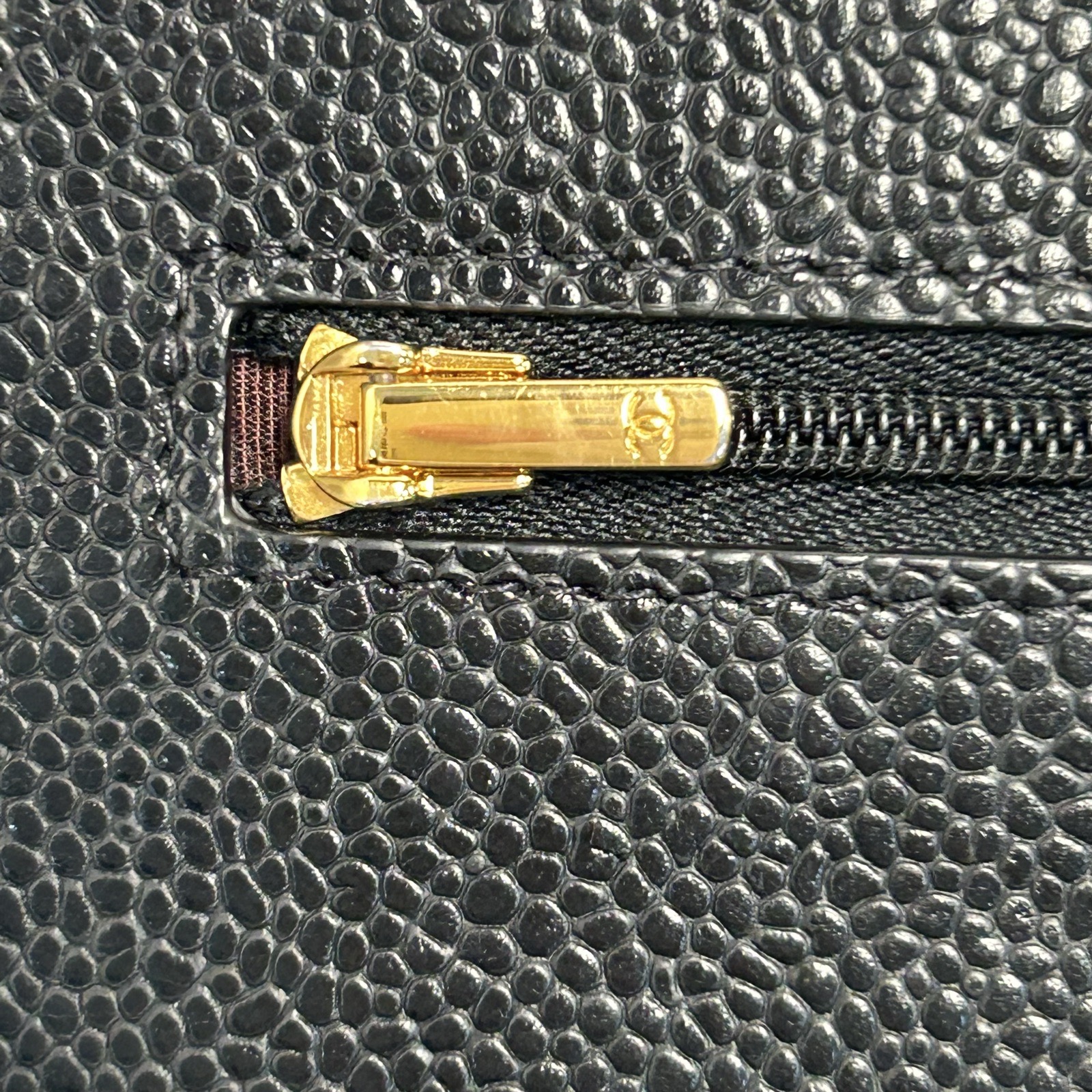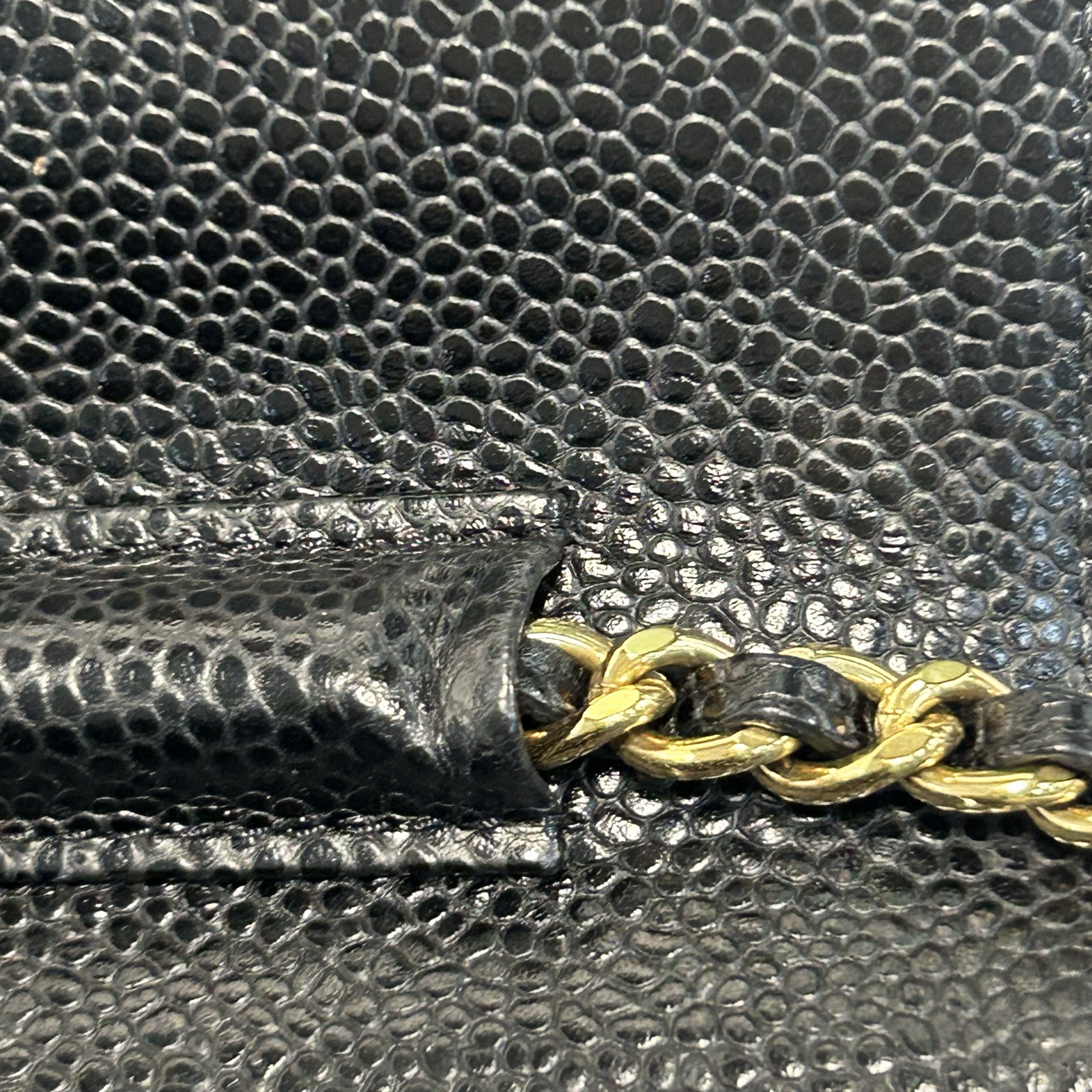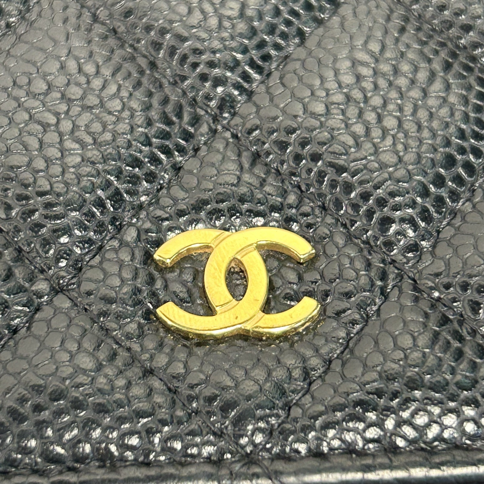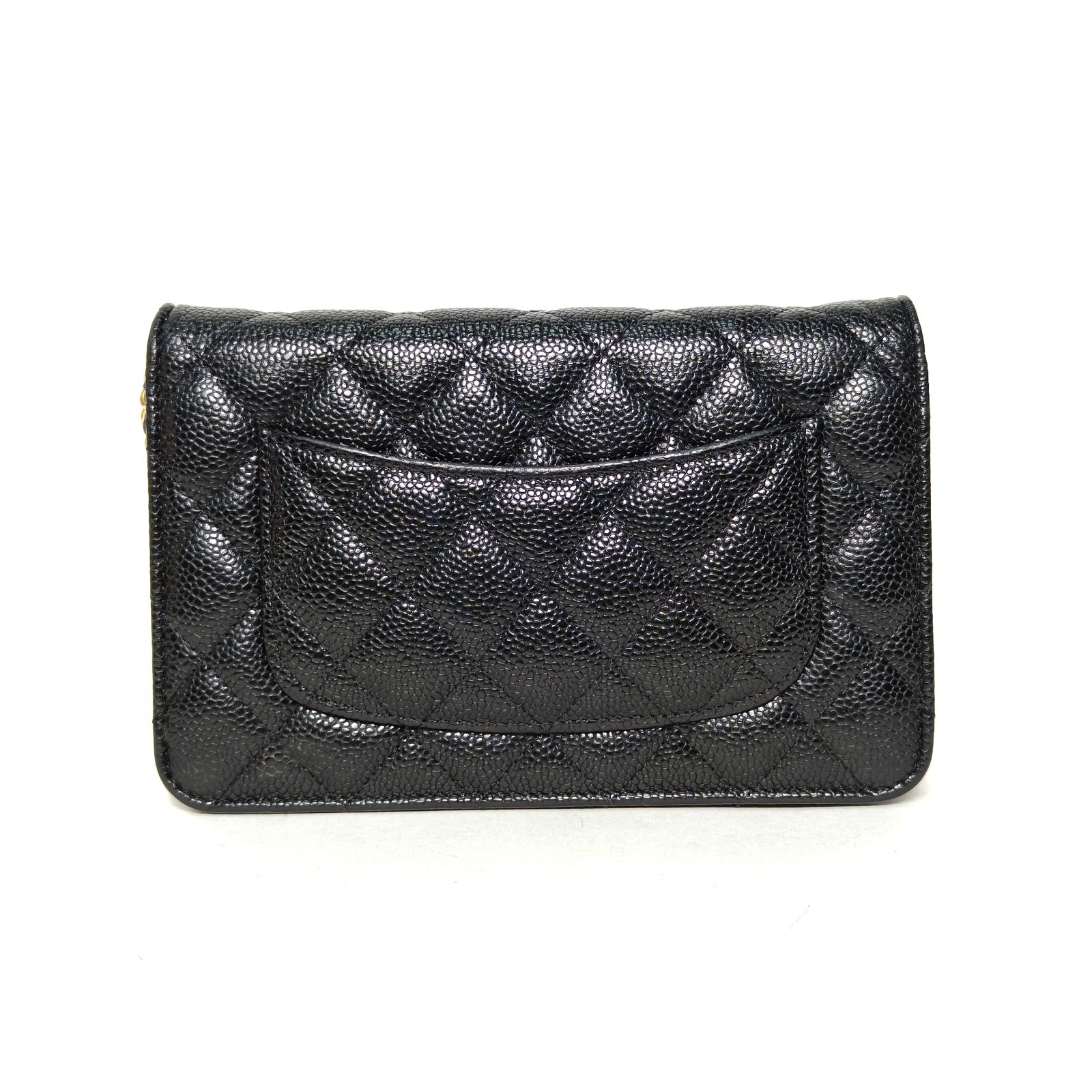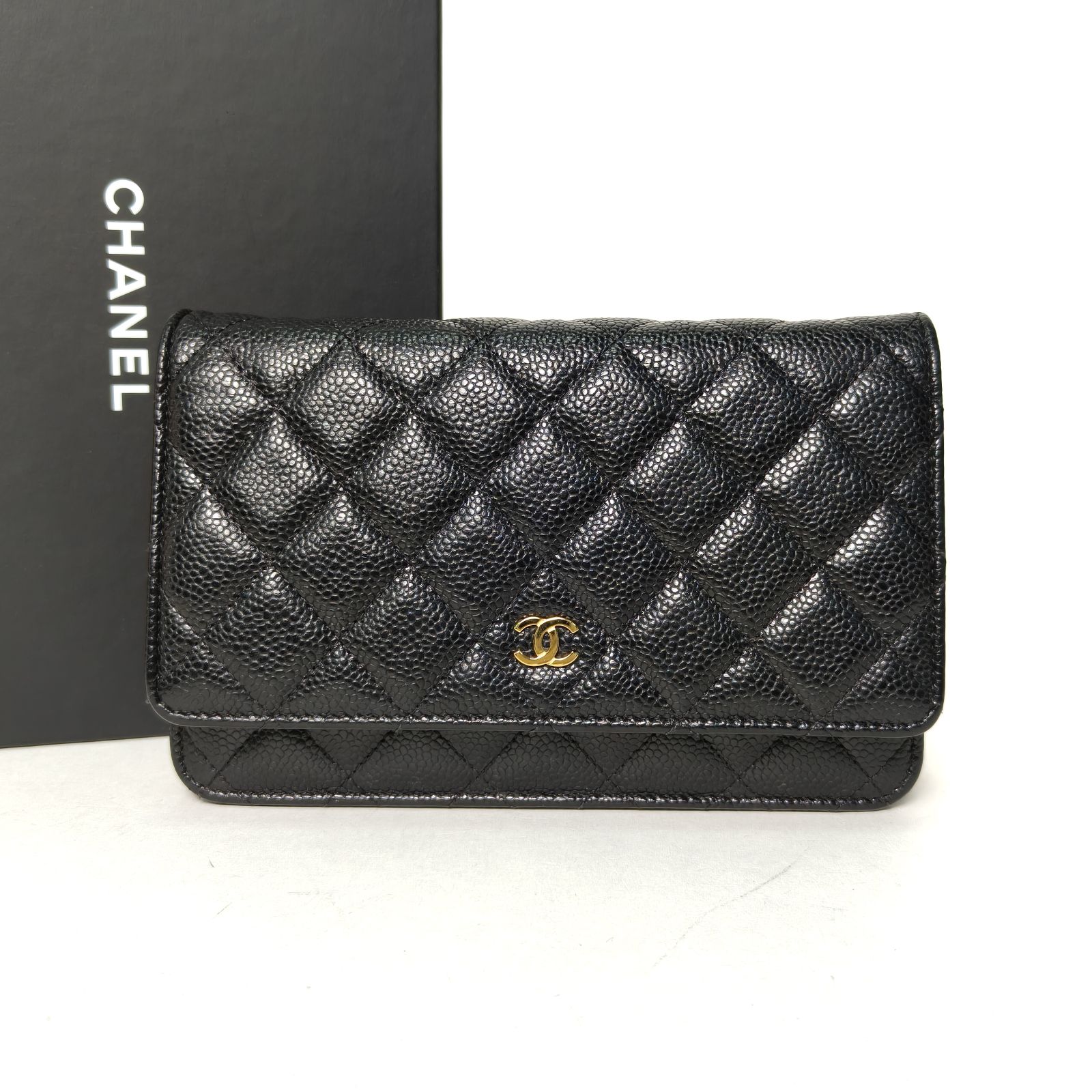Made from black grained leather with quilted pattern and iconic CC turn-lock, this WOC features a chain strap and gold-tone hardware, offering versatile everyday carry.