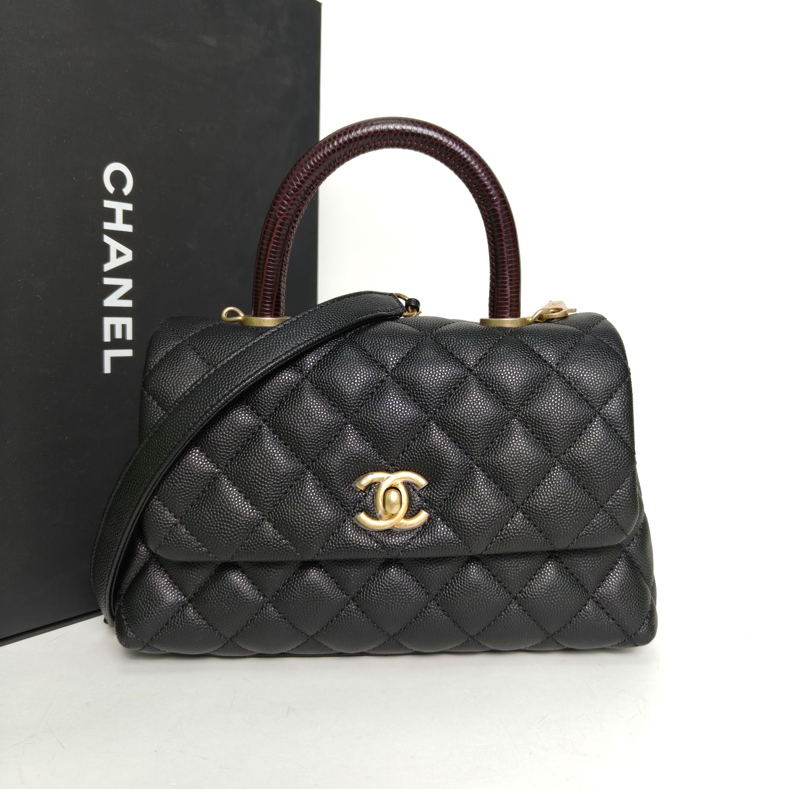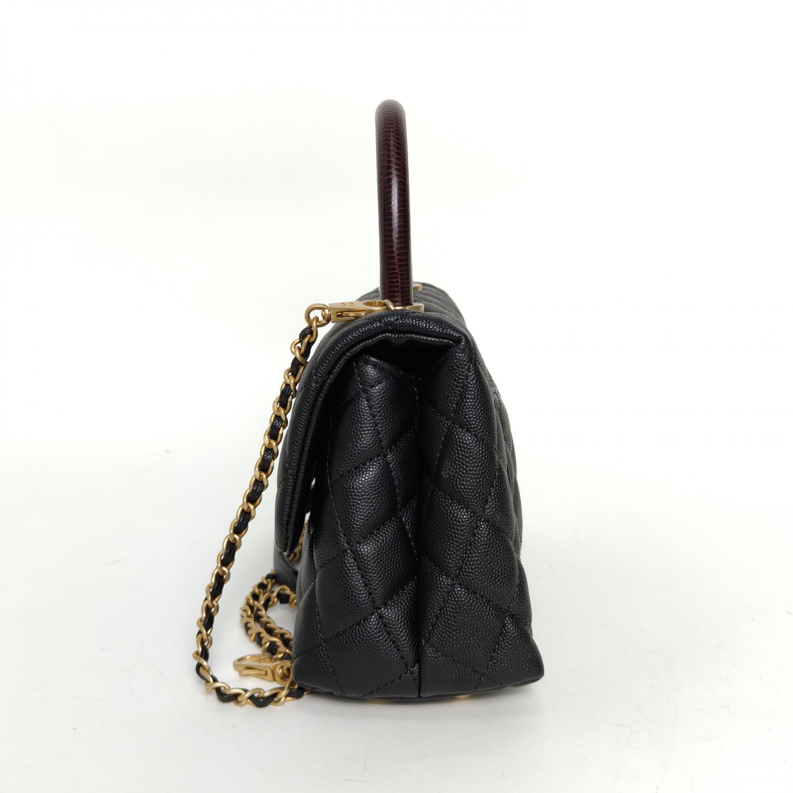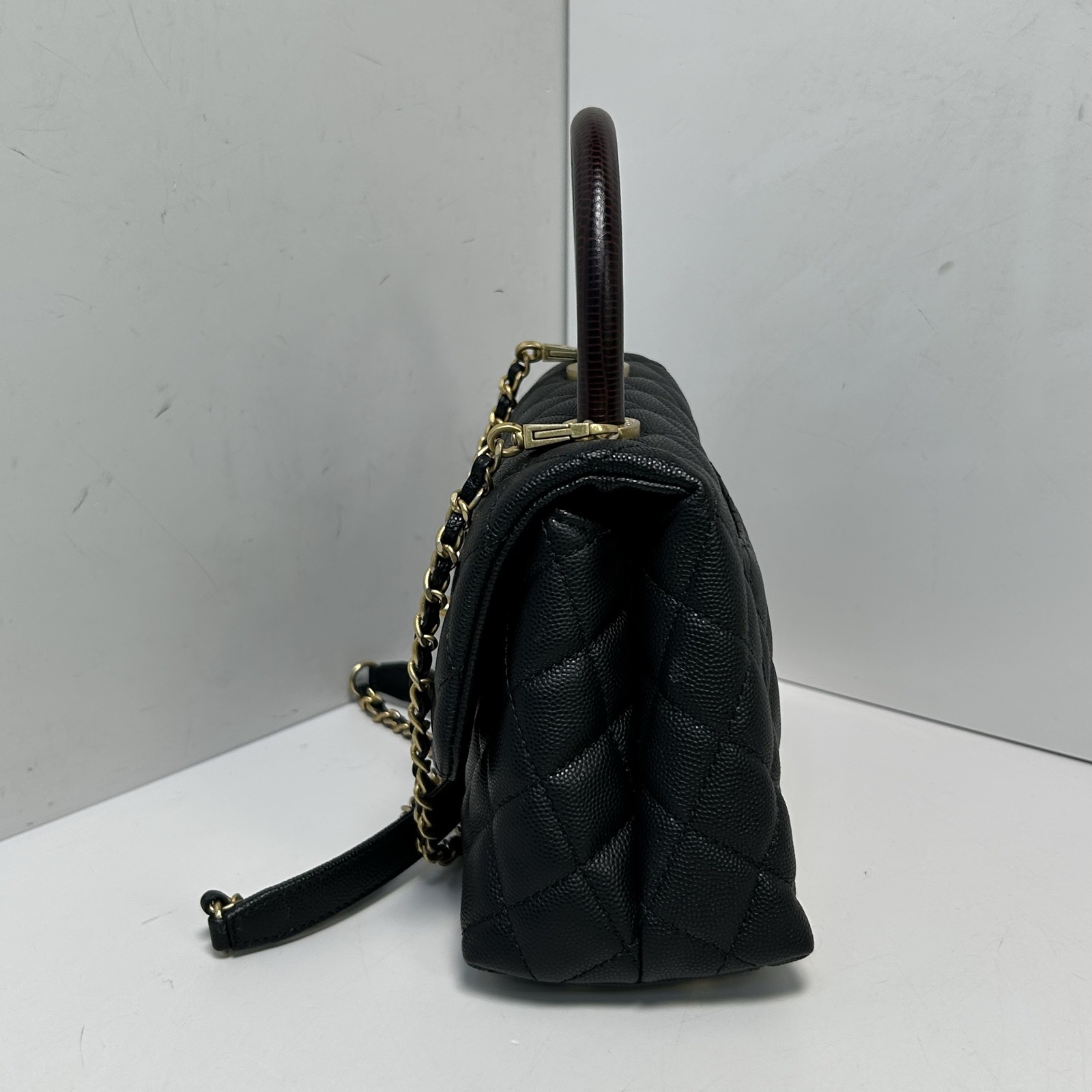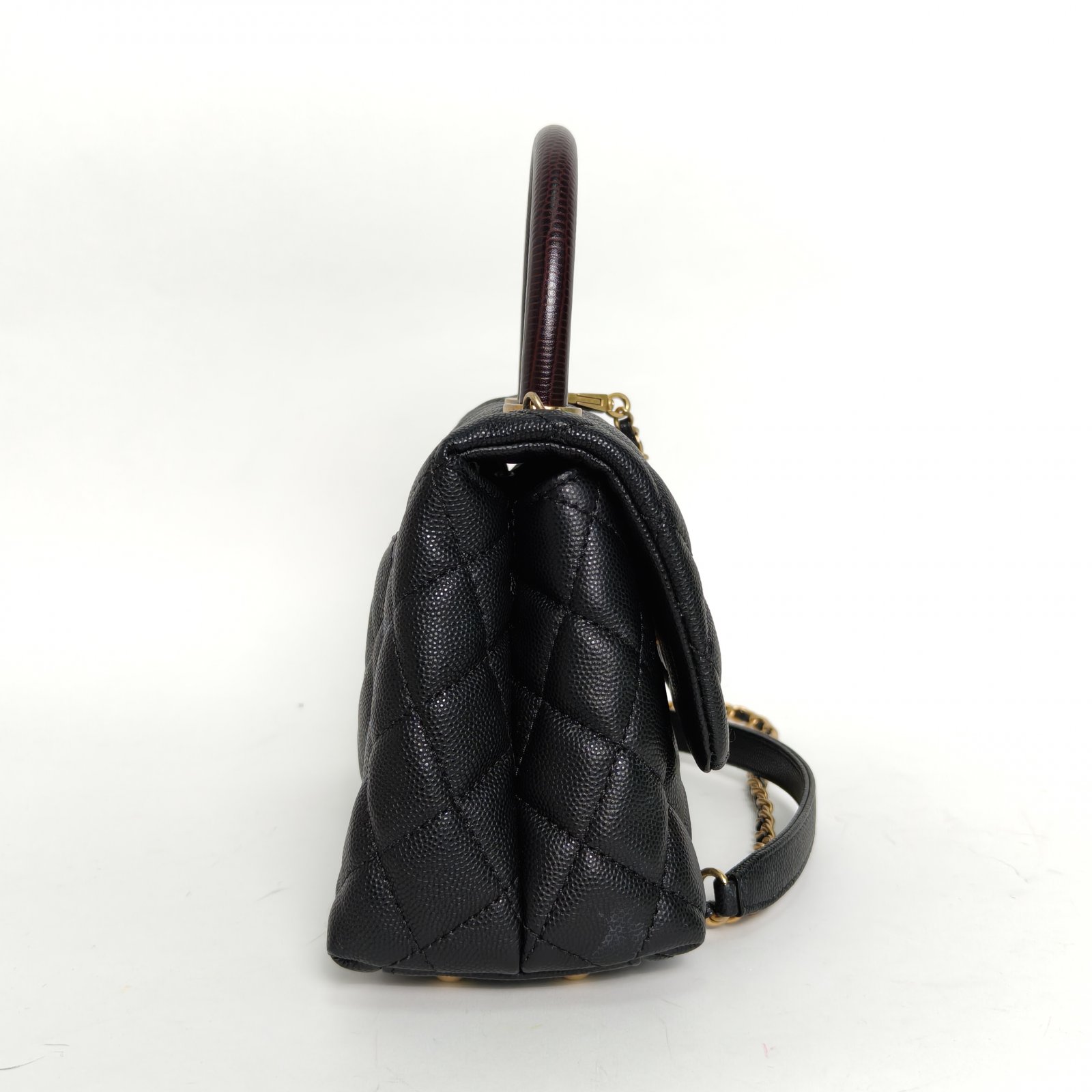 This Chanel Coco Handle small 24cm bag is crafted from black quilted leather with gold-tone hardware, featuring a lizard skin top handle and interlocking CC clasp.