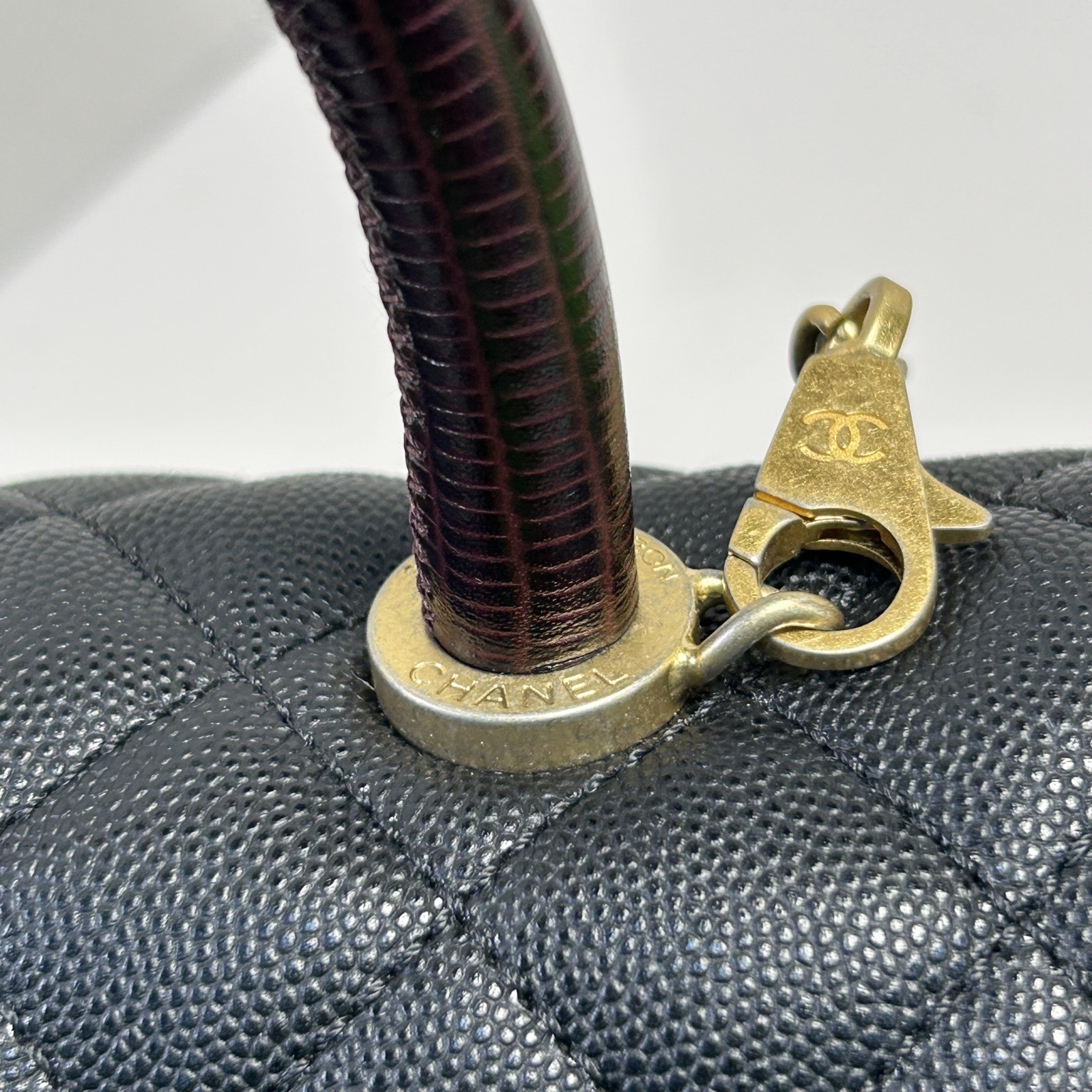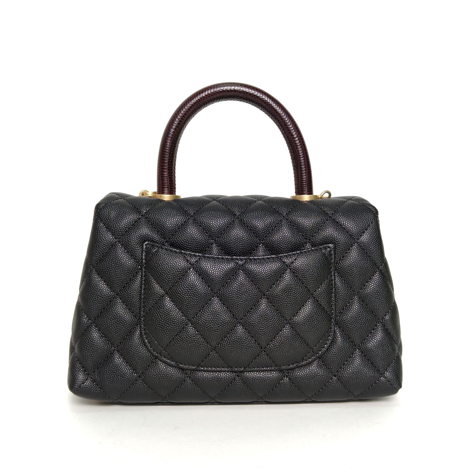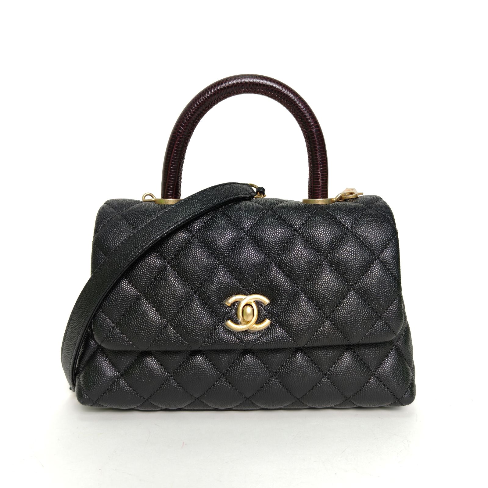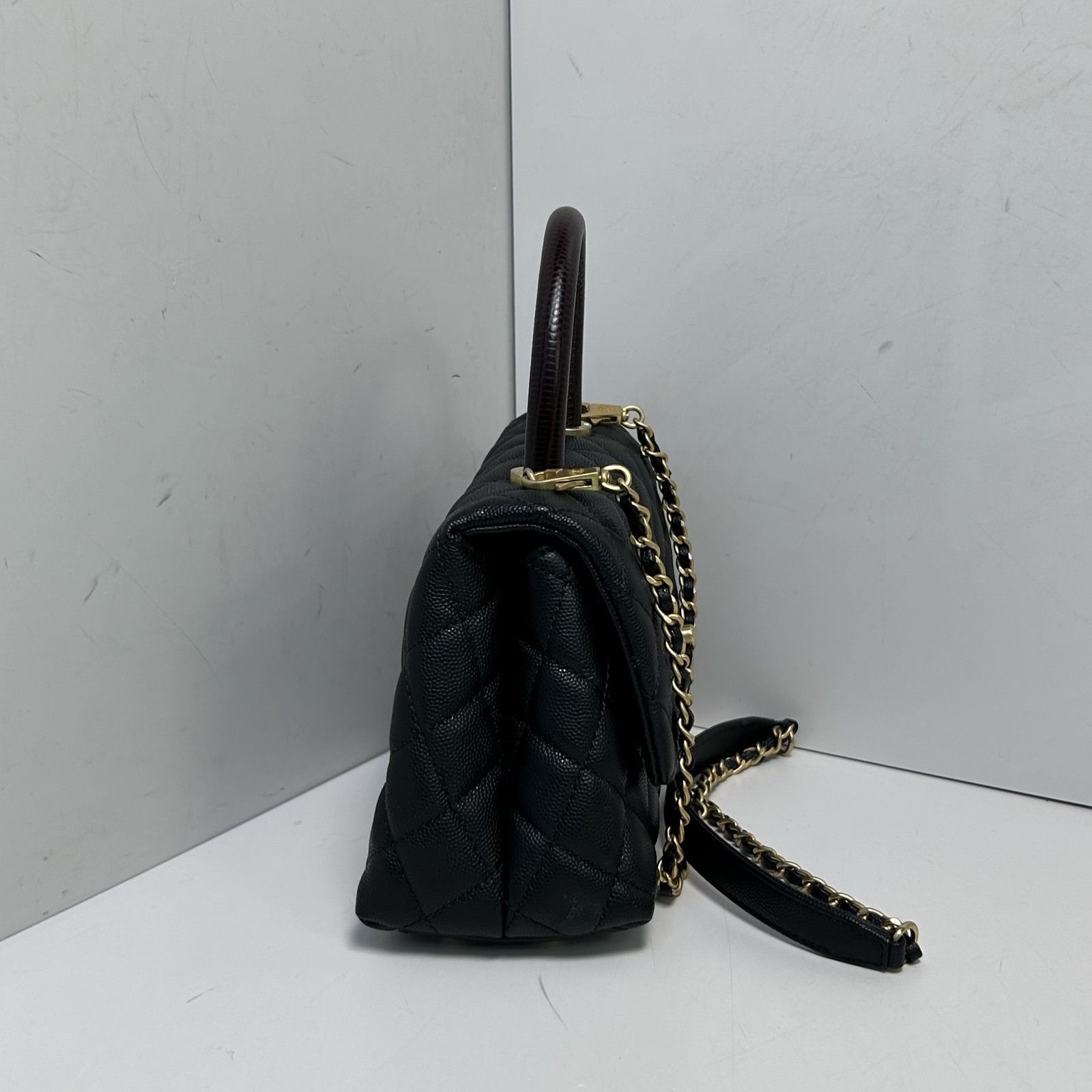 This Chanel Coco Handle small 24cm bag is crafted from black quilted leather with gold-tone hardware, featuring a lizard skin top handle and interlocking CC clasp.