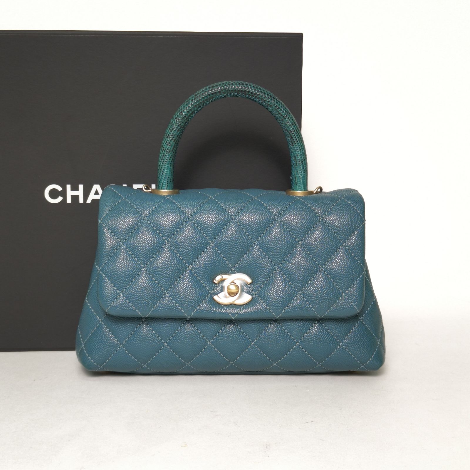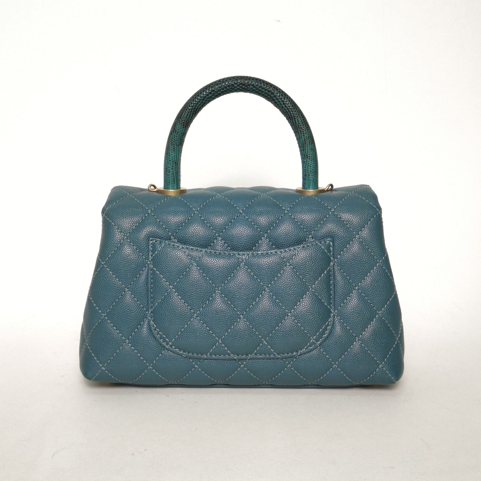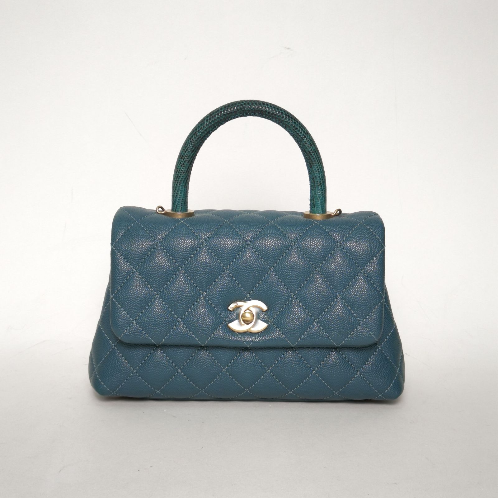 Crafted from green caviar leather with classic quilting and gold-tone CC hardware, this Coco Handle small 24cm bag features top handles and a detachable strap, a rare luxury collectible with lizard handle.