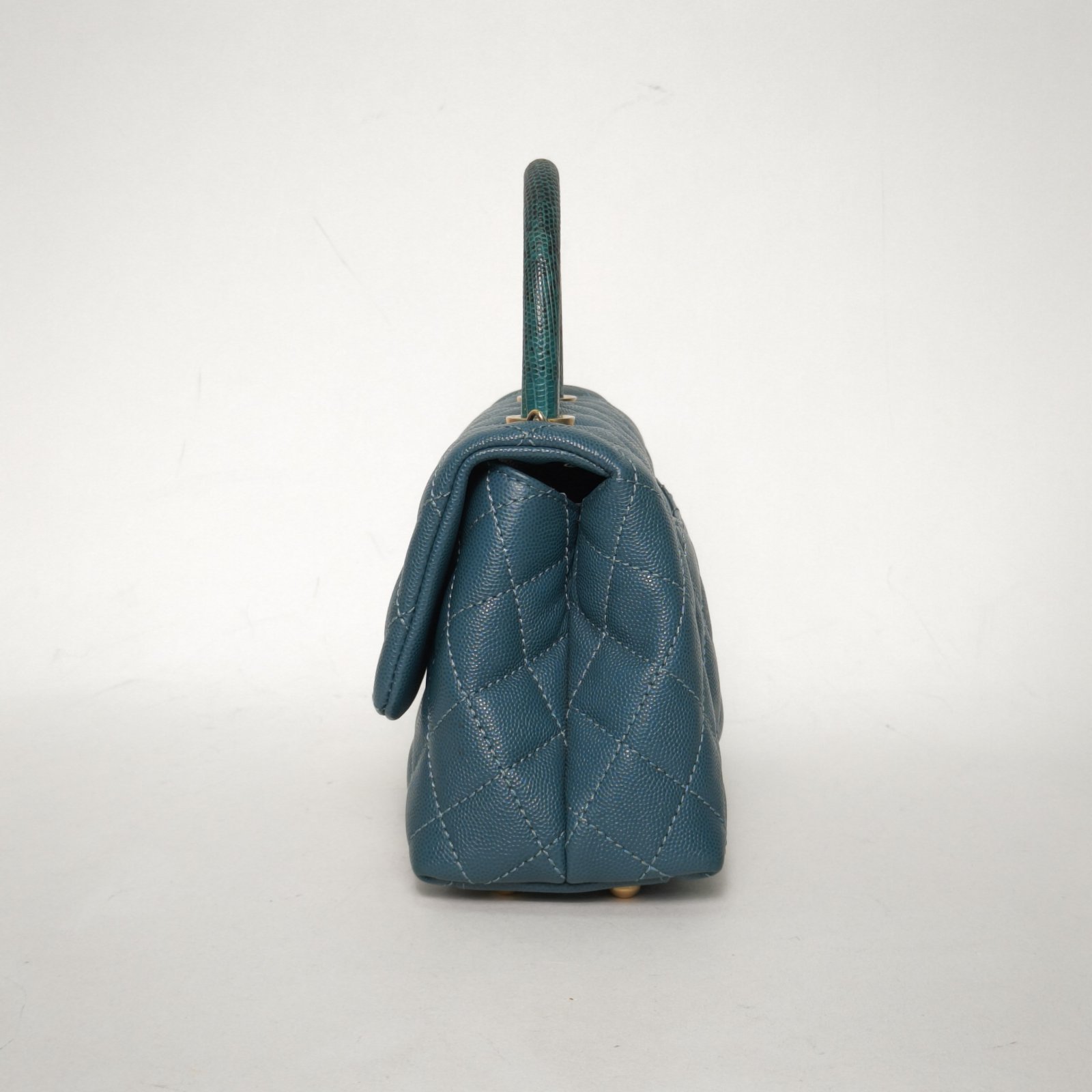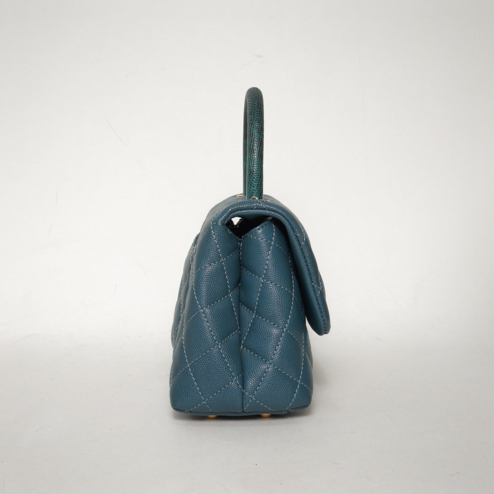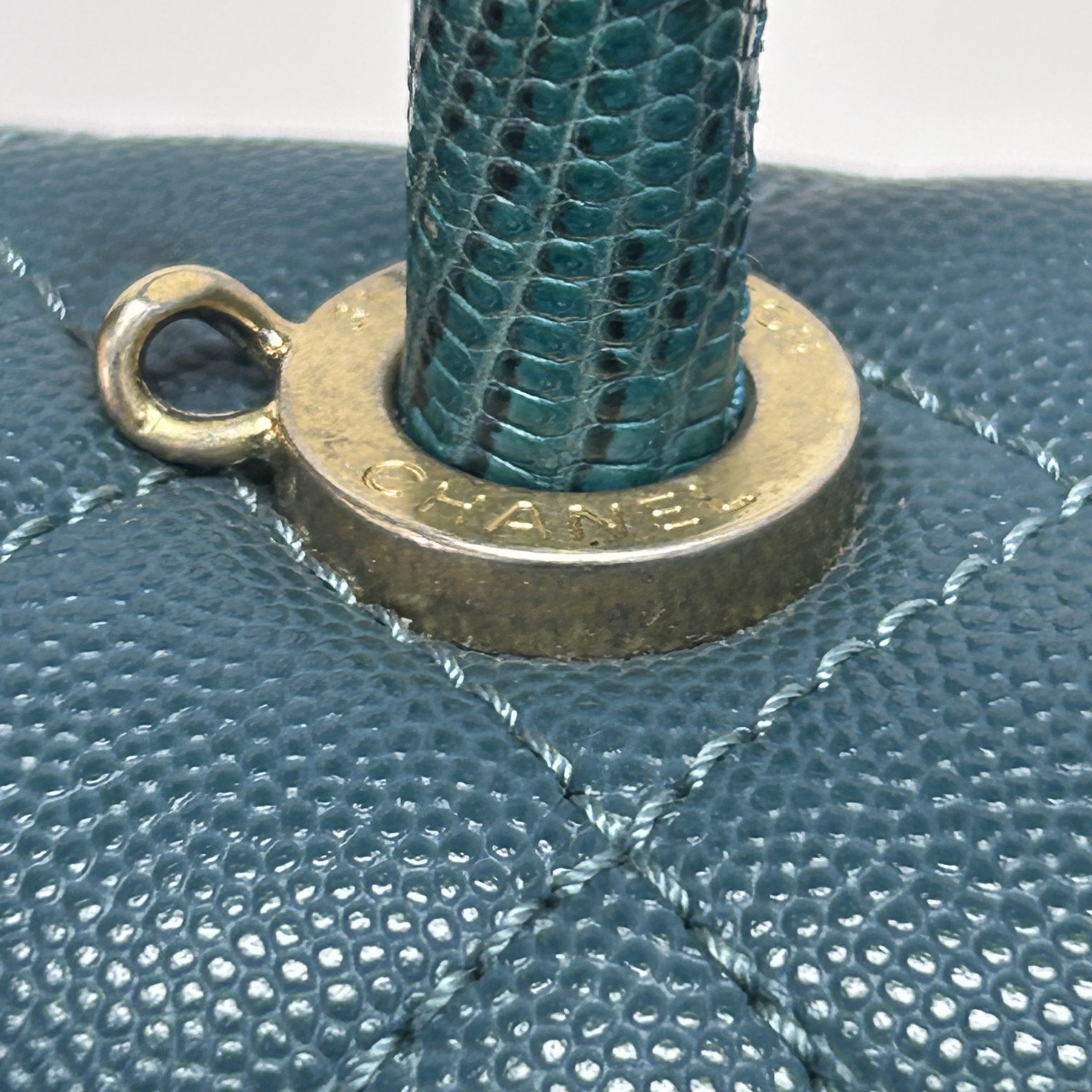 Crafted from green caviar leather with classic quilting and gold-tone CC hardware, this Coco Handle small 24cm bag features top handles and a detachable strap, a rare luxury collectible with lizard handle.