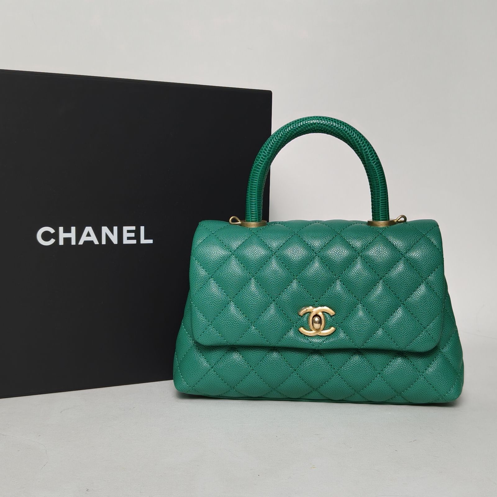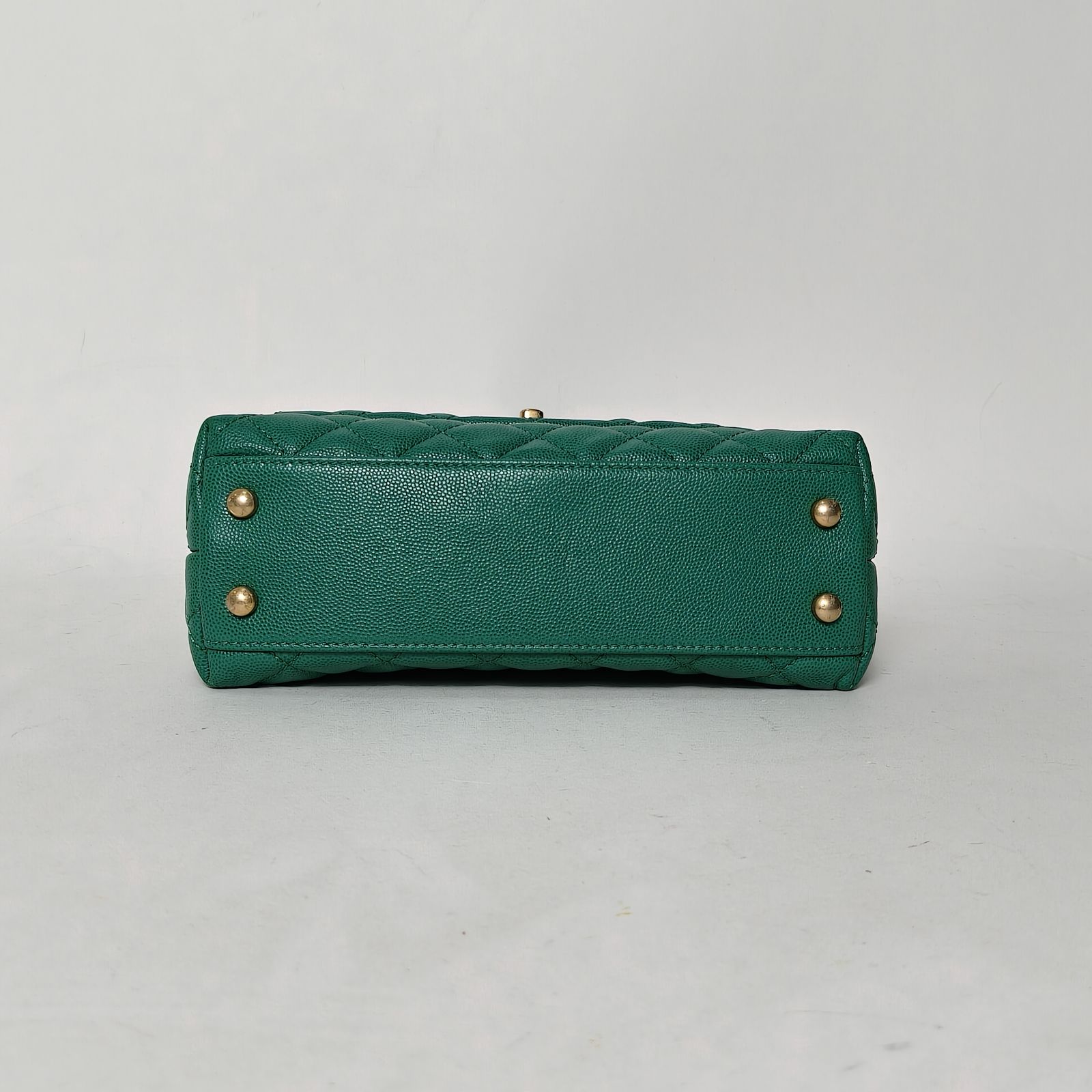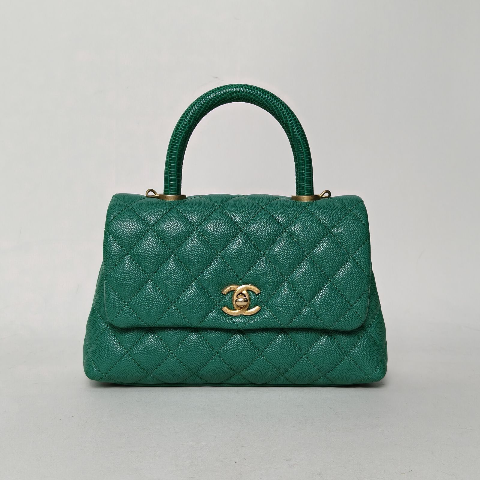 Crafted from green caviar leather with classic quilting and gold-tone CC hardware, this Coco Handle small 24cm bag features top handles and a detachable strap, a timeless daily luxury piece.