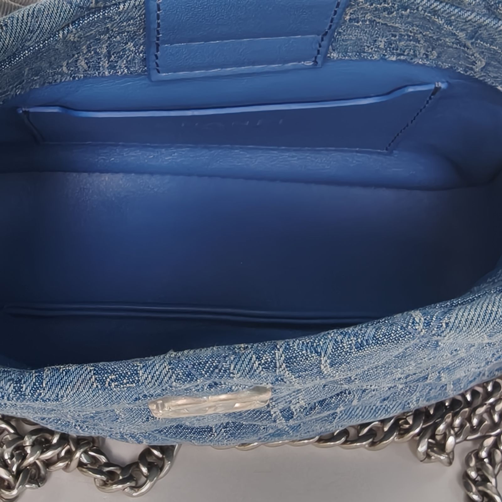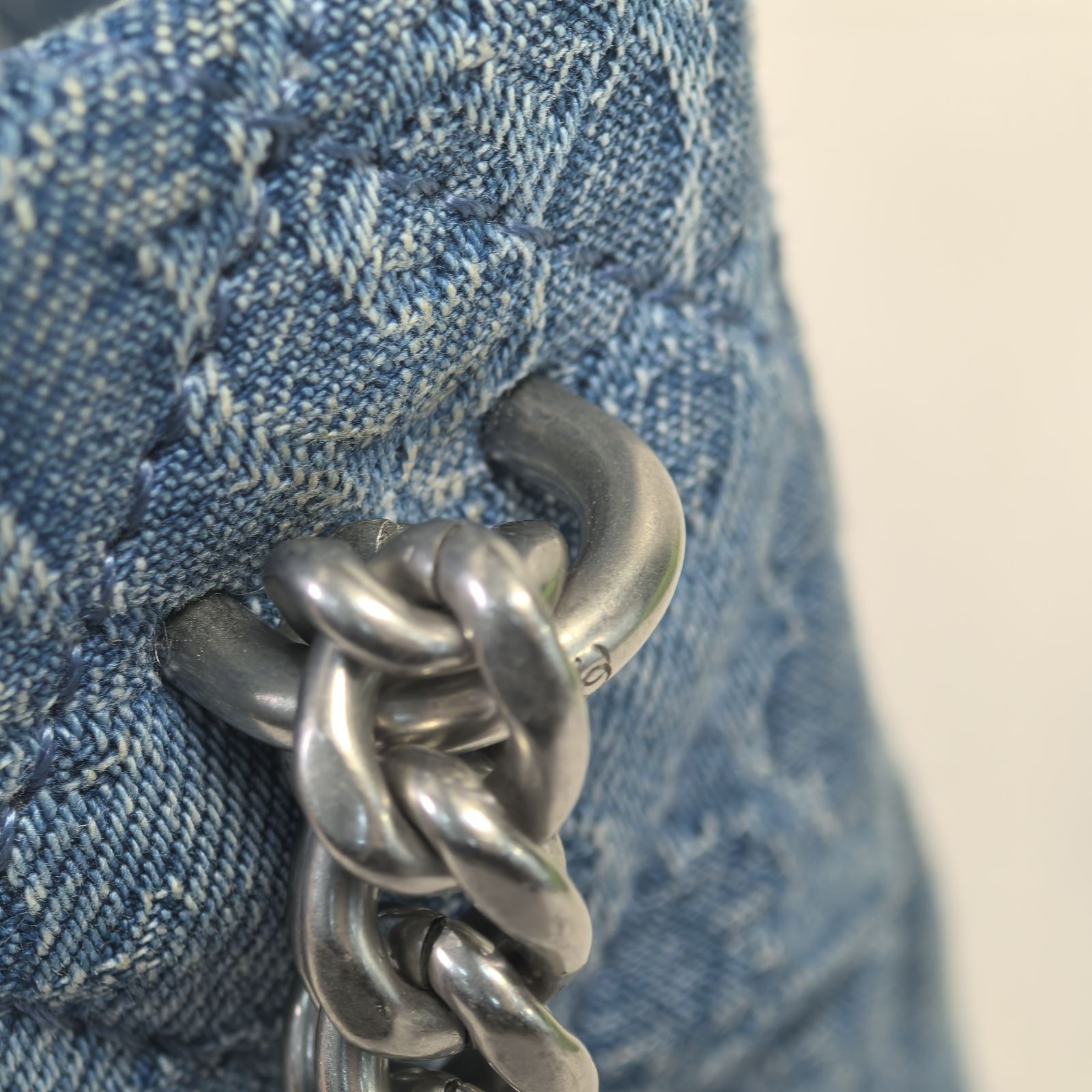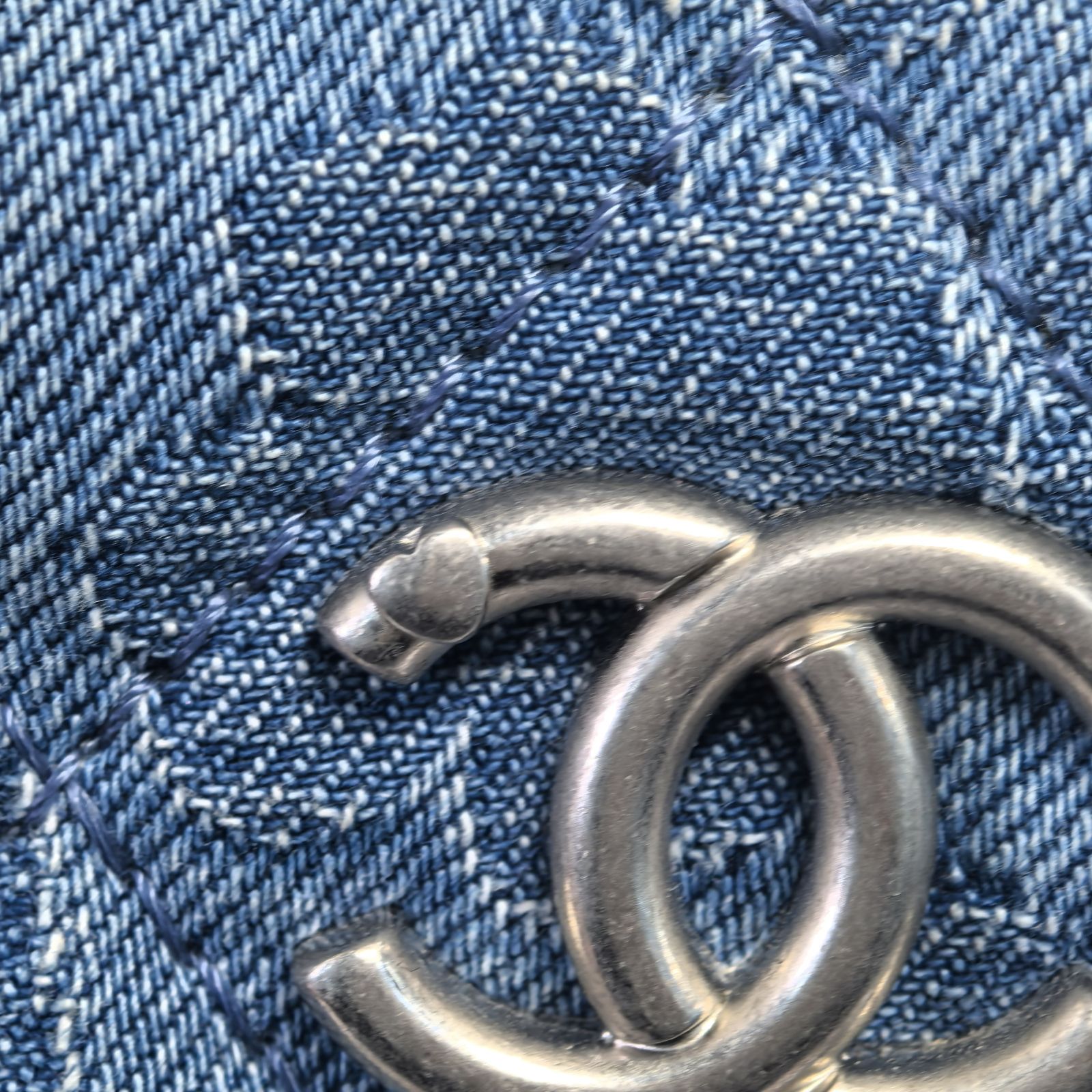 This CHANEL hobo bag is crafted from blue denim with a heart gold ball strap for a stylish look.