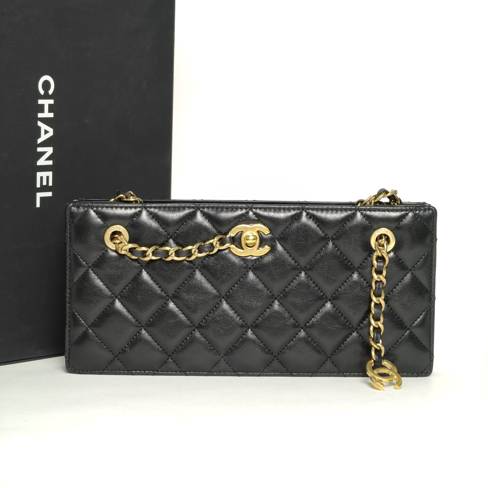 This Chanel East West long flap bag is made of black quilted leather with gold-tone hardware, featuring an elongated silhouette and double chain strap with logo pendant.